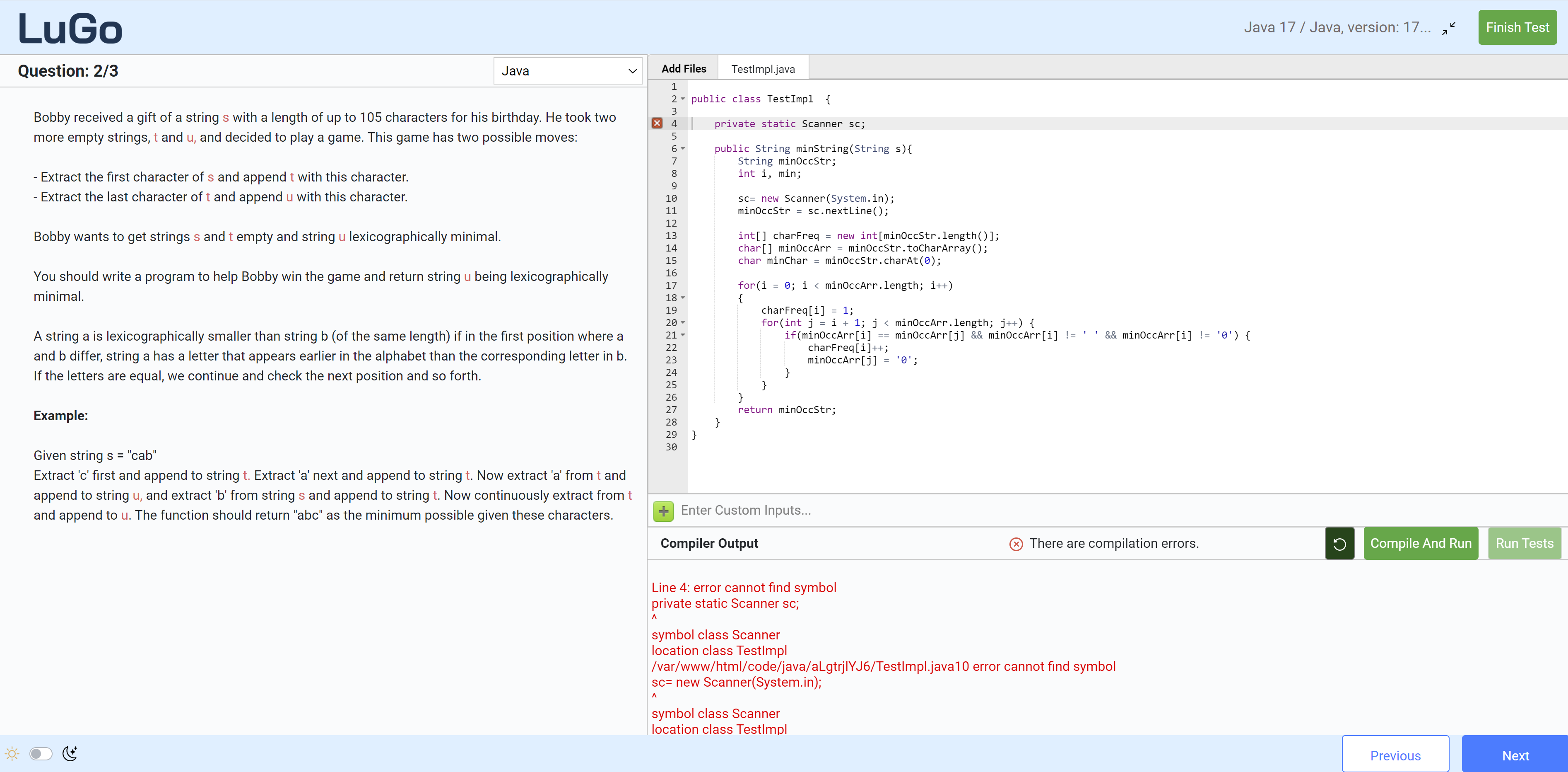 Human ResourcesLuGo-Test helps companies hire faster with online technical & coding tests, live coding sessions, and video interviews. Our platform screens candidates across all tech roles, reduces hiring time, and ensures effective, unbiased assessments.