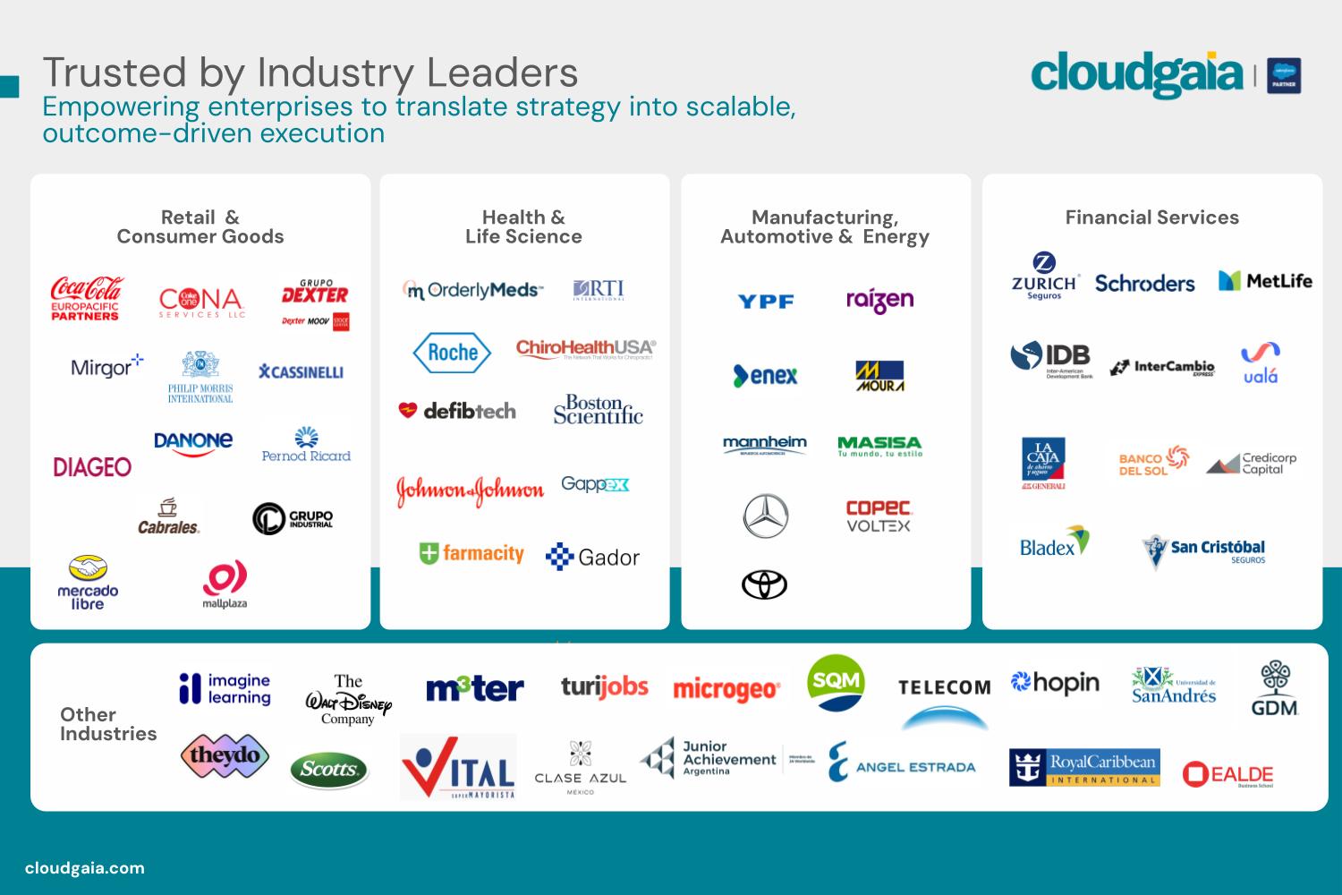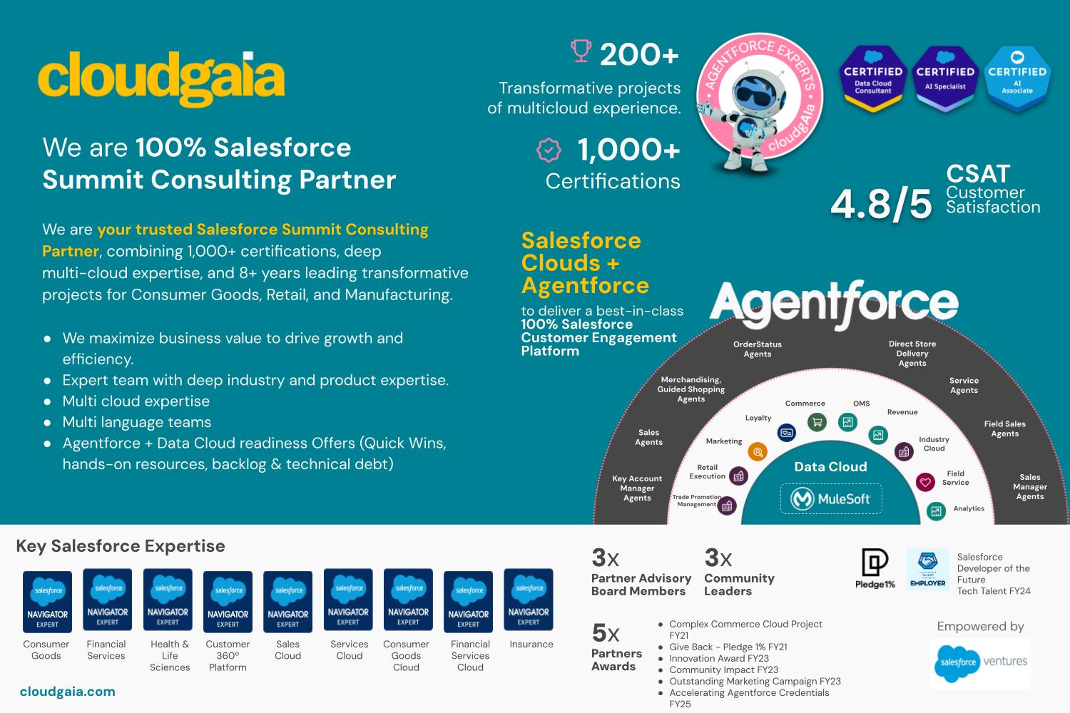 About Cloudgaia LLC We are a global consulting partner and 100% Salesforce Summit Partner with more than 15 years of experience.####We provide end-to-end Salesforce solutions, driven by Human + AI-powered innovation—from consulting and implementation to staff augmentation and ongoing support, ensuring seamless success for companies like Coca-Cola, Diageo, Schroders, Danone, Mercado Libre, The Walt Disney Company and countless SMEs####- One Team mindset – We integrate seamlessly with our clients, investing in their success as if it were our own.##- A global team of highly skilled experts – Driving faster value delivery with deep industry and technical expertise.##- Empowered by Salesforce Ventures – Backed by Salesforce’s investment arm, driving innovation at every step.####Salesforce Summit Partner##4.8/5 Customer Satisfaction Score##1000+ certifications | 150+ AI & Data Certifications##240+ experts around the world####United States, Argentina, Spain, United Kingdom, Colombia, Mexico, Brazil, Chile####We’re all-in for your growth