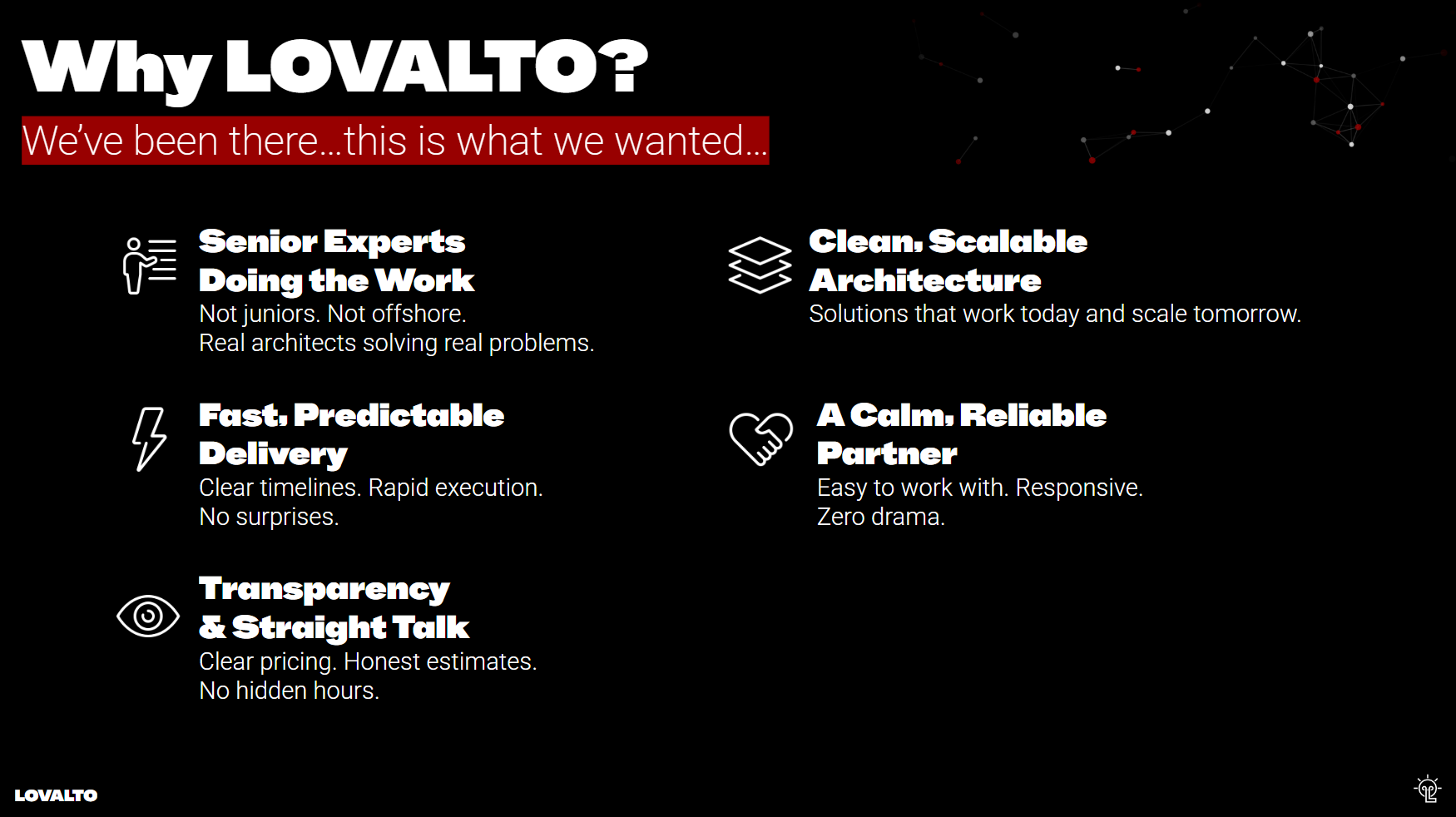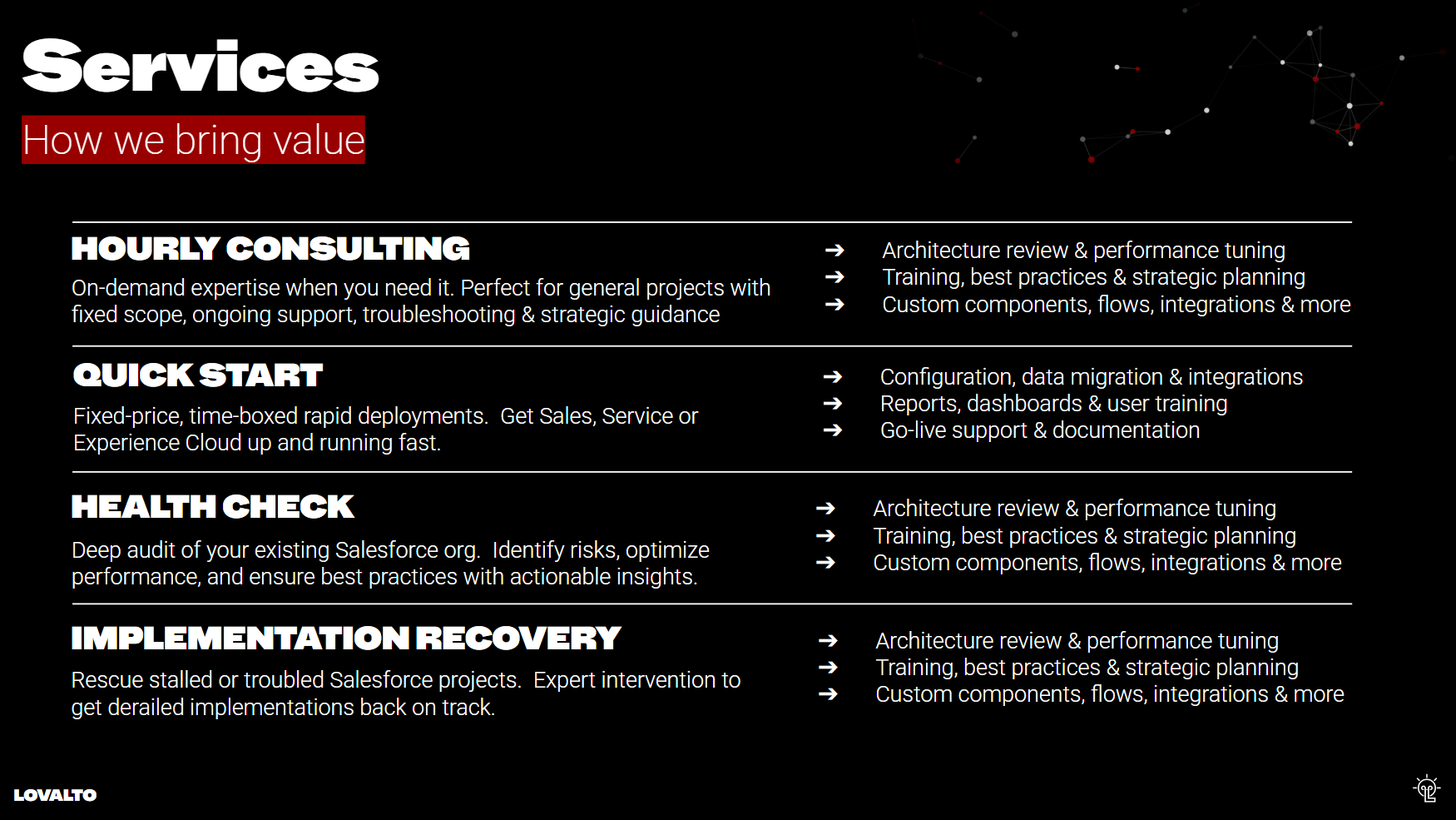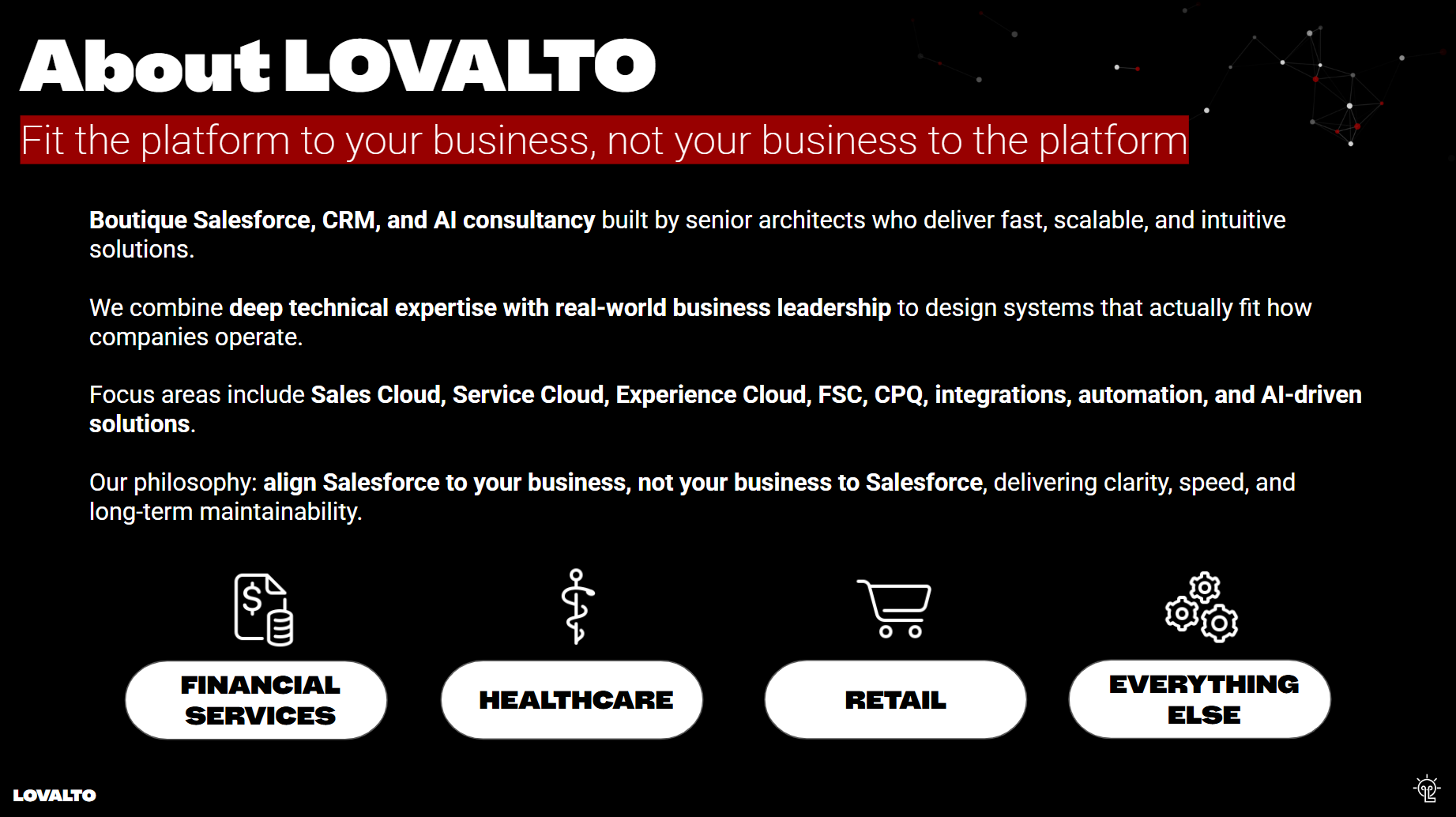 About LOVALTO LLC LOVALTO is a senior-led Salesforce and AI consulting partner built by seasoned architects who deliver outcomes that matter. We design scalable, intuitive Salesforce solutions that align with real-world business processes and drive measurable results.####We specialize in fast, predictable time-to-value through Quick-Start implementations, implementation recovery, and high-impact enhancements. From Sales and Service Cloud to Financial Services Cloud, Experience Cloud, and custom development, our approach keeps experts hands-on at every step so decisions are right the first time.####Our team has led operations, sales, and service organizations, which means we focus on the metrics that matter: efficiency gains, revenue growth, better customer experiences, and strong governance.####If you need a partner who moves quickly, communicates clearly, and builds with a long-term vision, LOVALTO is ready to help you unlock more value from Salesforce.
