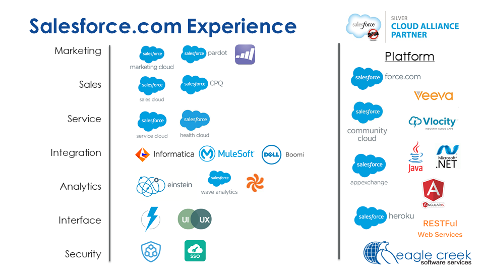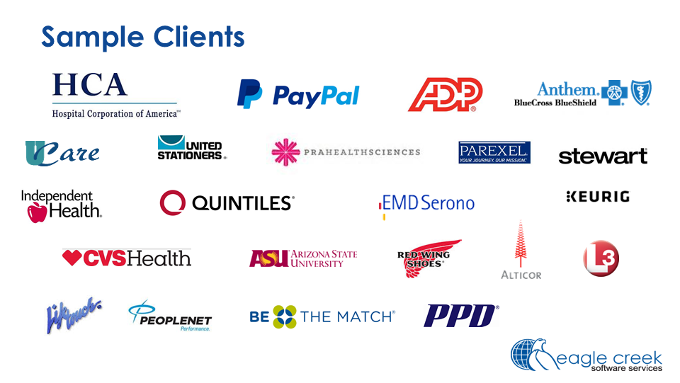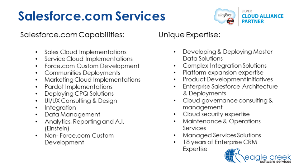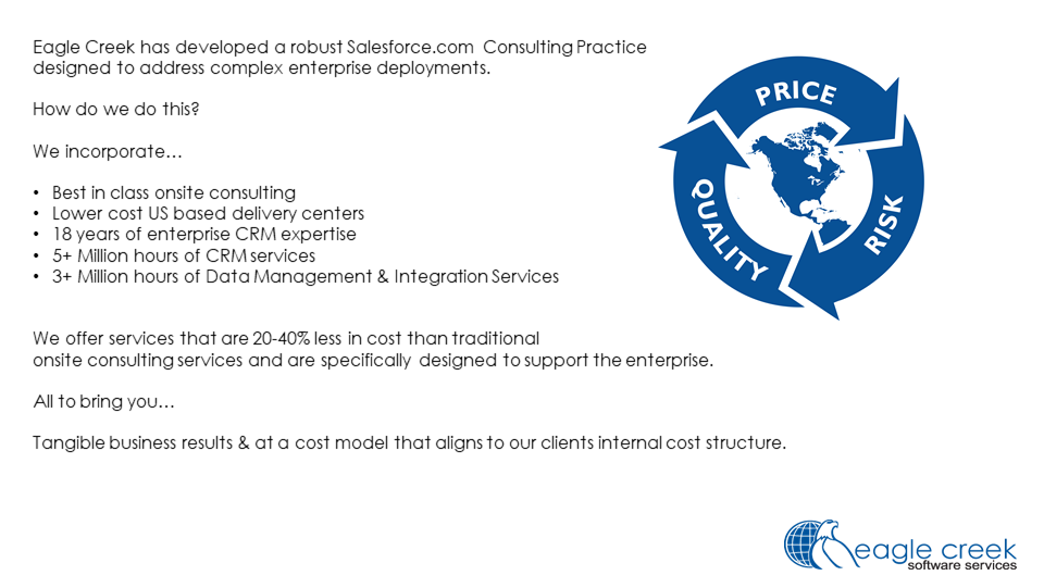 Eagle Creek was founded as a specialty CRM system integrator. We have successfully participated in many of the largest and most complex CRM implementations in North America. ####• 150+ of US-based (onshore) consultants dedicated to customer-facing technologies##• 5+ million hours of CRM related implementation and development experience##• Dedicated practice areas that include, CRM – Sales, Marketing, Service, Field Service,##• App Dev – Apex, Java, .Net##• Data Management – ETL, Data Integration, MDM, BI##• QA – Both Functional and Data QA####Our value proposition is simple – deliver the highest quality services at the lowest possible cost, while mitigating project risks. ####Our model fits best if you require the following:####• High Collaboration – Close collaboration between you and your users##• Affordable – We offer a price you can afford over multiple phases ##• Consistency – Average 93% retention rate##• Complexity – The more complex your needs the better suited we are. This includes:##o “Enterprise” level implementation approach (360-degree view of the customer)##o Front Office to Back Office Integration##o Large and complex data migration##o Sophisticated QA needs
