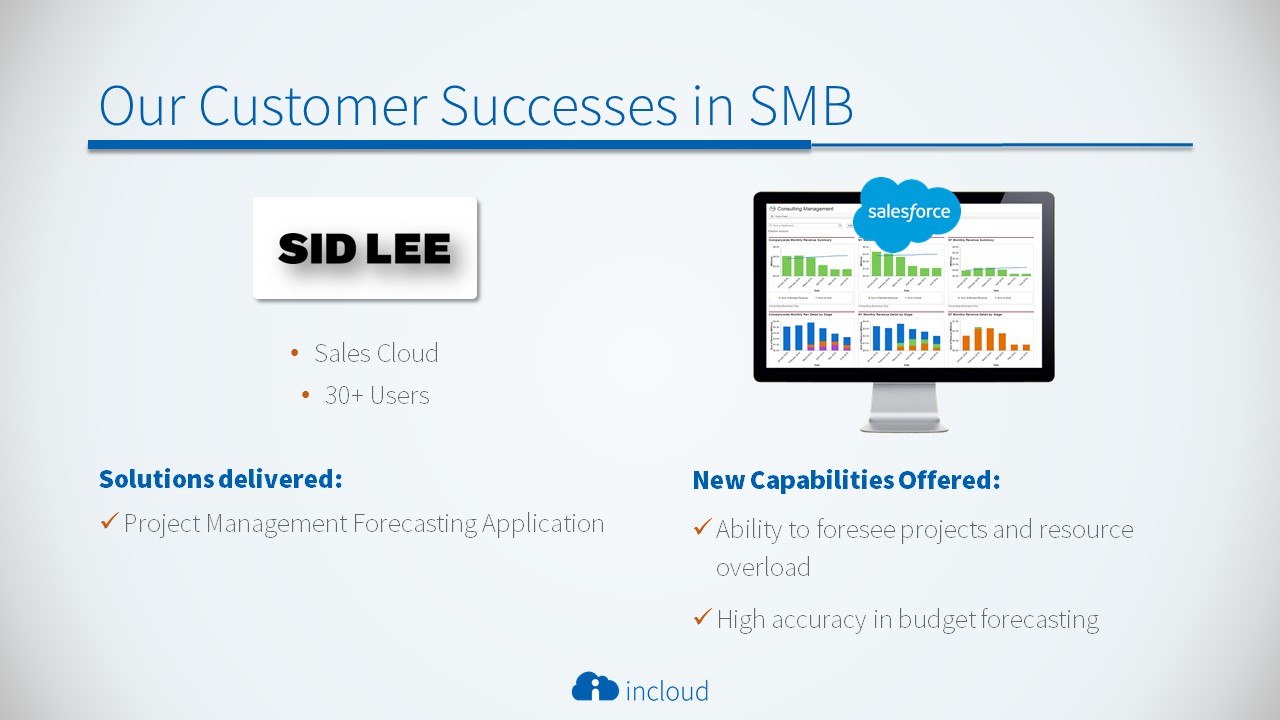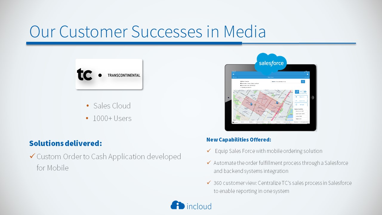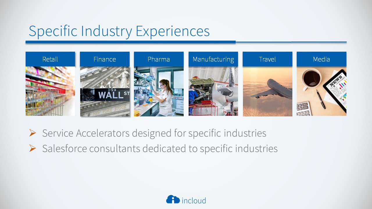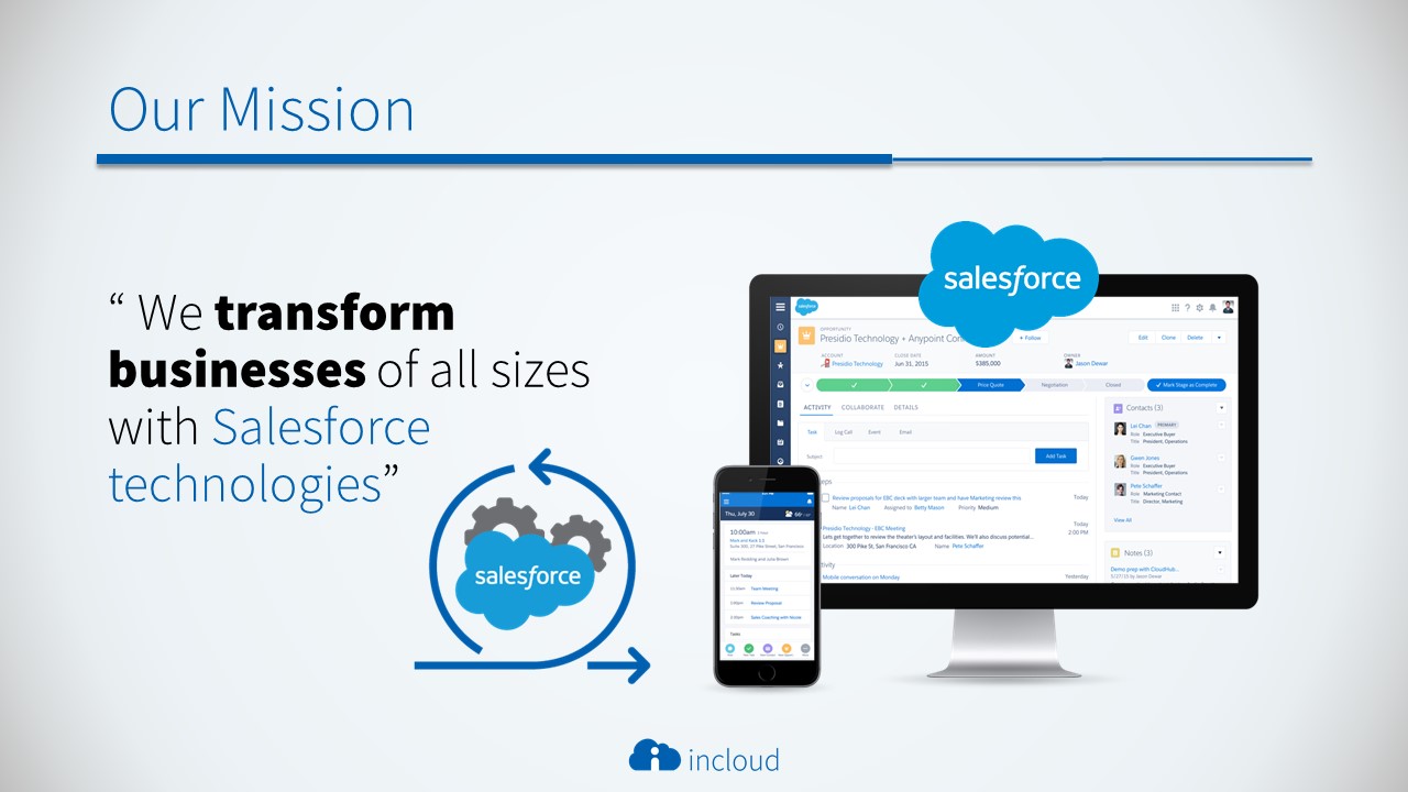 Business Transformation:##Incloud focuses on transforming organizations with Salesforce technologies to deliver business efficiency. Our consultants are experts in numerous industries and devoted to comprehending our customer’s most complex needs.