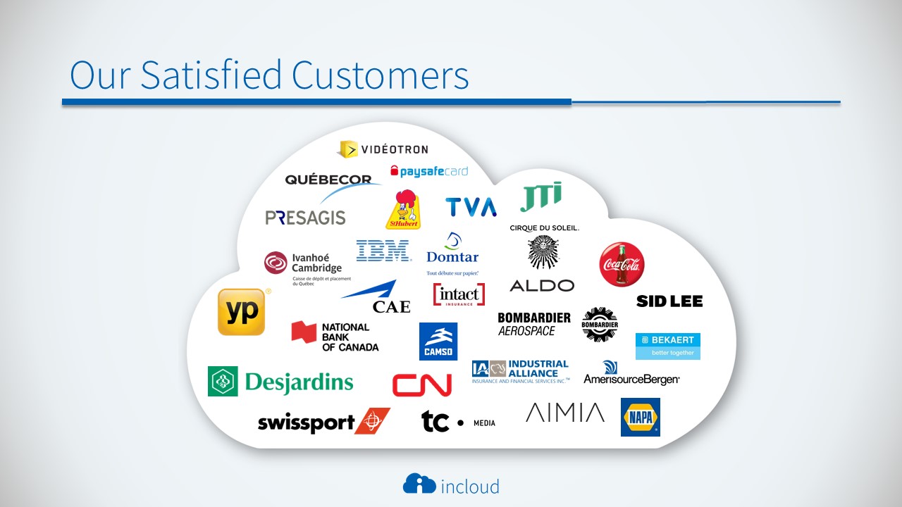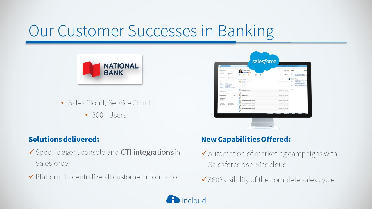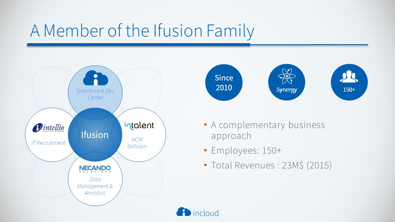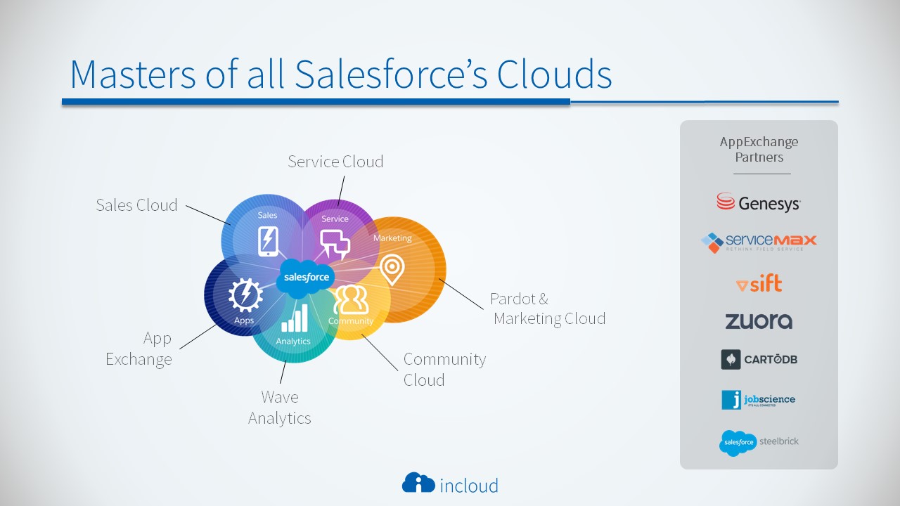 At Incloud, we believe that cloud technologies can improve the efficiency of any business organization. ####Our consultants are subject matter experts in various industries such as life science, retail, travel and media. The experiences they have accumulated always brings a distinctive added value to our customers.####Incloud provides you with the complete portfolio of business transformation consulting services: business strategy definition, technology implementation & integration, custom development, support and continuity. ####We are masters in all Salesforce platforms (Sales Cloud, Service Cloud, Marketing Cloud and Community Cloud) and have business line experts, who are always on the look out the latest Sales, and Marketing and Sales innovations.####As the Salesforce family keeps on growing, we make sure to always remain on top of the latest technologies and certifications:####-Sales Cloud##-Service Cloud##-Marketing Cloud##-Wave Analytics##-Desk.com##-Pardot##-Force.com##-Salesforce1##-Steelbrick##-Financial Force