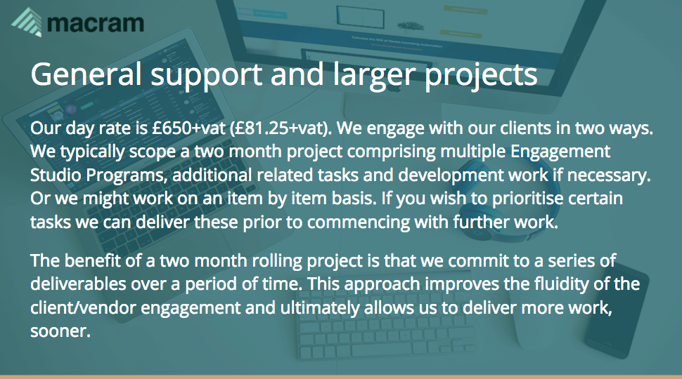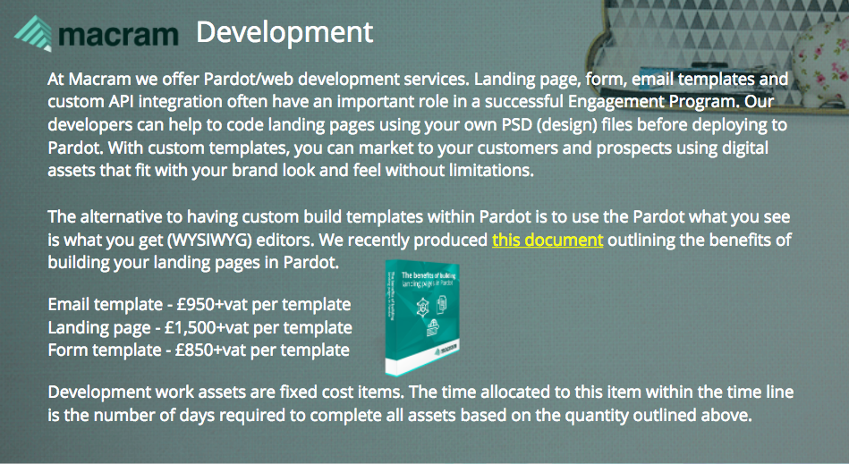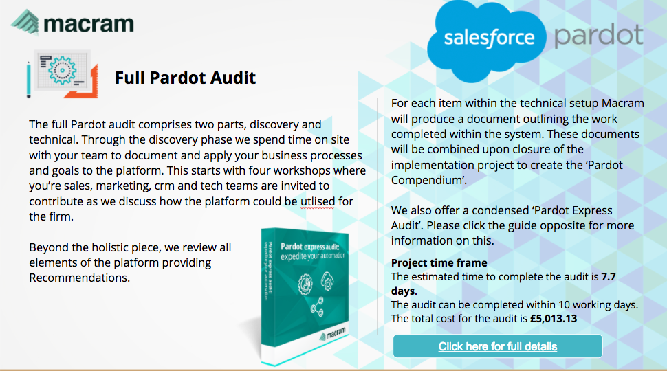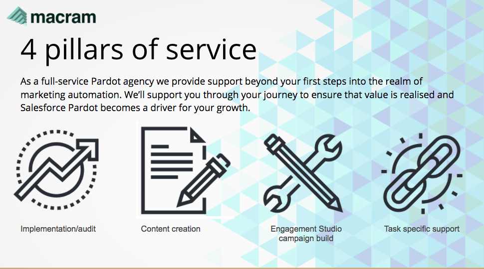 Macram is a full-service marketing automation agency specialising solely on the Pardot platform. Our core areas of business are: implementations/audits, Engagement Studio campaign build, training, content creation & development and adhoc support.