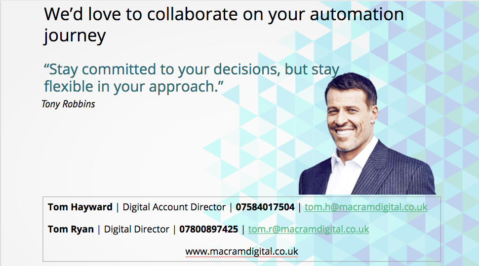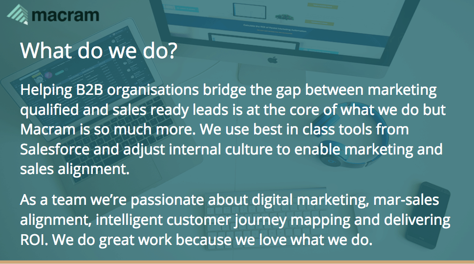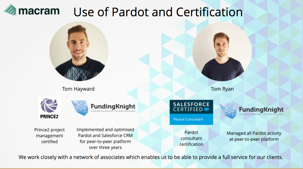 Macram was born out of a need for resource and expertise with marketing automation on the Pardot platform. Founded by 2 experienced marketers, Tom Hayward and Tom Ryan, we noticed that many businesses who purchased marketing automation software or were thinking about it, weren’t able to commit the resources required to fully utilise its functionality.####Since then, we've worked with clients to deploy Pardot, manage campaigns and produce engaging content that produces truly meaningful results. ####We know that an aligned marketing and sales department is essential for business success. Our methods cultivate this cultural shift by including both business functions. By mapping the customer journey and producing compelling content we can nurture the target audience from lead source to CRM. ####Our aim is to become the very best one-stop shop for all things related to the Pardot platform. Whether it's a new campaign you need help with, content created, help with understanding reports, prospect behaviour or anything else, we would love to hear from you.