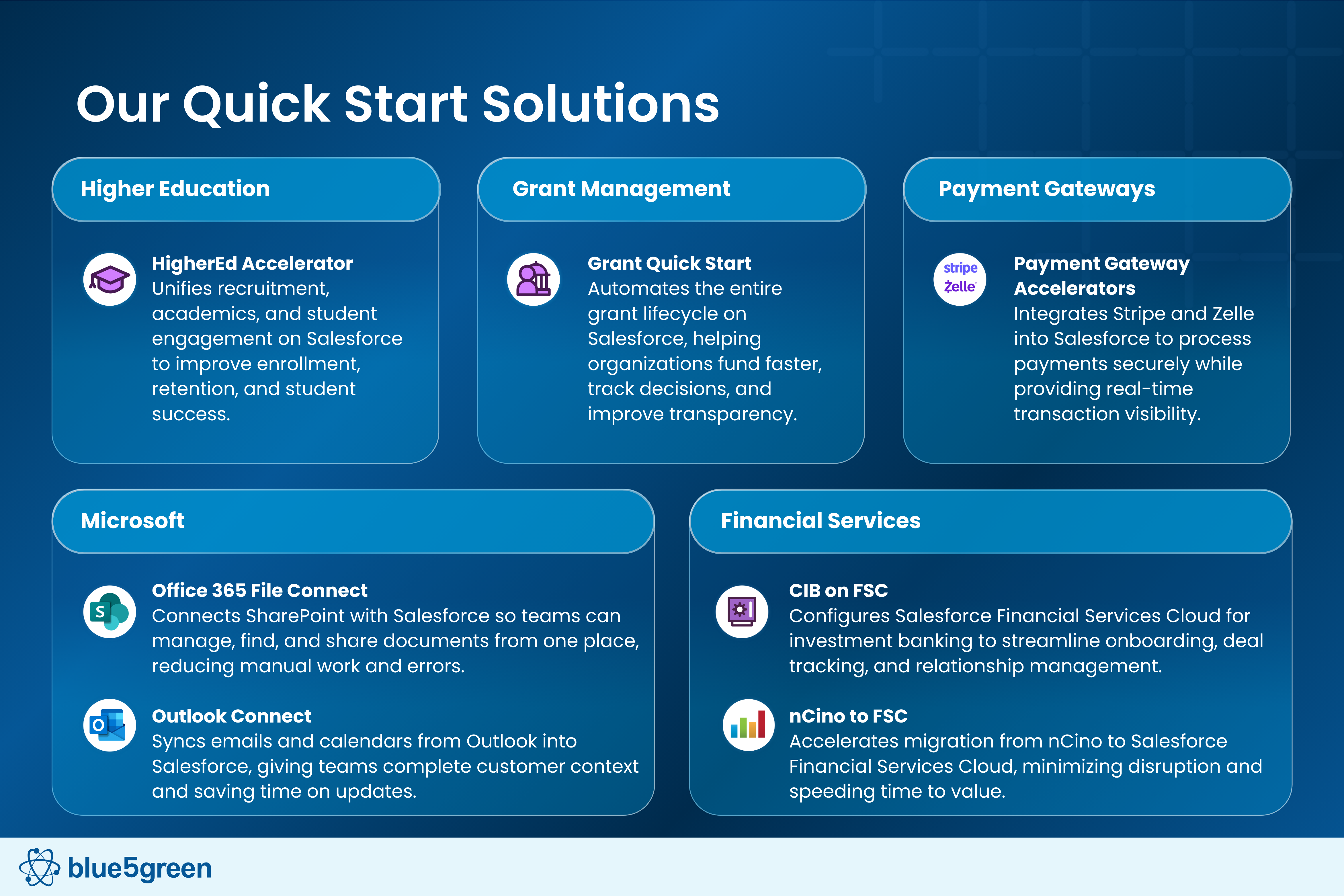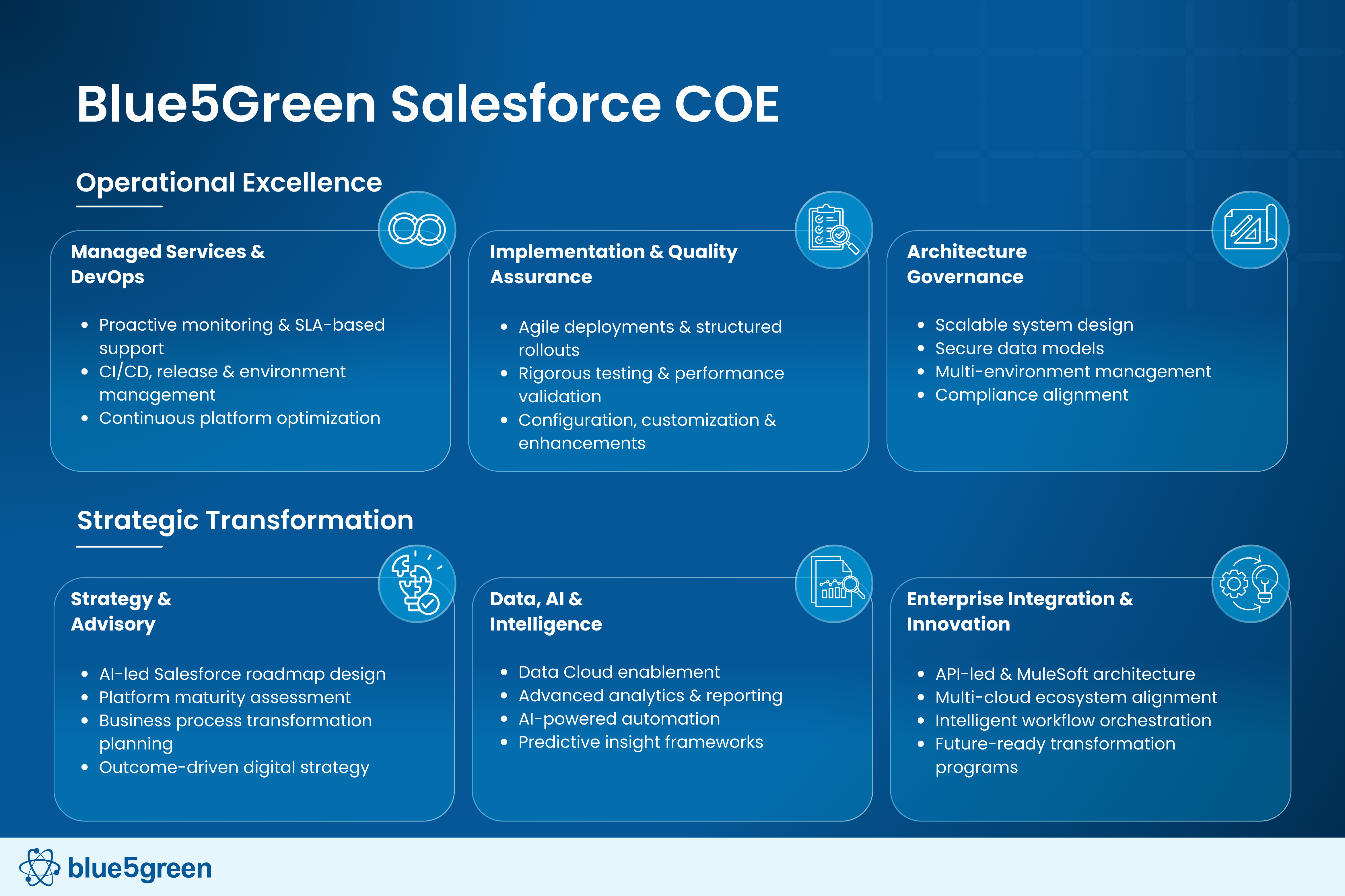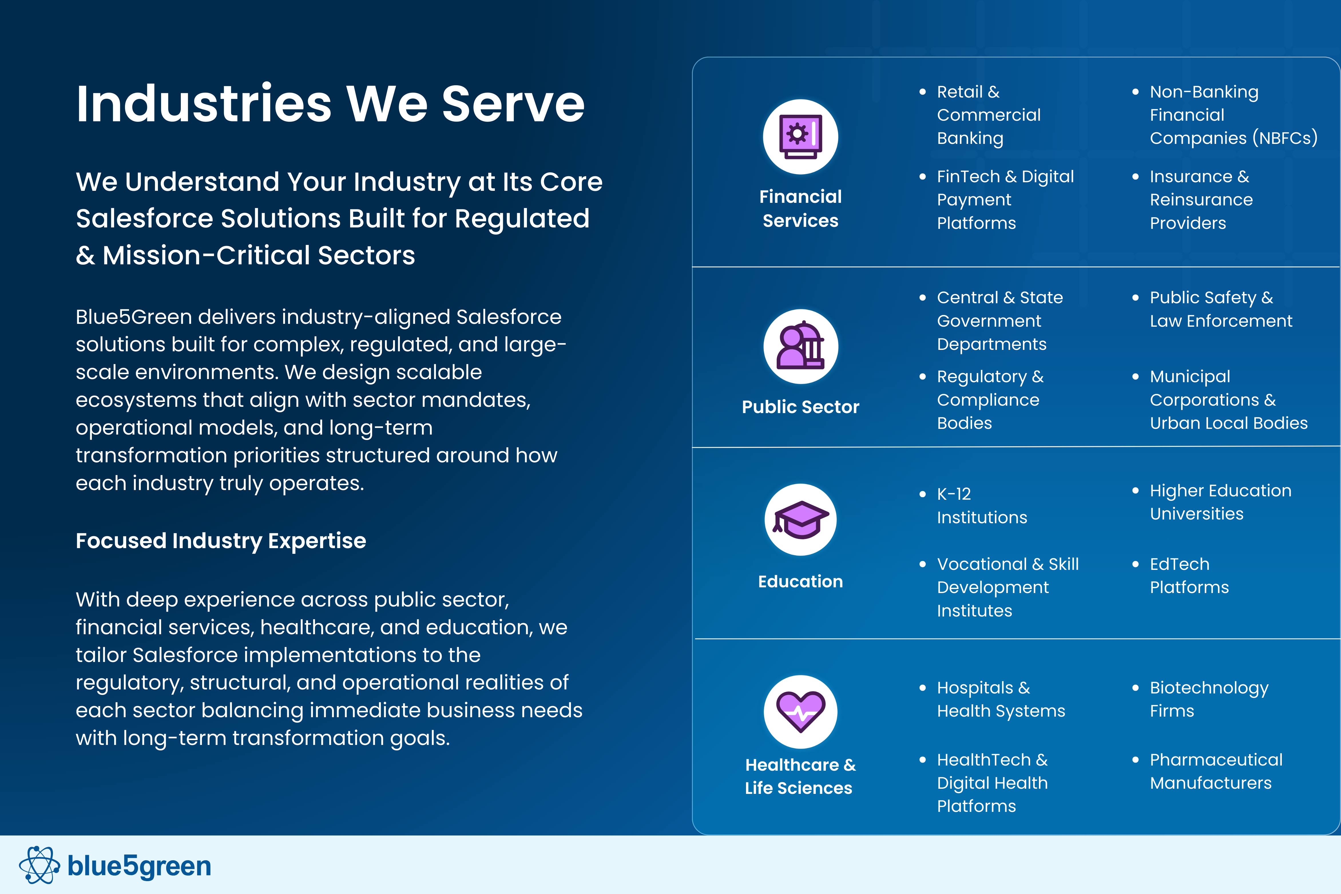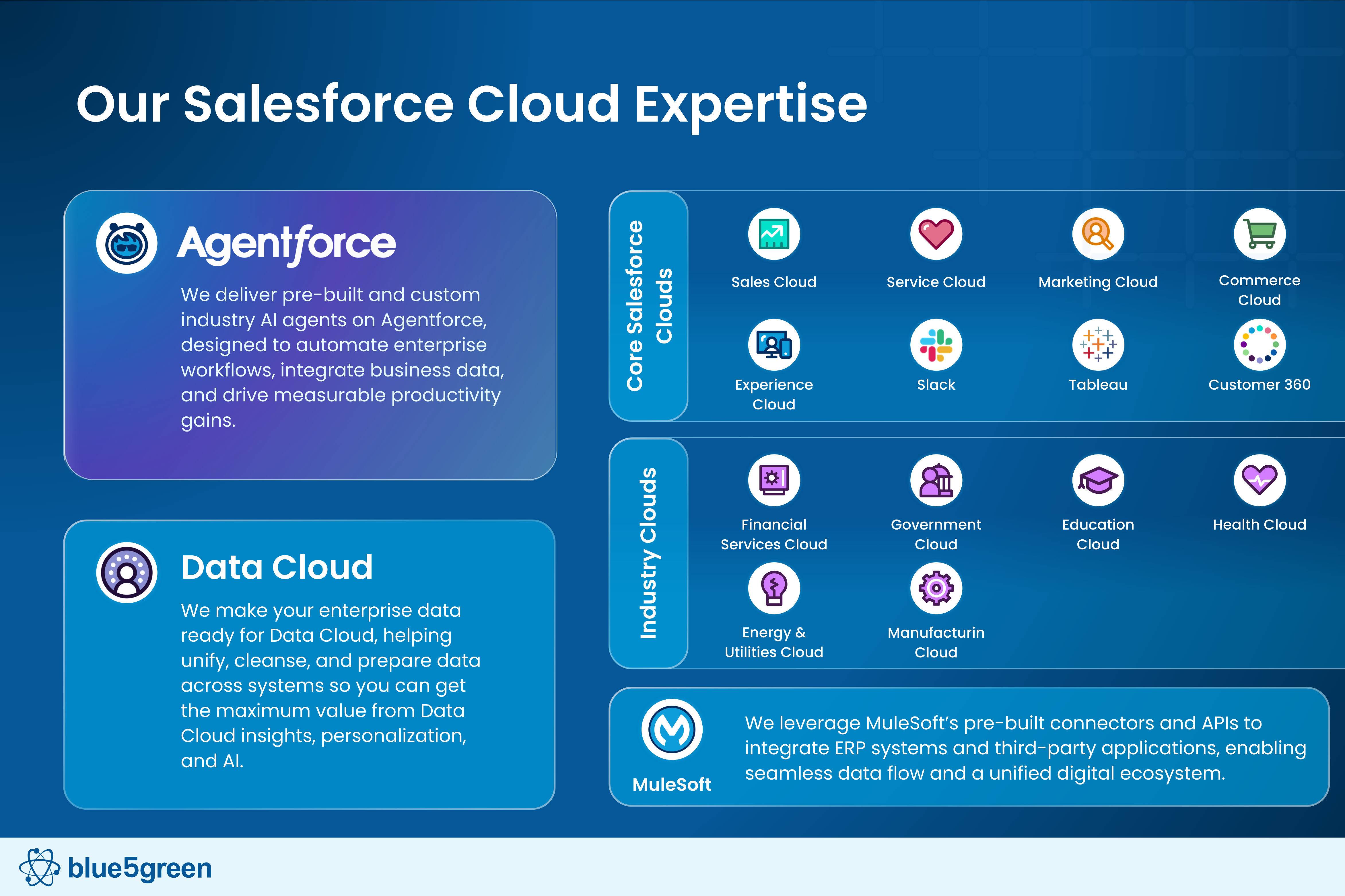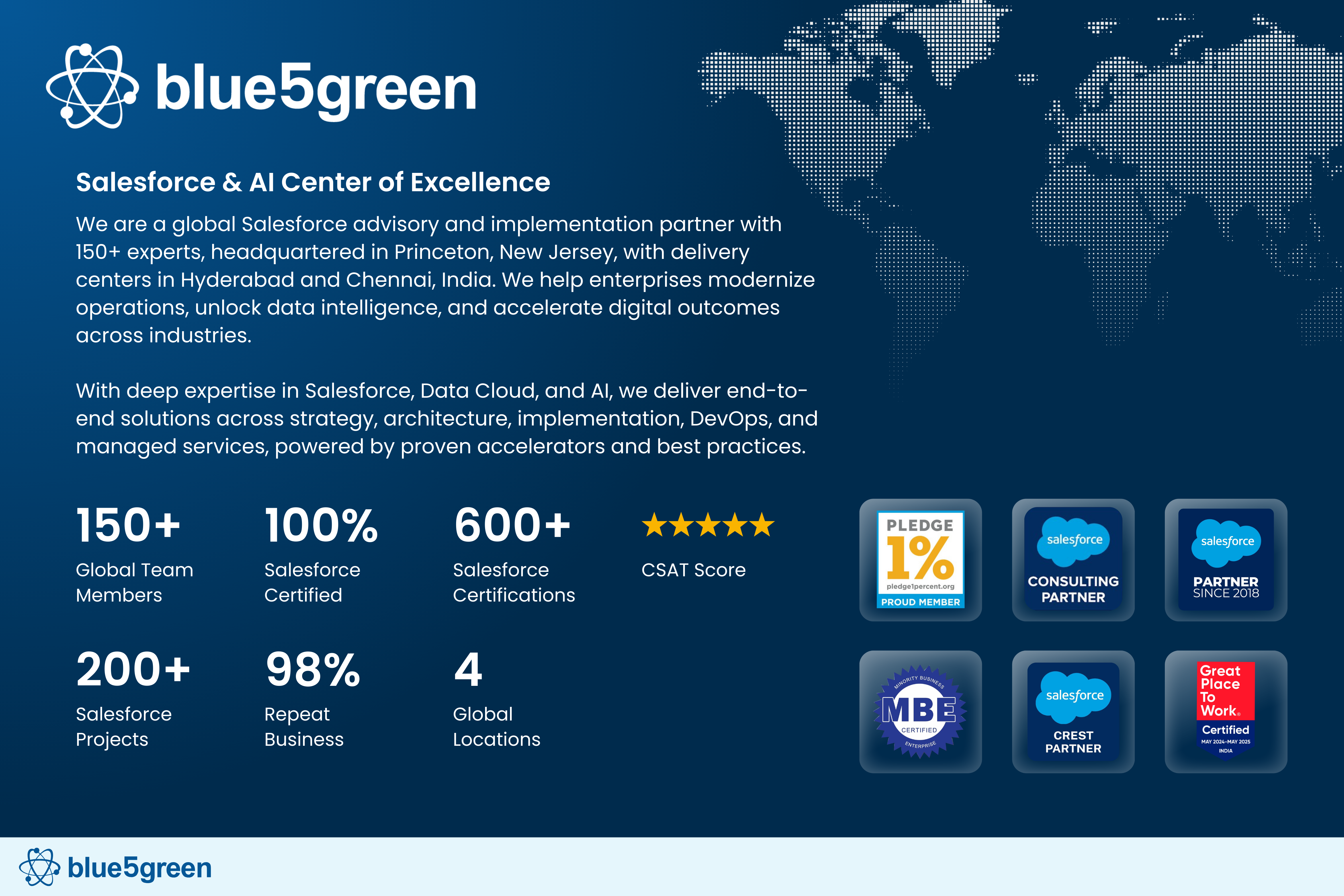 Blue5Green is a global Salesforce Crest Partner delivering Sales, Service, Marketing, Financial Services, Data Cloud, Agentforce and AI solutions across Financial Services, Healthcare, and Public Sector, driving secure, scalable enterprise transformation.