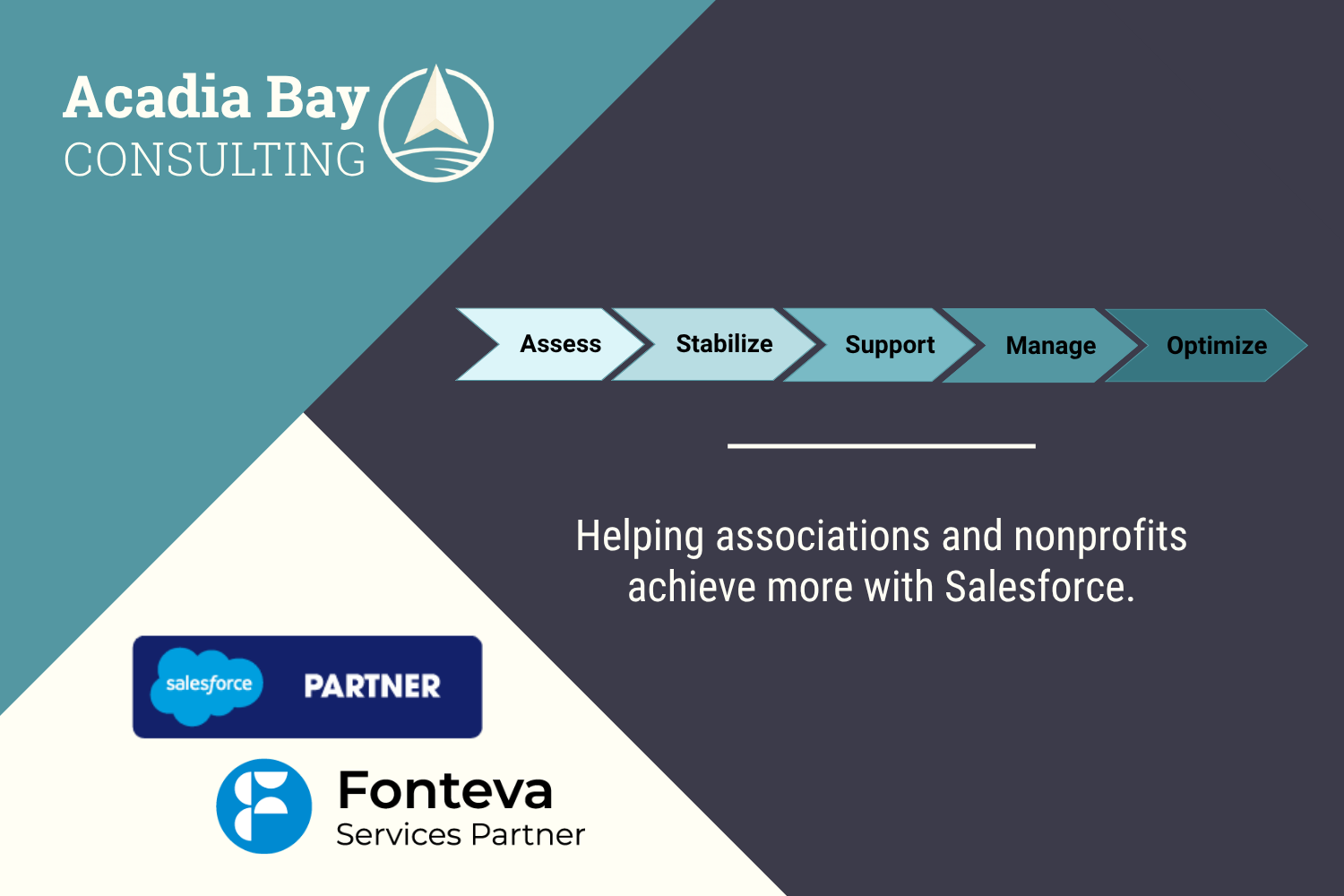 Acadia Bay helps associations and nonprofits get the most from Salesforce and AMS platforms. We specialize in stabilization, support, upgrades, and admin services, with certified consultants, fast response times, and a boutique, high-touch approach.