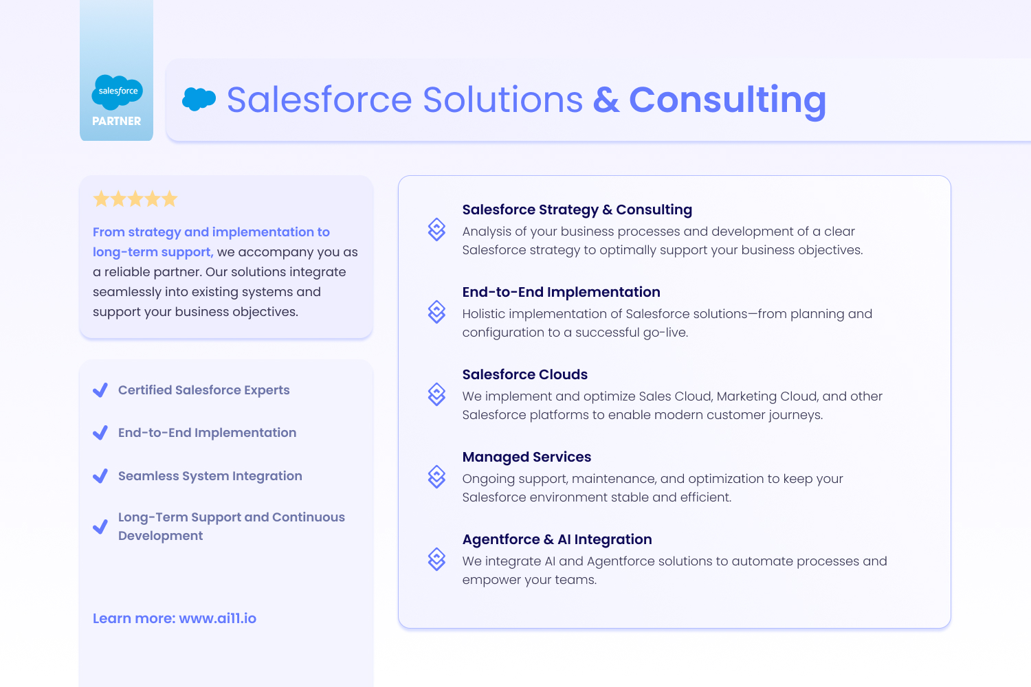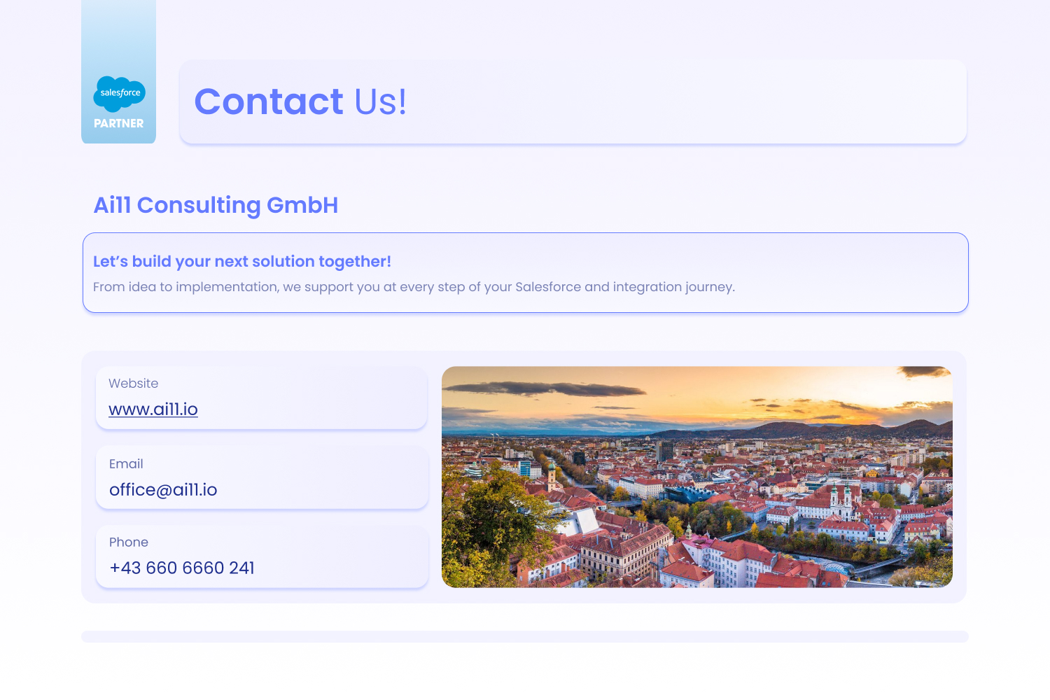About Ai11 Consulting GmbH We believe in continued growth and development for all, which is why as a Salesforce Consulting Partner, we strive to help businesses expand by optimising digital processes and customising solutions.####To ensure this process is seamless, our experienced team will ask the right questions, assess your business needs, provide effective solutions based on proven customer success, and then together execute the implementation.####The relationship with our clients is very important to us, that is why we always base it on trust, transparency, and open communication. We operate both locally in the Austria, Germany and Switzerland as well as internationally. ####Helping businesses to achieve and exceed their goals is at the heart of what we do, which makes us the ideal cloud strategy partner regardless of where you are in the world.####We offer the following key services:##· QuickStart Programs to get up and running on Salesforce in weeks##· Consulting and Implementation for Complex Multi-platform Environments##· Integrations to and from any Open Systems##· Force.com and Apex Application Development##· Post-Implementation Support Programs##· Consulting for API Strategy and MuleSoft Implementation