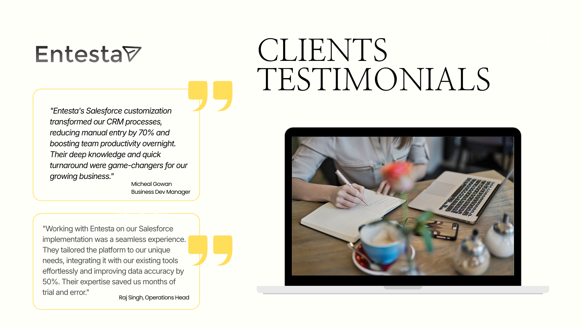 Entesta delivers deep Salesforce consulting, customization, and automation services built for businesses that want enterprise-grade outcomes at highly competitive rates.####Our team consists of experienced Salesforce professionals with strong expertise across Sales Cloud and Service Cloud, delivering scalable, secure, and upgrade-safe Salesforce solutions.####We specialize in end-to-end Salesforce services, including process consulting, workflow optimization, custom development, and seamless integrations with cloud-based platforms and third-party systems.####Entesta works closely with clients from discovery to implementation and ongoing support, ensuring Salesforce aligns perfectly with real business processes and growth goals.####With capabilities comparable to global consulting firms such as TCS, IBM, Deloitte, Accenture, and Cognizant, Entesta offers the same depth of process and technology expertise with faster execution and better cost efficiency.