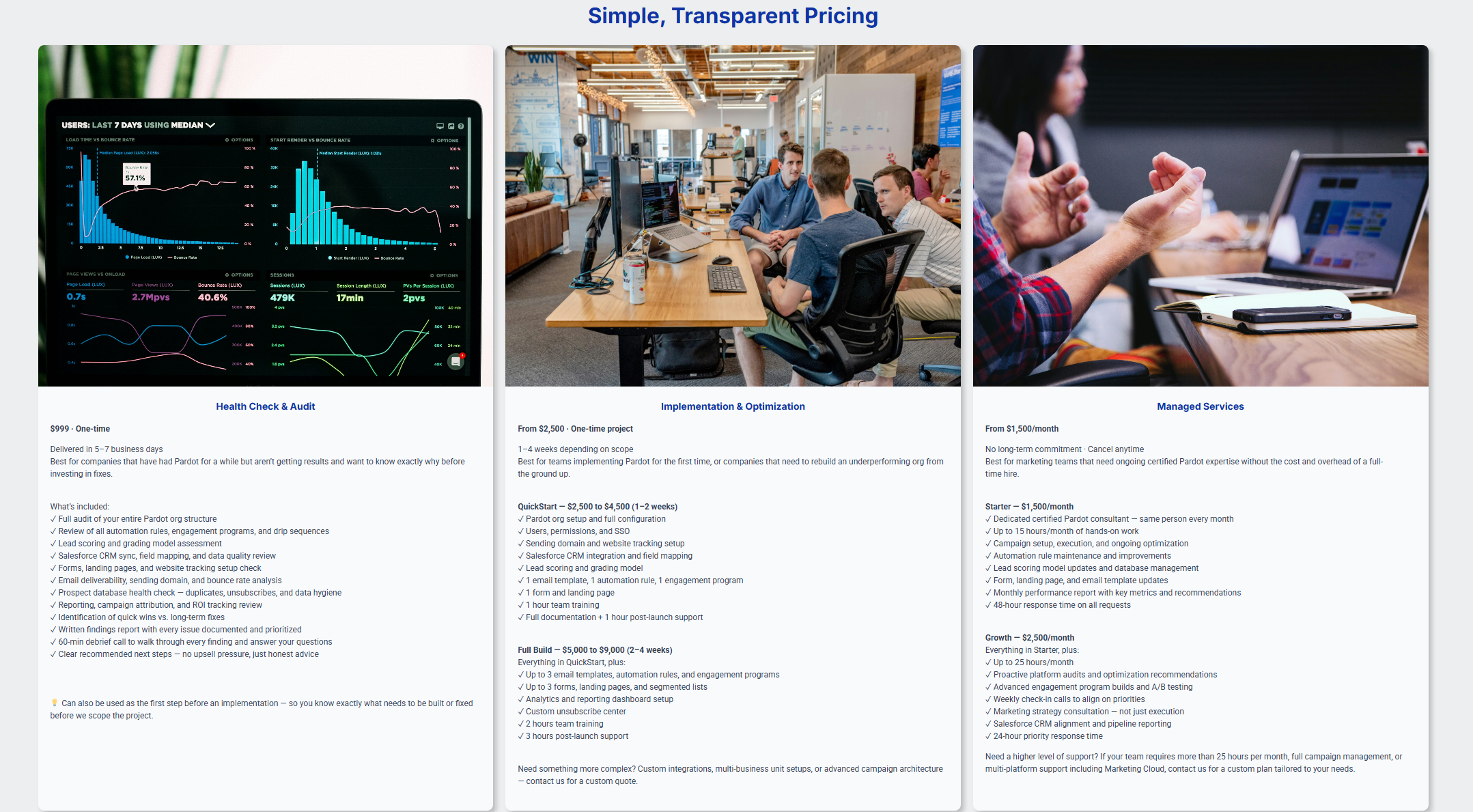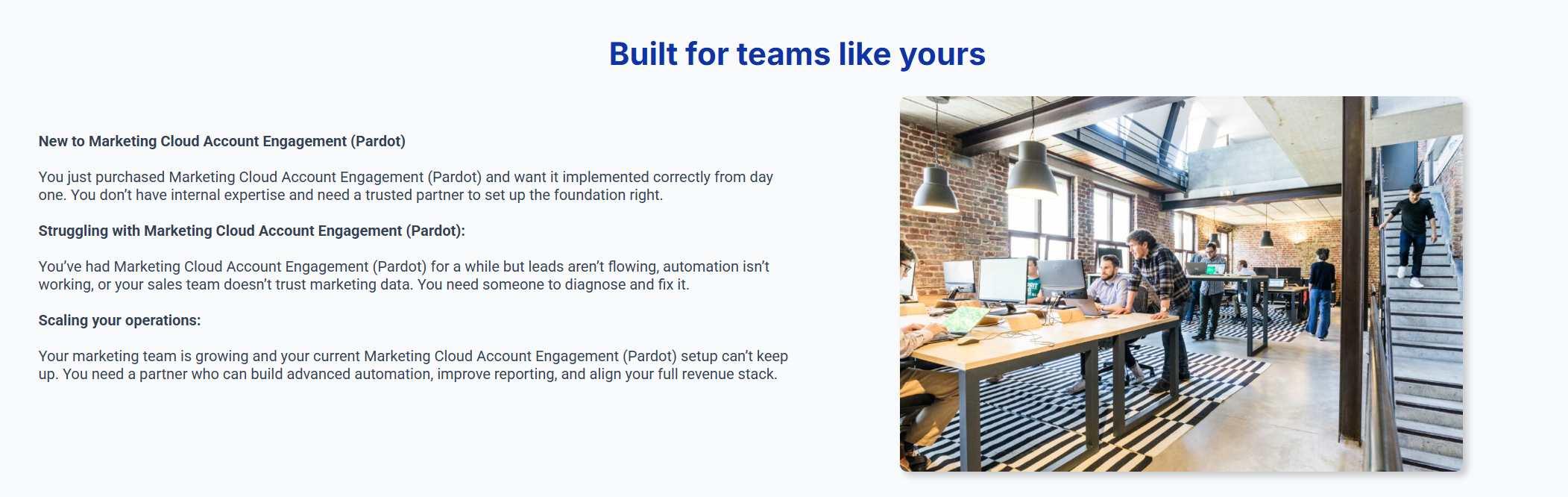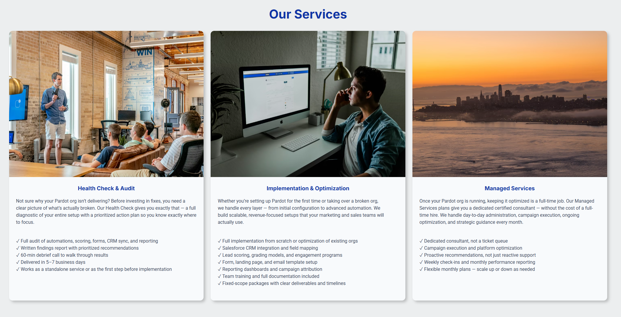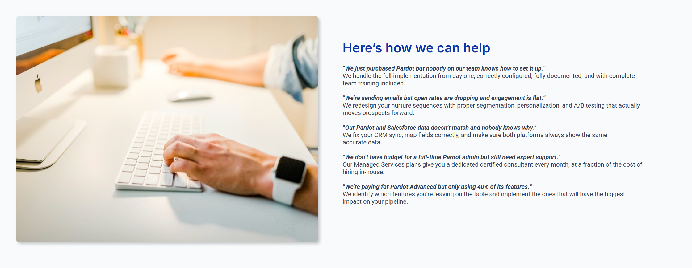 Certified Marketing Cloud Account Engagement (Pardot) and Marketing Cloud consulting agency. We implement, optimize, and manage Salesforce marketing automation for companies at every stage, from first setup to full optimization.