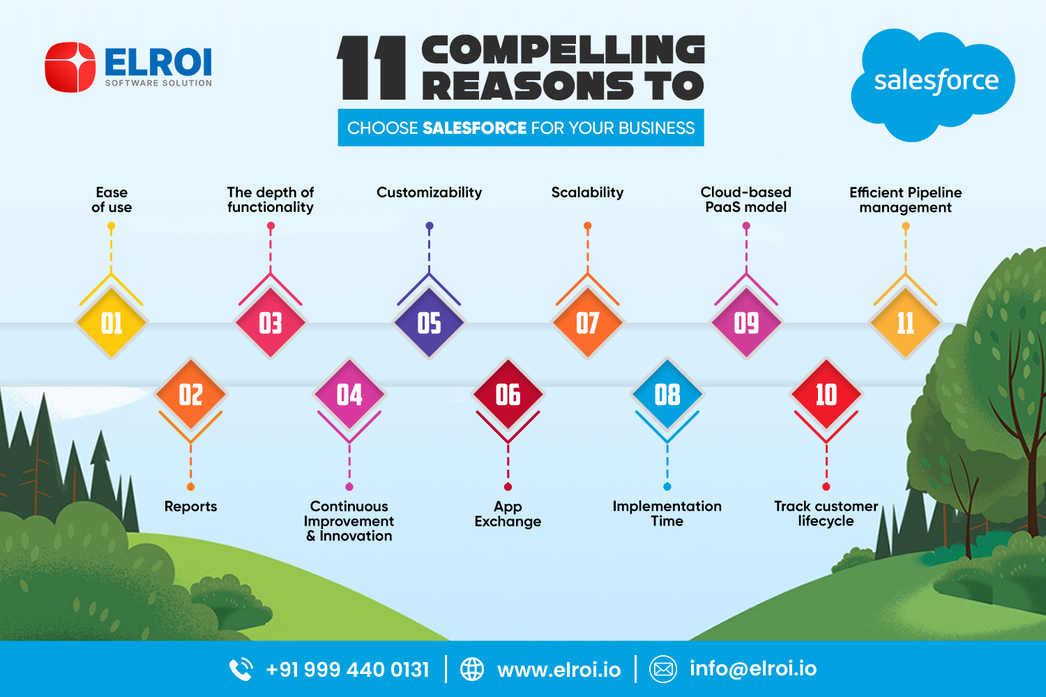 Our extensive work experience across Salesforce products includes Salesforce Customer 360, Sales Cloud, Service Cloud, Commerce Cloud, Experience Cloud, Marketing Cloud, Einstein Analytics Cloud, CPQ, Field Service Lightning, and Salesforce Mobile Apps.