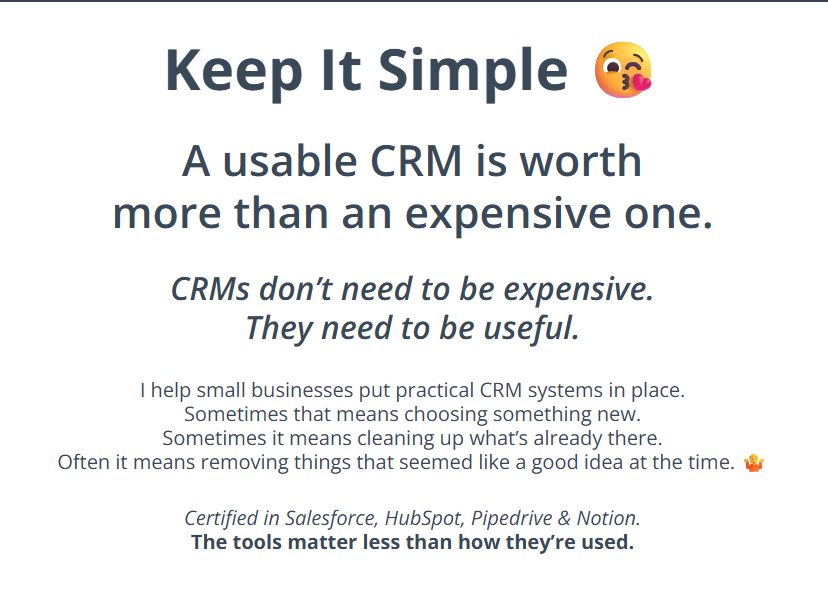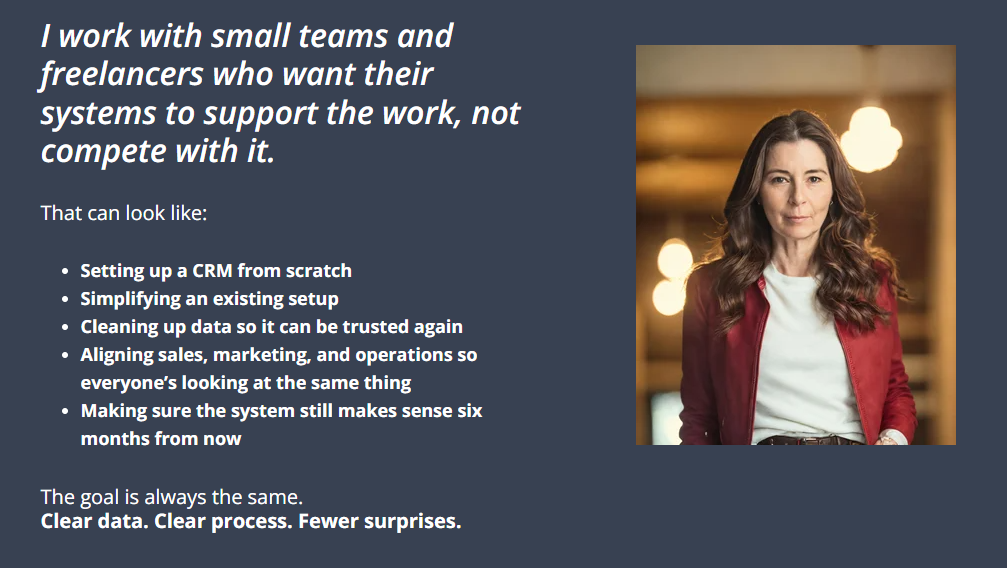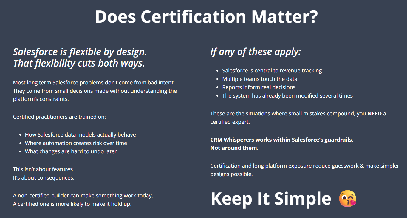 About CRM Whisperers Solutions Is Your Salesforce ROI Stuck? We Transform Underperforming CRMs into Predictable Revenue Engines.####CRM Whisperers specializes in rescuing and optimizing messy, unreliable Salesforce systems for growth-focused small businesses. If you don't need a full-time professional but require trustworthy data, streamlined processes, and actionable insights, we are your on-demand solution. We help you tame the CRM you have into the CRM you always wanted.####We focus on the pain points that kill adoption and ROI, including:##Dirty Data: Duplicate records, inconsistency, and data stuck in silos.##Slow Systems: Too many fields, complex APEX, and endless loading screens.##Lying Reports: Pipeline math that leads to guesswork, not growth.##Workflow Tangles: Broken automations and outdated user processes.####We believe a well-tuned CRM is the most powerful growth tool in your arsenal. We strive to provide every client with a system their team can trust—and perhaps even like.####Our Values:##Straight Talk: We cut through the confusion and jargon to give you simple, direct answers.##Business-First: Our recommendations are always tied to revenue gains and operational efficiency.##Total Transparency: Every client