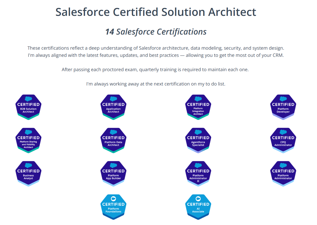 Solution architecture focused on clarity, maintainability, and trusted data. Salesforce designed thoughtfully so teams can work smoothly and plan with confidence.
