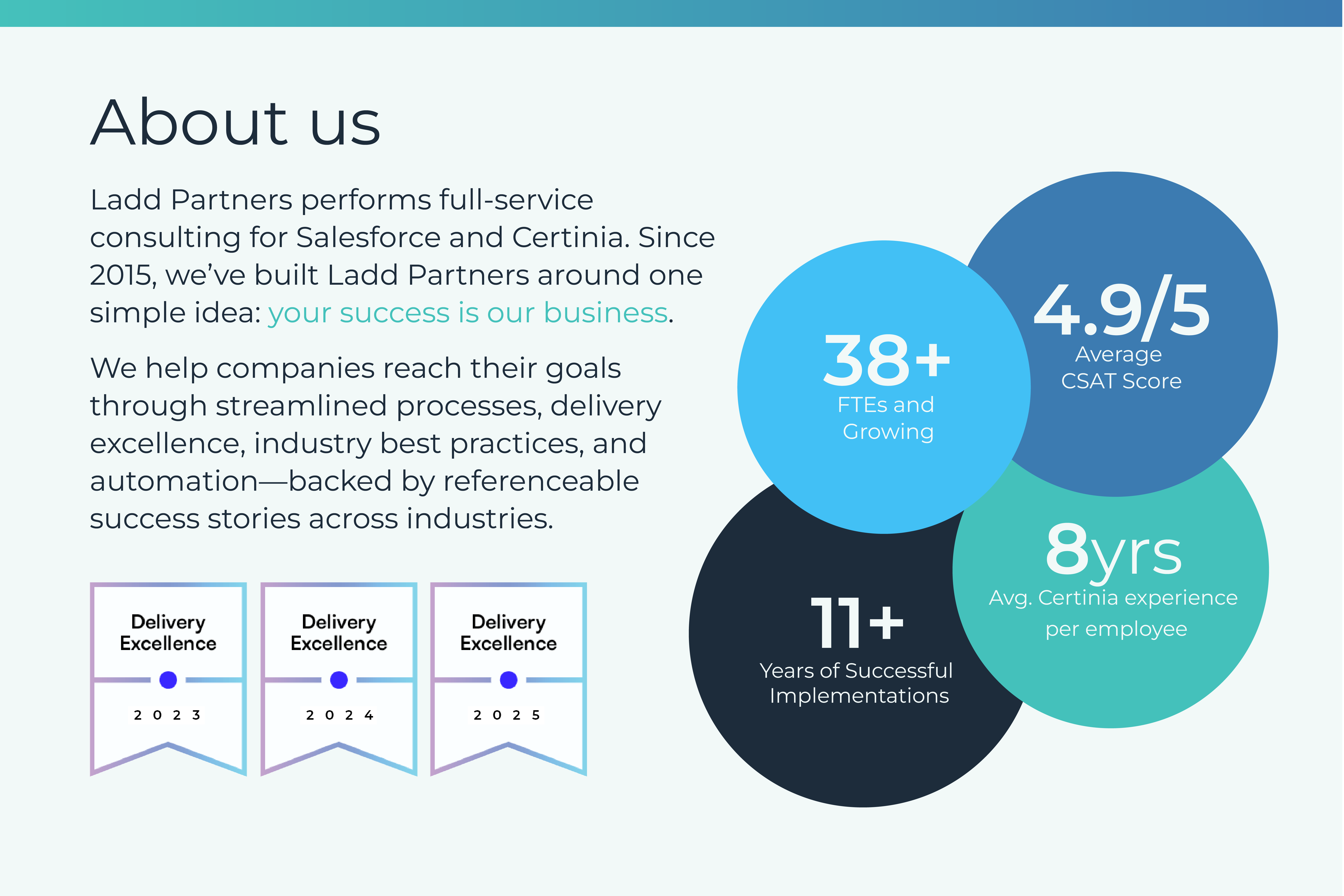 About Ladd Partners, LLC Ladd Partners offers full-service consulting for Salesforce & Certinia including implementations, support and custom development. We focus on delivering meaningful results for our customers. We hire the best people, and treat our employees and our customers right. At the end of the day: Your success is our business.