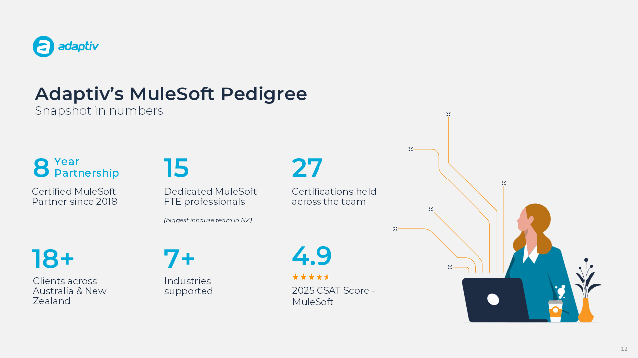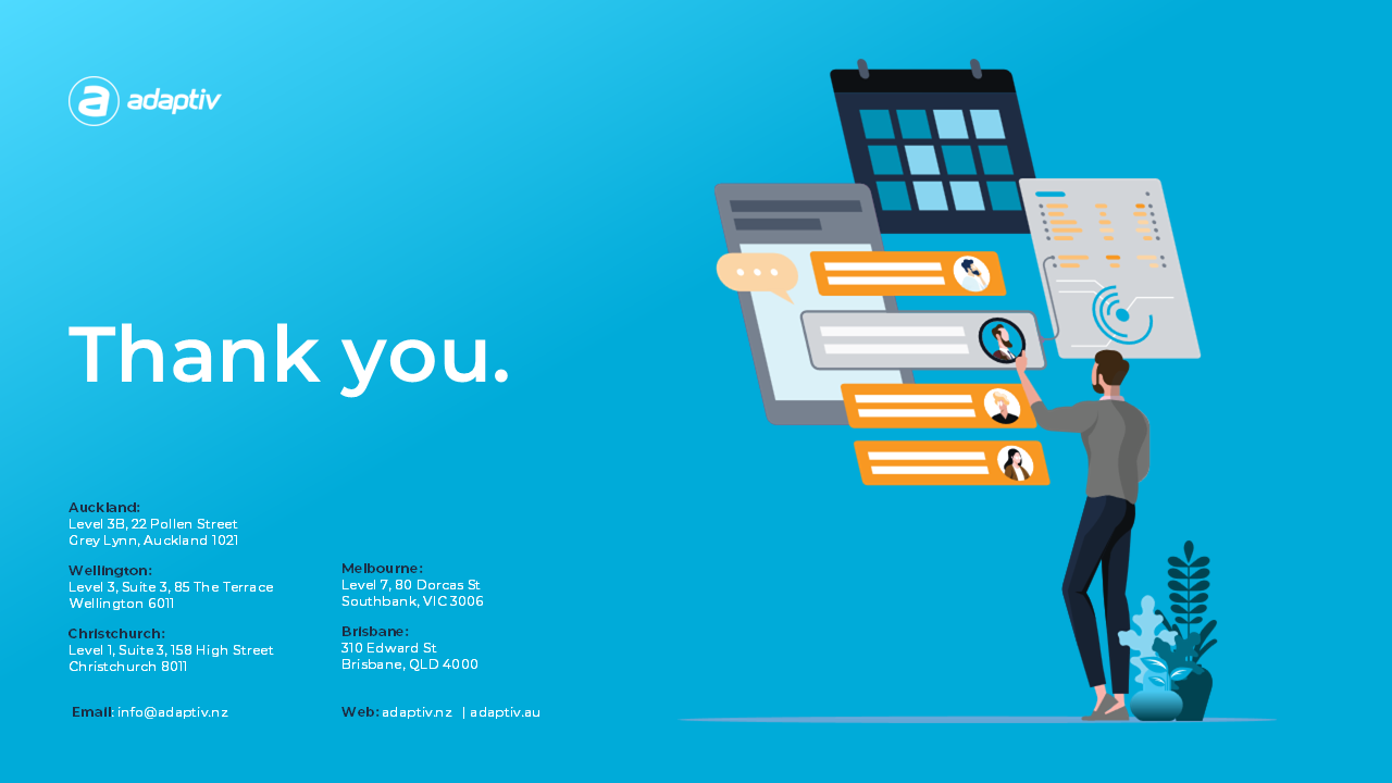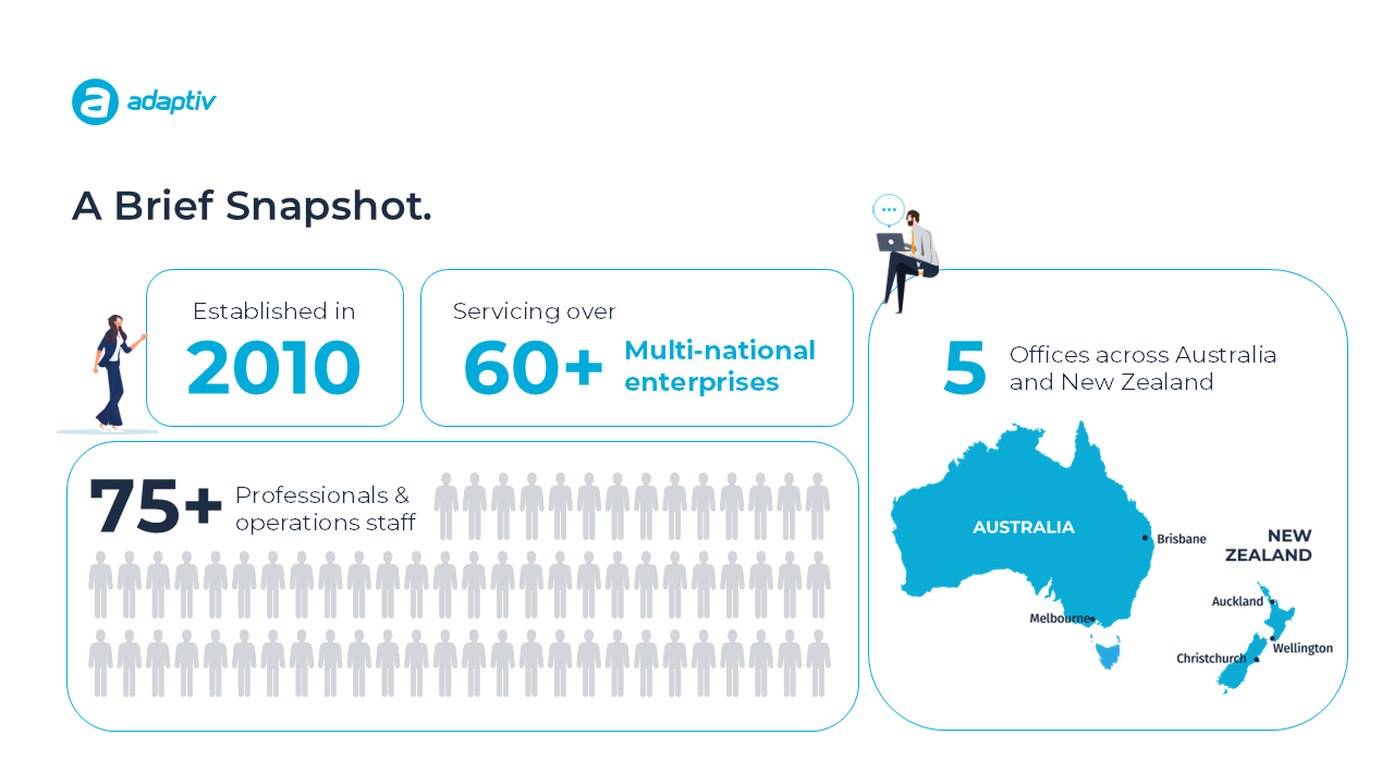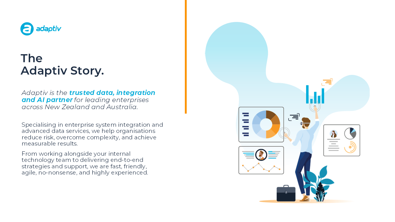 About Adaptiv We do data better.##If it’s to do with getting more out of your data, we do it. And as it’s all we do, we have a reputation for doing it well.####We’re invested in helping you leverage and extend the value of your existing enterprise applications. With our world-class integration and data and analytics services, you’ll reduce risk, remove barriers, make better decisions, and drive exceptional business value from your data.####From working alongside your internal technology team to providing end-to-end strategies through to delivery and support, we are fast, friendly, agile, no-nonsense – and highly experienced.####That’s why we are trusted by leading businesses in New Zealand and Australia.####Over the years, we have gained extensive experience in integrating systems, applications, data and AI. Our expertise has helped our clients, both in New Zealand and Australia, to move to cloud platforms seamlessly, with clear and measurable value to their bottom line.