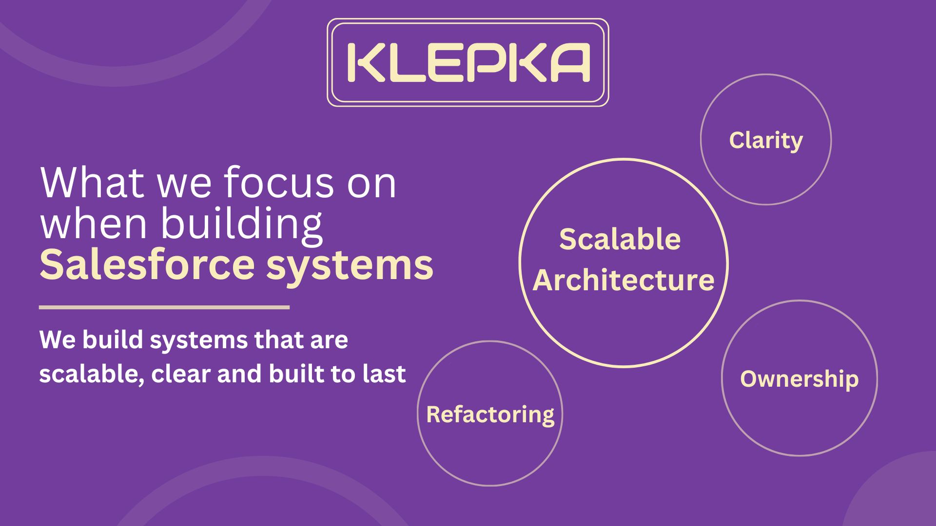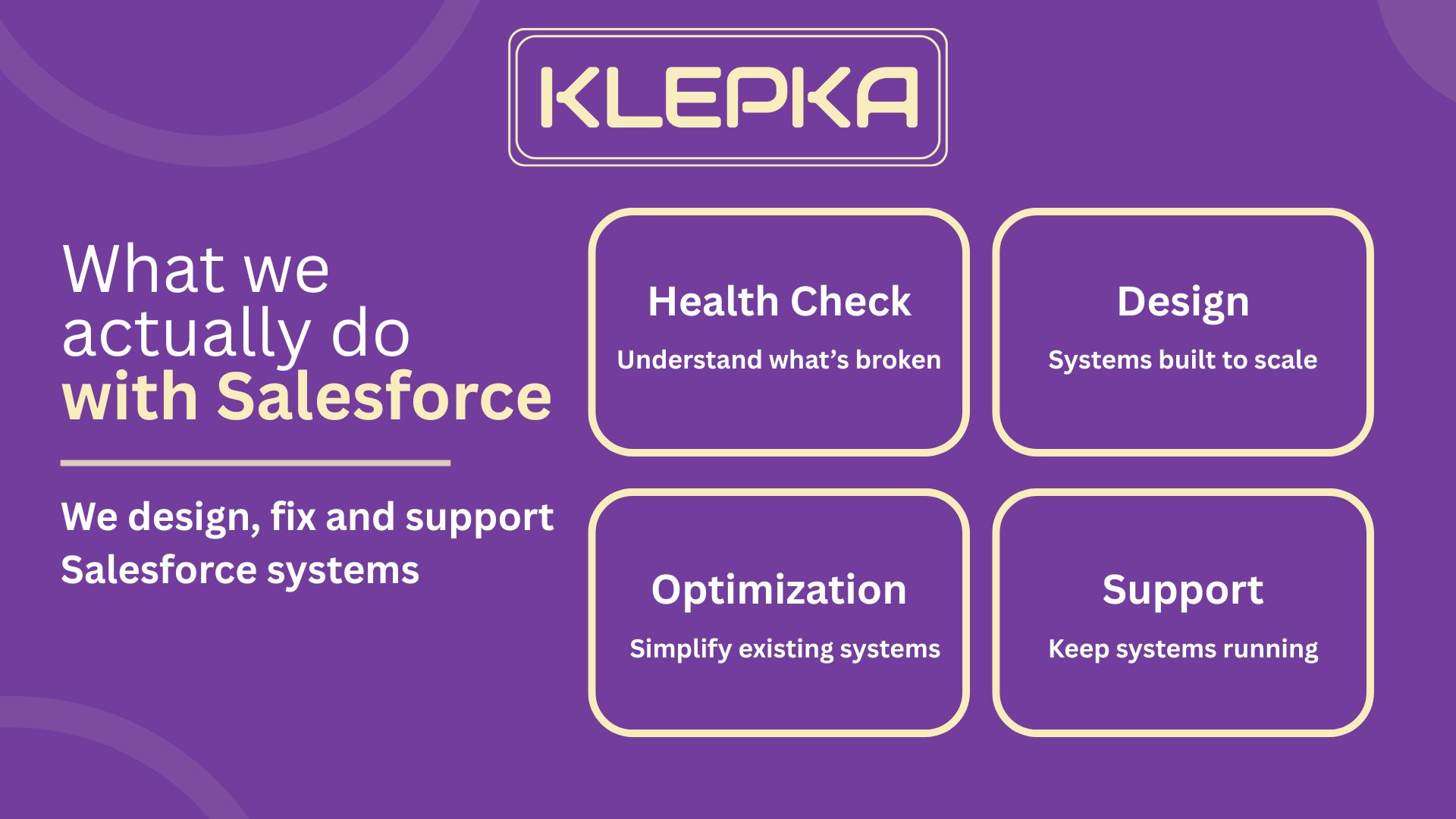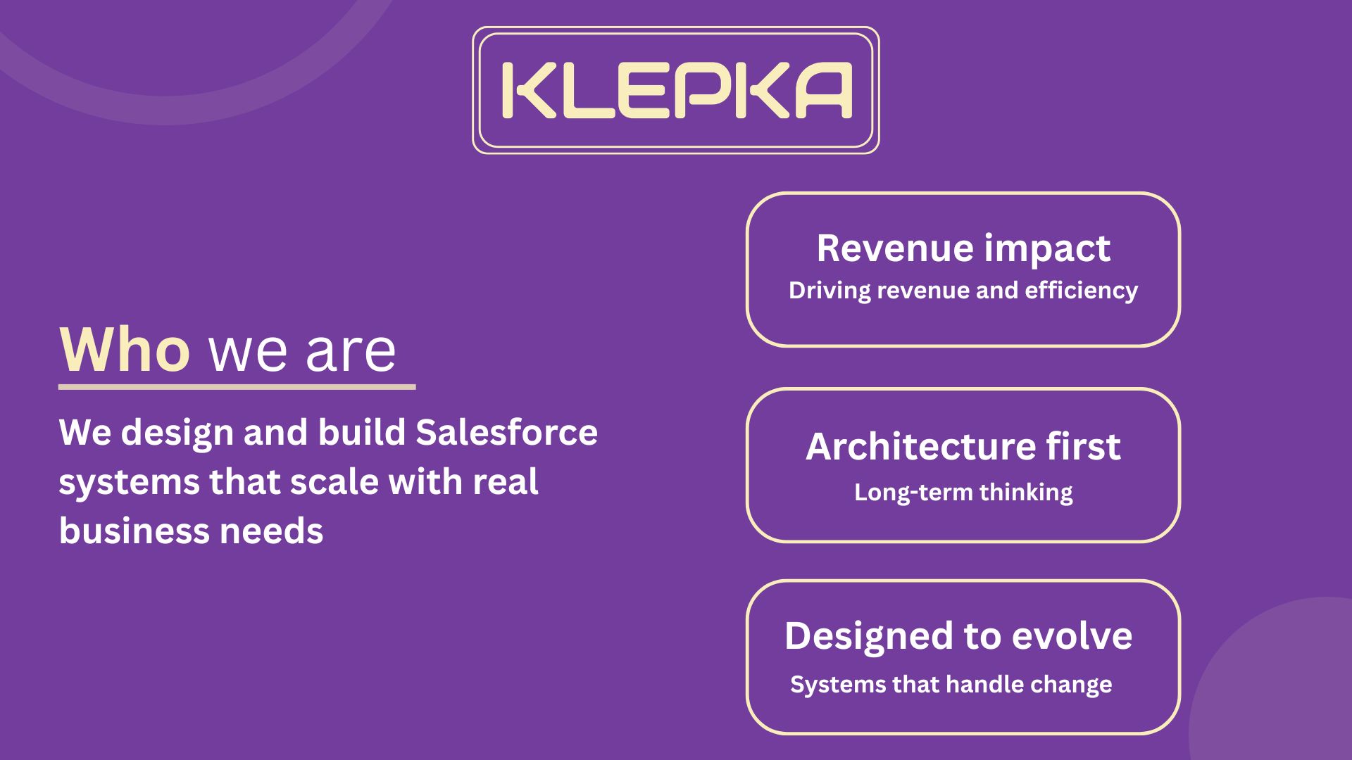 Klepka is a Salesforce consulting company focused on building scalable, well-structured CRM systems. We provide Salesforce implementation and integration services with a strong focus on architecture and long-term system stability.