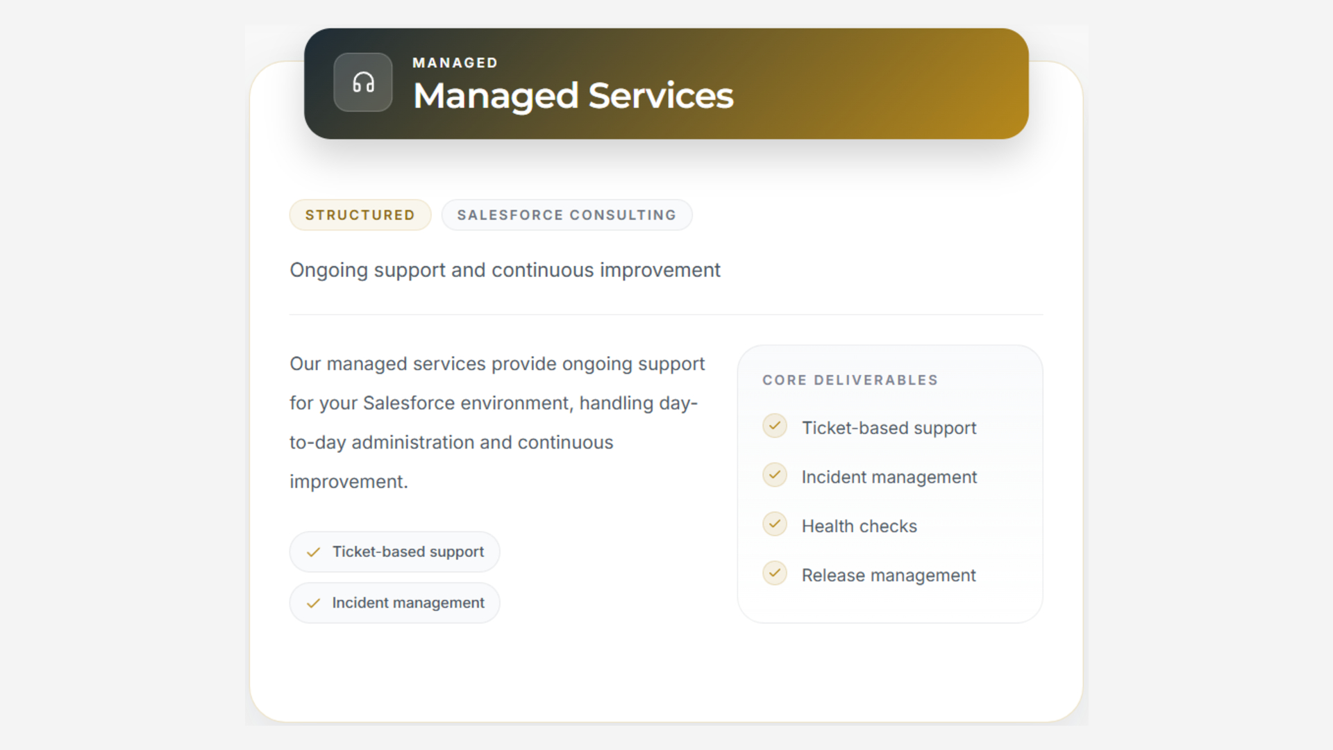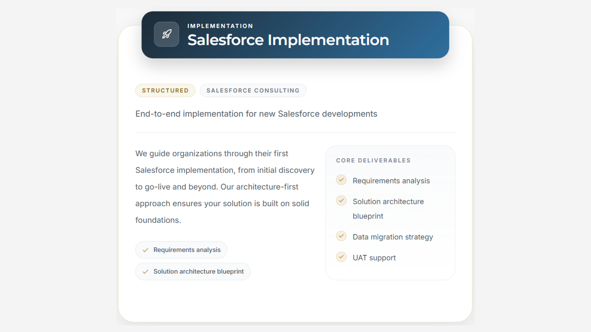 End-to-end Salesforce consulting for organizations implementing, optimizing, or re-architecting their CRM. We design scalable solutions, streamline business processes, and integrate Salesforce with existing systems to support adoption and long-term growth