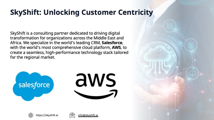 Accelerate your digital transformation with SkyShift, the Salesforce and AWS partner for the Middle East and Africa. We deliver integrated cloud and security solutions that turn complex regional challenges into competitive advantages.