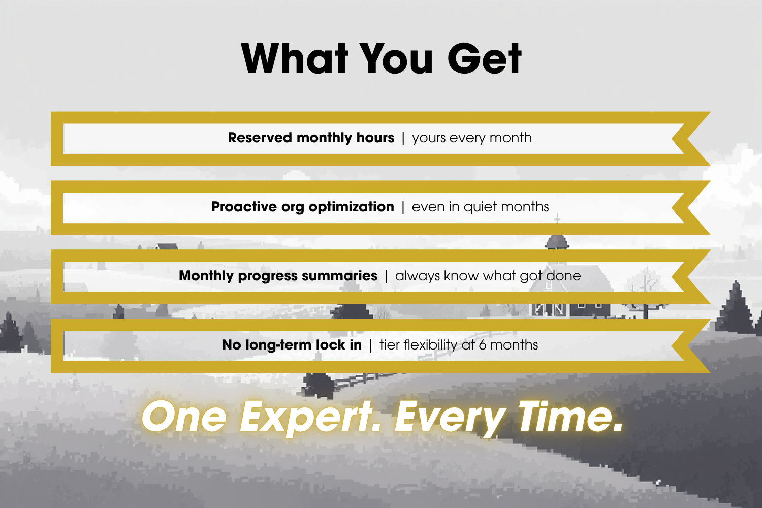 Most Christian nonprofits are either underusing Salesforce or paying too much to fix it. I provide expert, ongoing Salesforce support at a fraction of the cost of a full-time hire — and as a fellow Christian, I understand your mission from the inside.