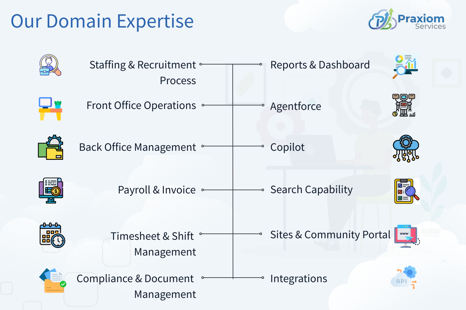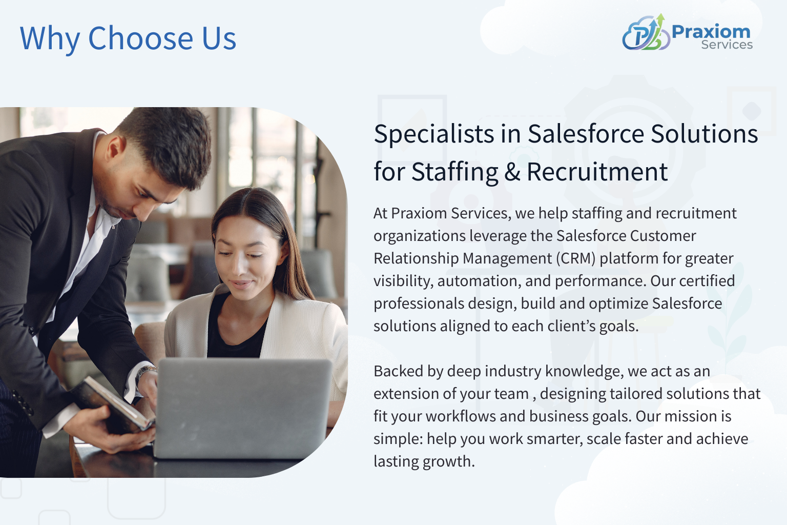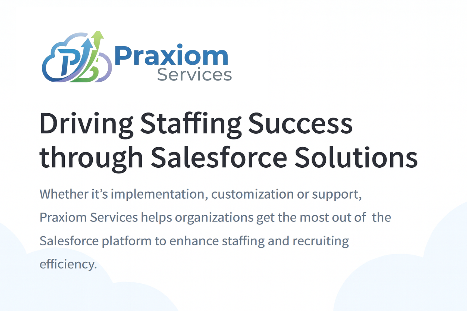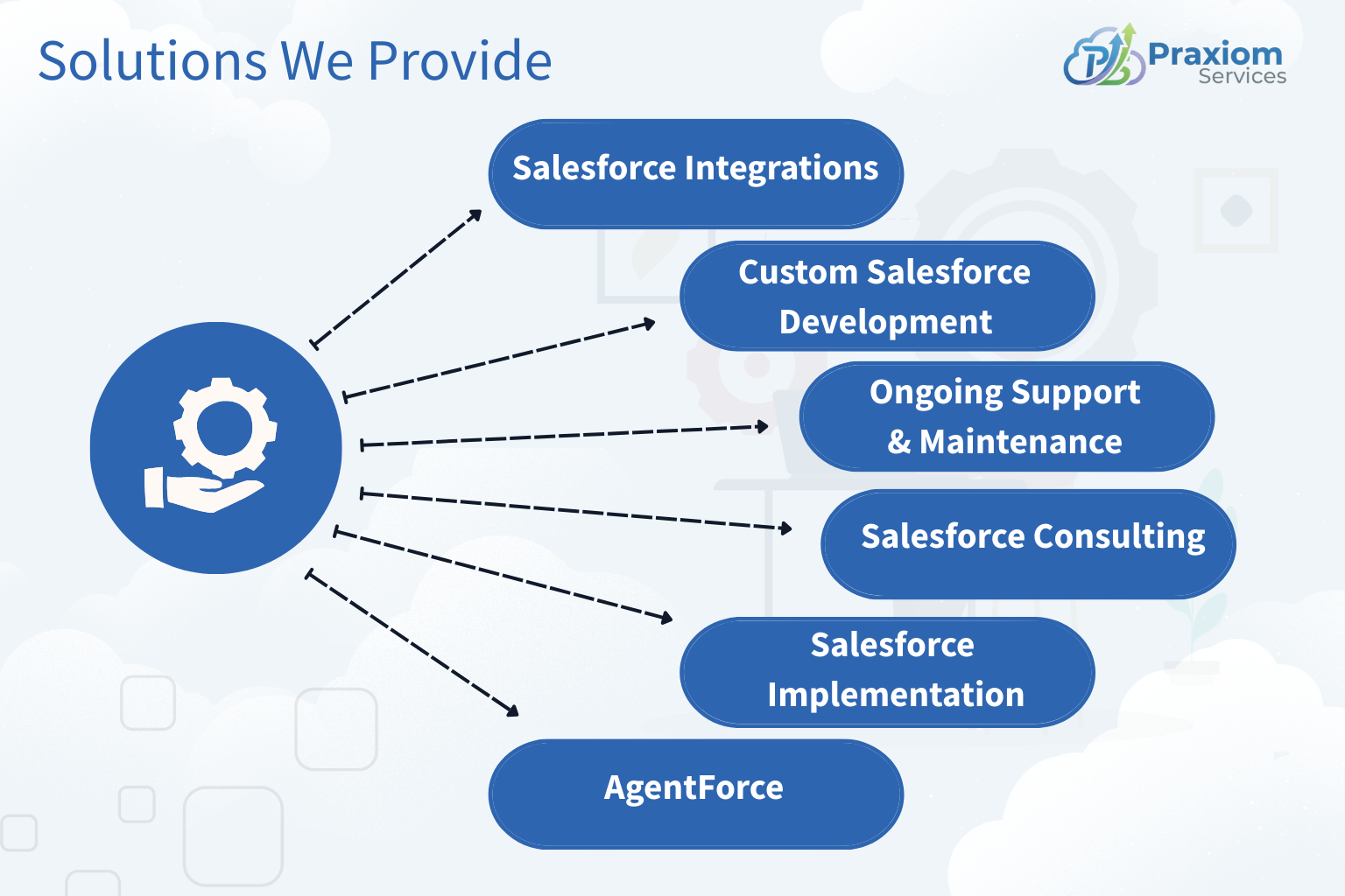 Praxiom Services delivers end-to-end Salesforce consulting and implementation across all Salesforce clouds—including Agentforce—to help organizations gain clarity, automate smarter, and achieve high-performance growth.