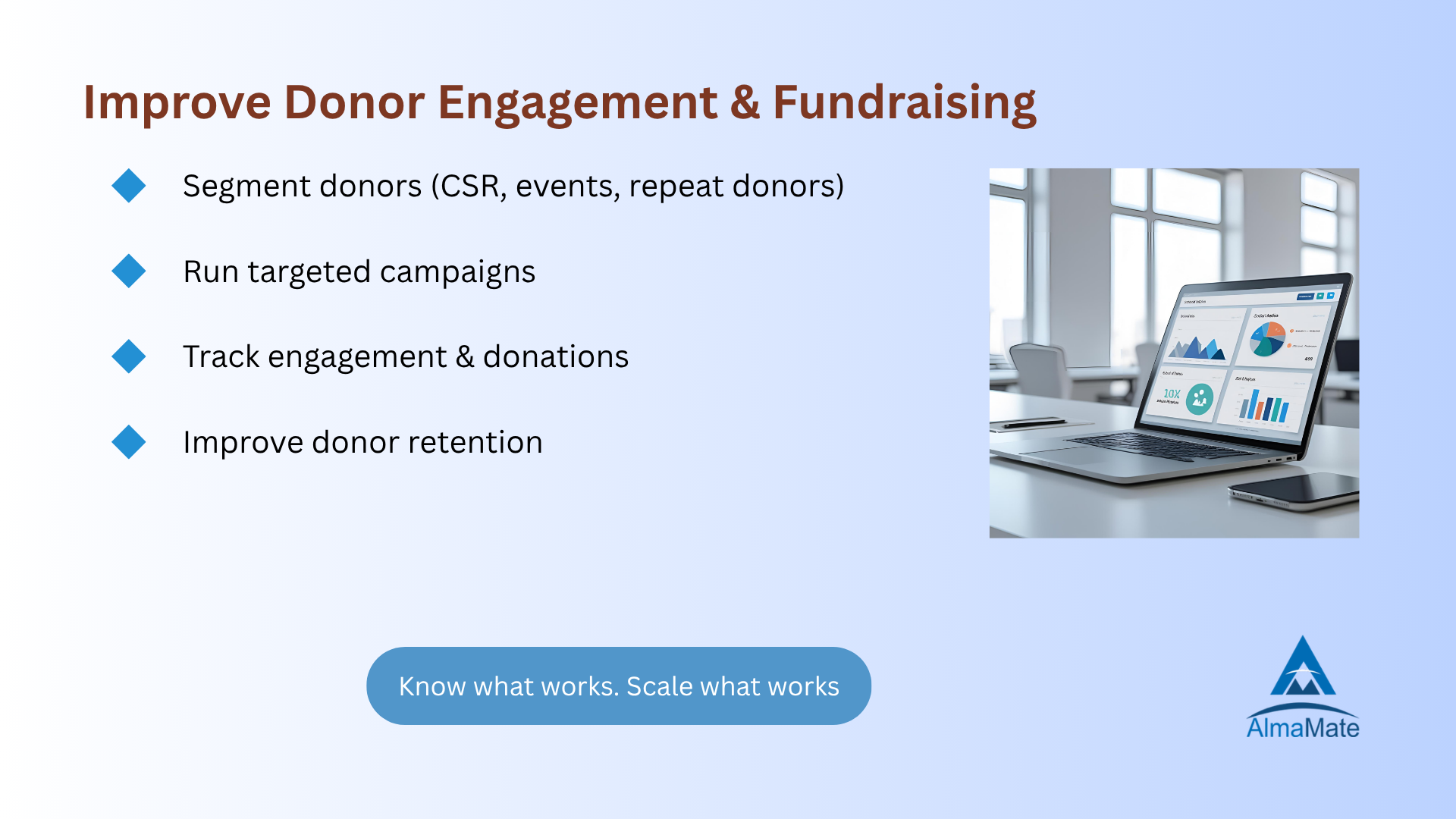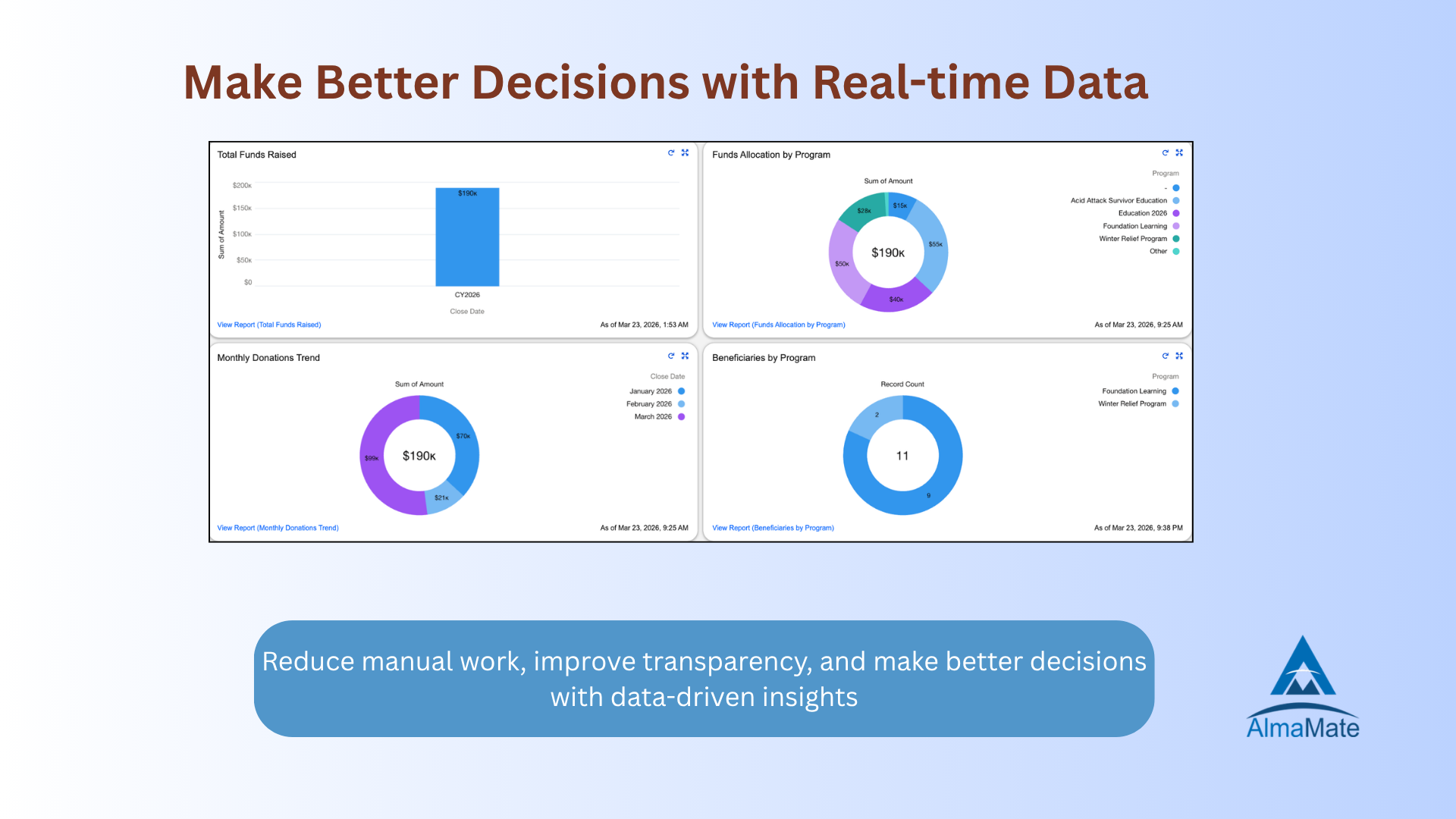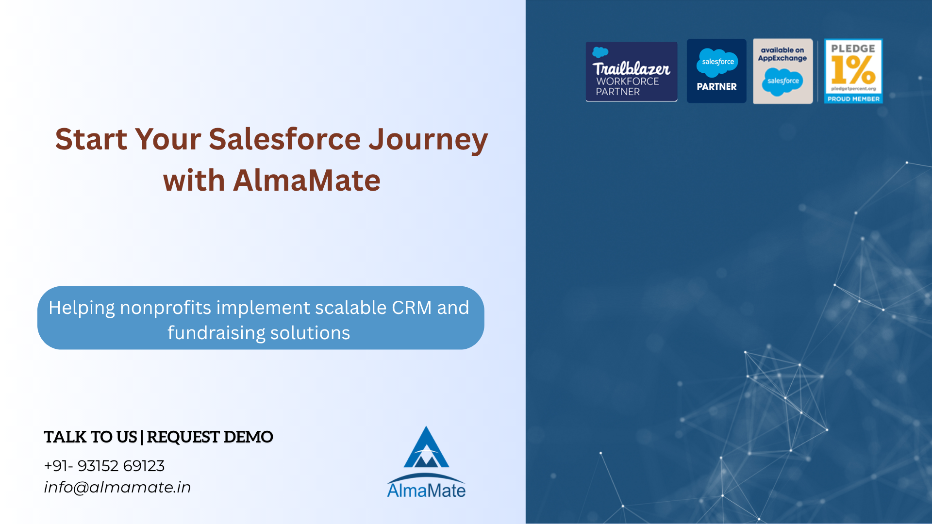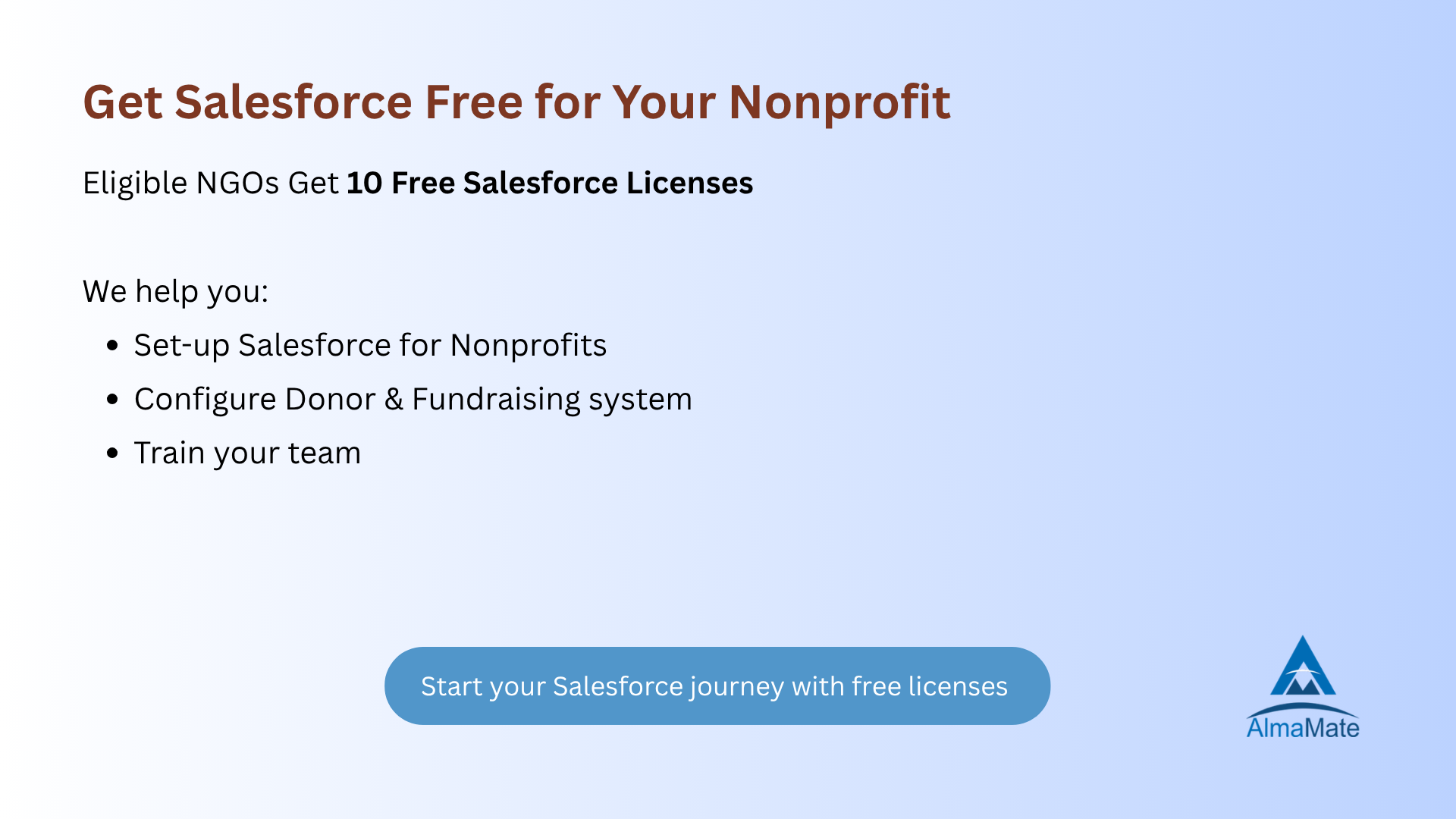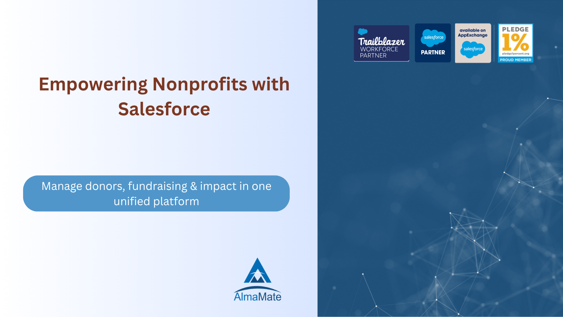 AlmaMate specializes in Salesforce NPSP (Nonprofit Success Pack) and Nonprofit Cloud implementations for nonprofits and NGOs. We help organizations streamline donor management, fundraising, program management, and impact reporting using Salesforce NPSP.