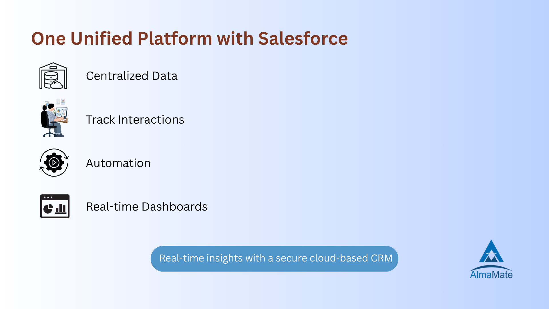 About AlmaMate Info Tech AlmaMate Info Tech provides a full suite of Salesforce services designed to streamline operations, improve customer engagement, and drive digital growth. We specialize in high-impact platform implementations, including Salesforce Experience Cloud and Nonprofit Cloud solutions. Our certified professionals deliver each service with a focus on quality, agility, and measurable outcomes. We provide solutions tailored to the unique needs of diverse industries, with deep domain expertise in Non Profit organizations and the implementation of complex use cases like LMS integration and volunteer management portals. Our strategies address industry-specific challenges to meet compliance standards.