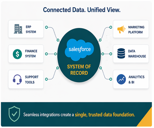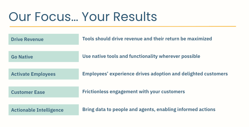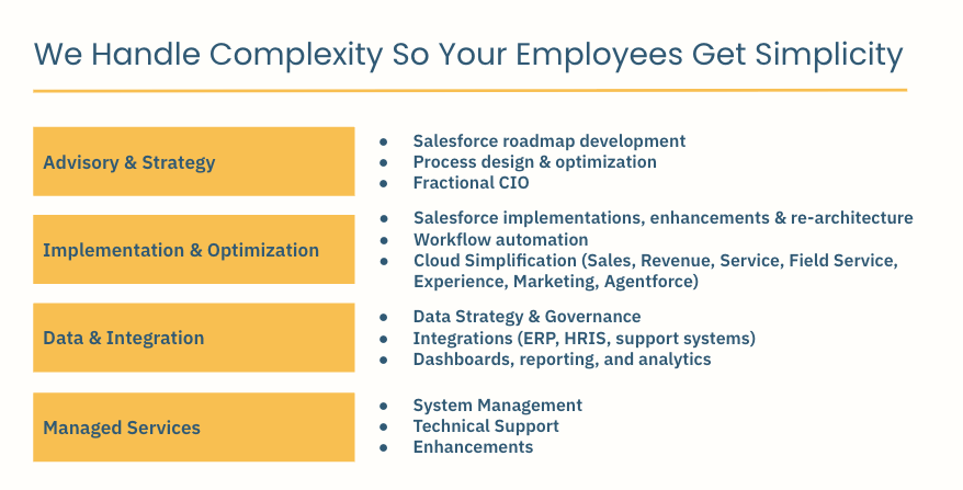 Customer first approach and perspective. Salesforce ecosystem expertise including: Sales, Revenue, Service, Field Service, Experience, Marketing, and Agentforce. Focused on maximizing value of Salesforce by integrating your enterprise systems.