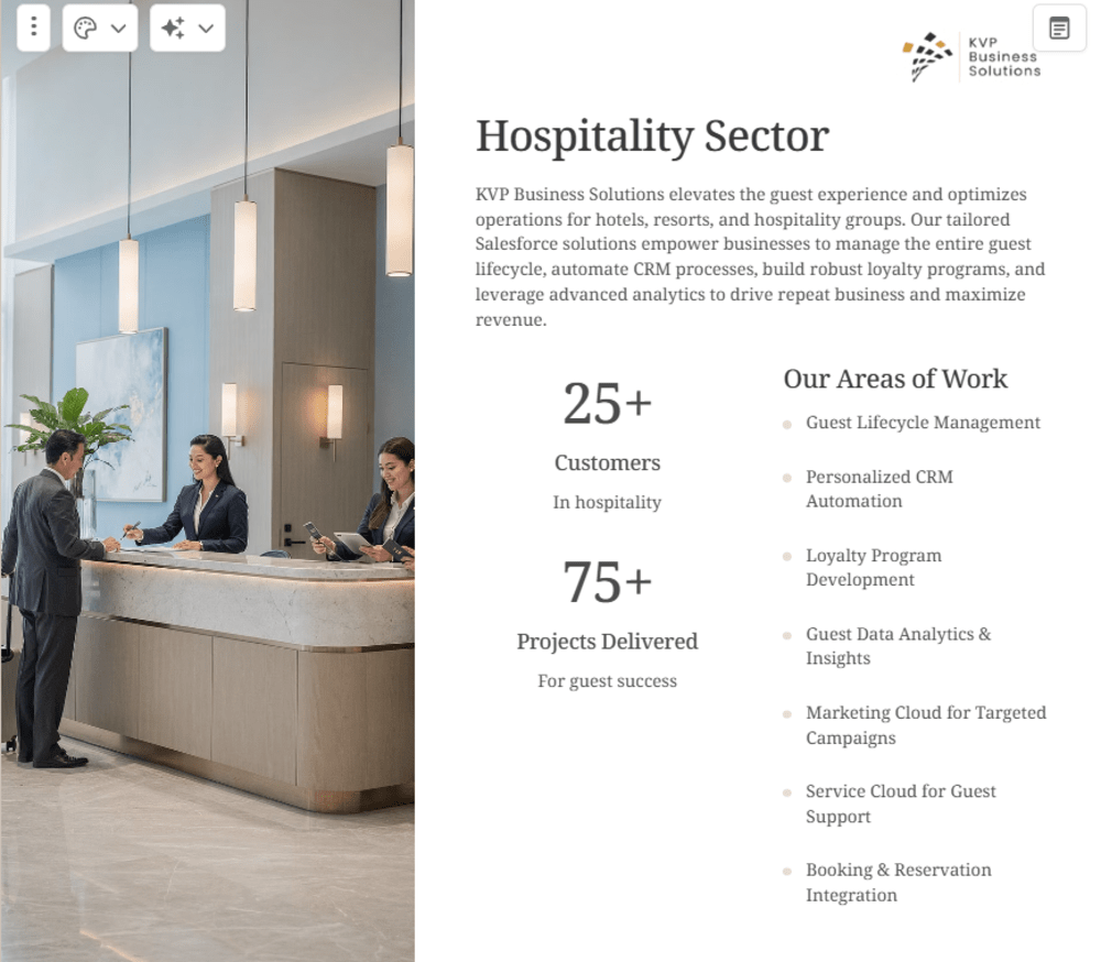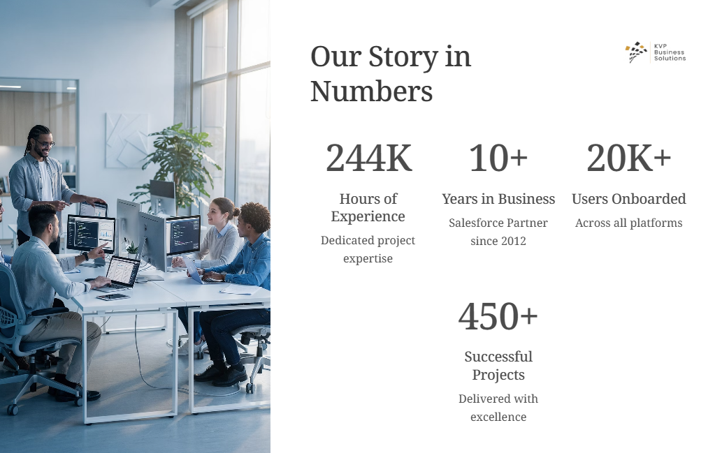 About KVP Business Solutions Pvt Ltd KVP Business Solutions is an elite Salesforce Summit Partner and Managed Service Provider (MSP) headquartered in Bangalore. With over 15 years of excellence, we specialize in high-velocity digital transformation across Manufacturing, BFSI, Retail and Real Estate. Our team of 100+ certified experts has successfully delivered 500+ projects, empowering 15,000+ users across 20 countries. At KVP, we don't just implement Salesforce; we build sustainable B2B revenue engines. By utilizing our library of 15+ pre-built industry accelerators, we reduce implementation timelines by 40%, ensuring faster time-to-value. Whether it's complex AI-driven forecasting, automated dynamic pricing, or enterprise-scale managed services, KVP is the trusted partner for global brands seeking to eliminate manual silos and achieve predictable growth.