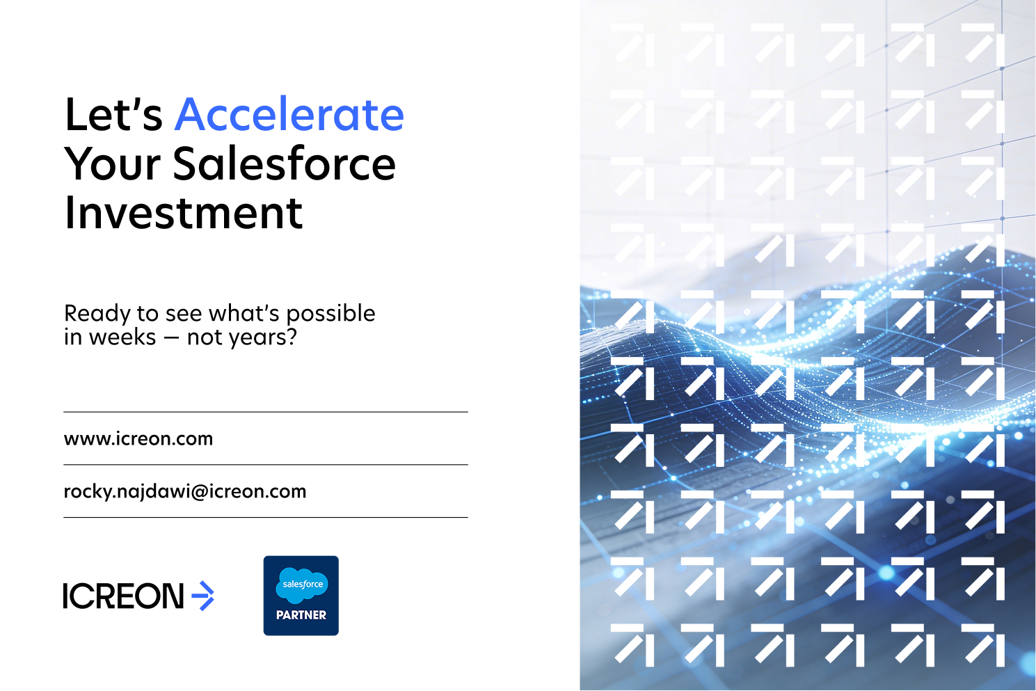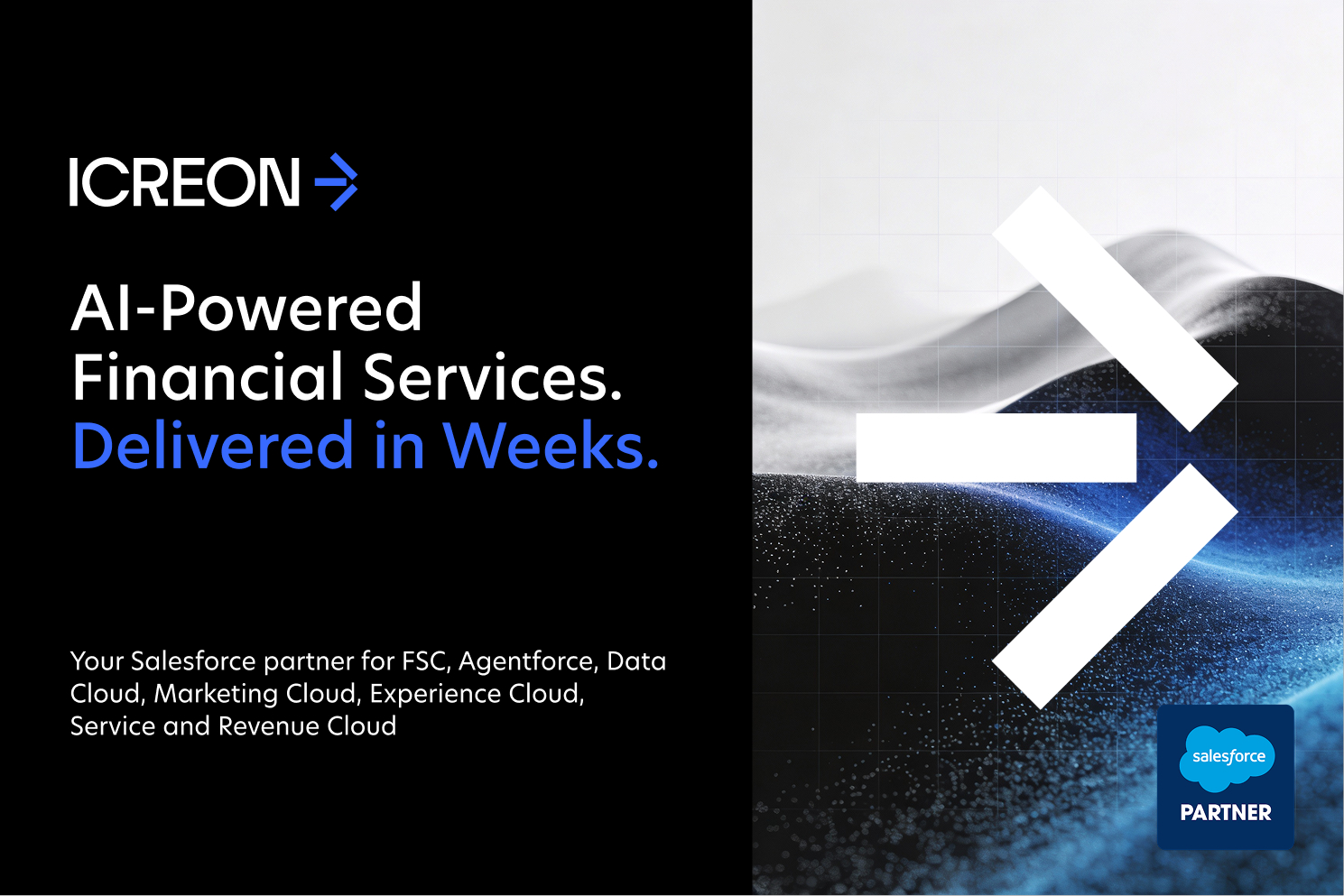 Icreon delivers AI-powered Salesforce implementations for financial services in 8-12 weeks — not years. We specialize in FSC, Agentforce, Data Cloud, Marketing Cloud & Revenue Cloud for banking, insurance, and wealth management institutions. Based in NYC.