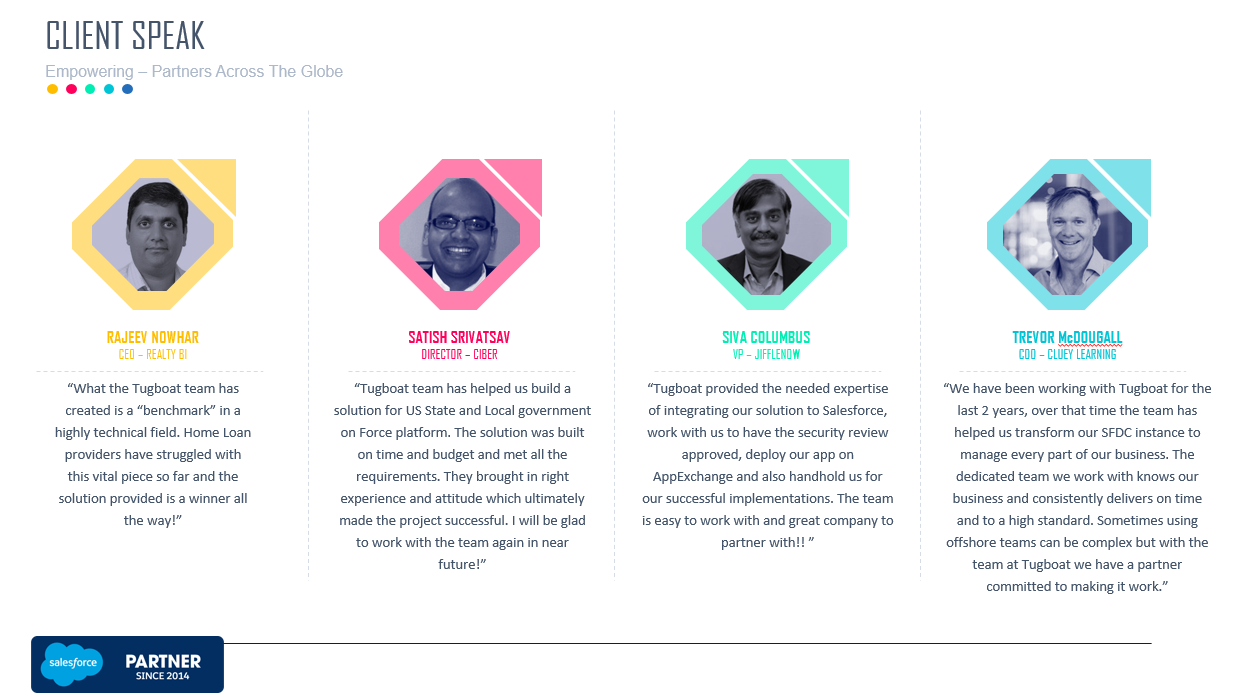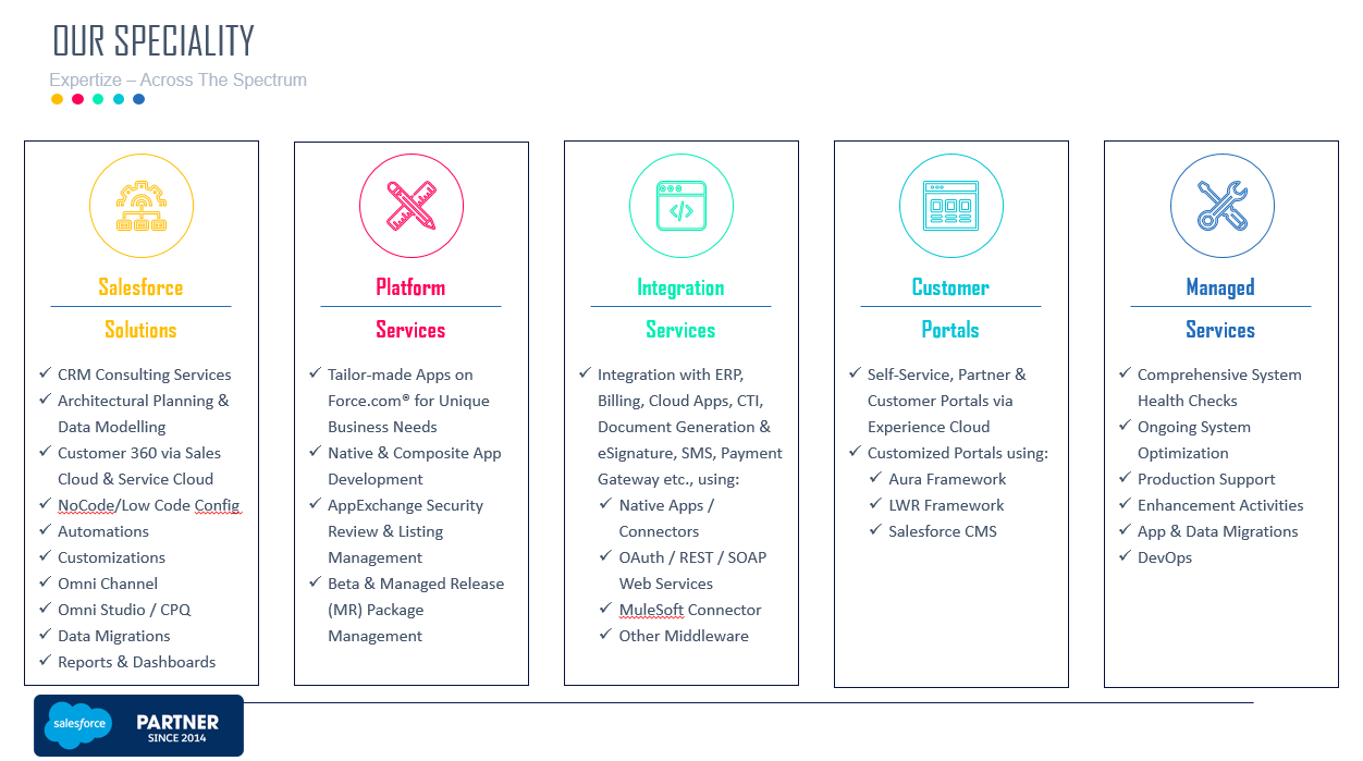 We are a proud Salesforce.com® Consulting & ISV partner company.####We deliver CRM & custom Cloud solutions to our Clients at affordable cost via reliable & committed crew that has steered multiple successful Global IT programs across industry domains.