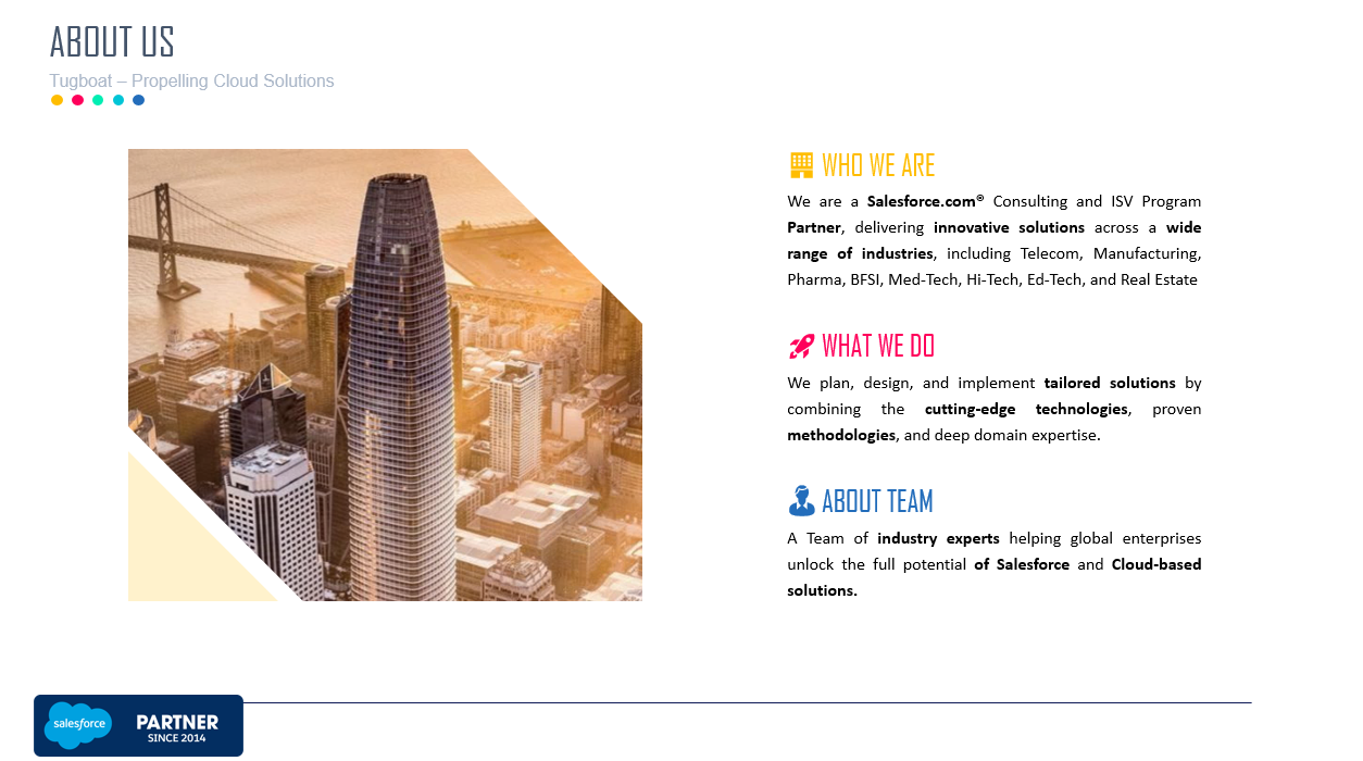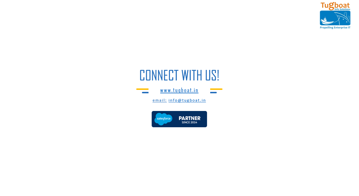 About Tugboat Info Solutions Pvt. Ltd., Tugboat specializes in on-cloud & on-premise Customer Relationship Management (CRM) and custom Cloud based Application development solutions.####The Team: ##Team Tugboat is a group of industry experts that have empowered enterprises across the globe to realize the potential of CRM & Cloud solutions by leveraging the innovation of leading technology vendors, our proven methodology, as well domain expertise! #### The Promise: ##“To consistently exceed our Customer's expectations in delivering Enterprise IT strategies & solutions which integrate seamlessly with their business and be the growth catalyst...”####For more information, contact Tugboat at +91-9880195525 / +91-9880781763 or visit https://tugboat.in