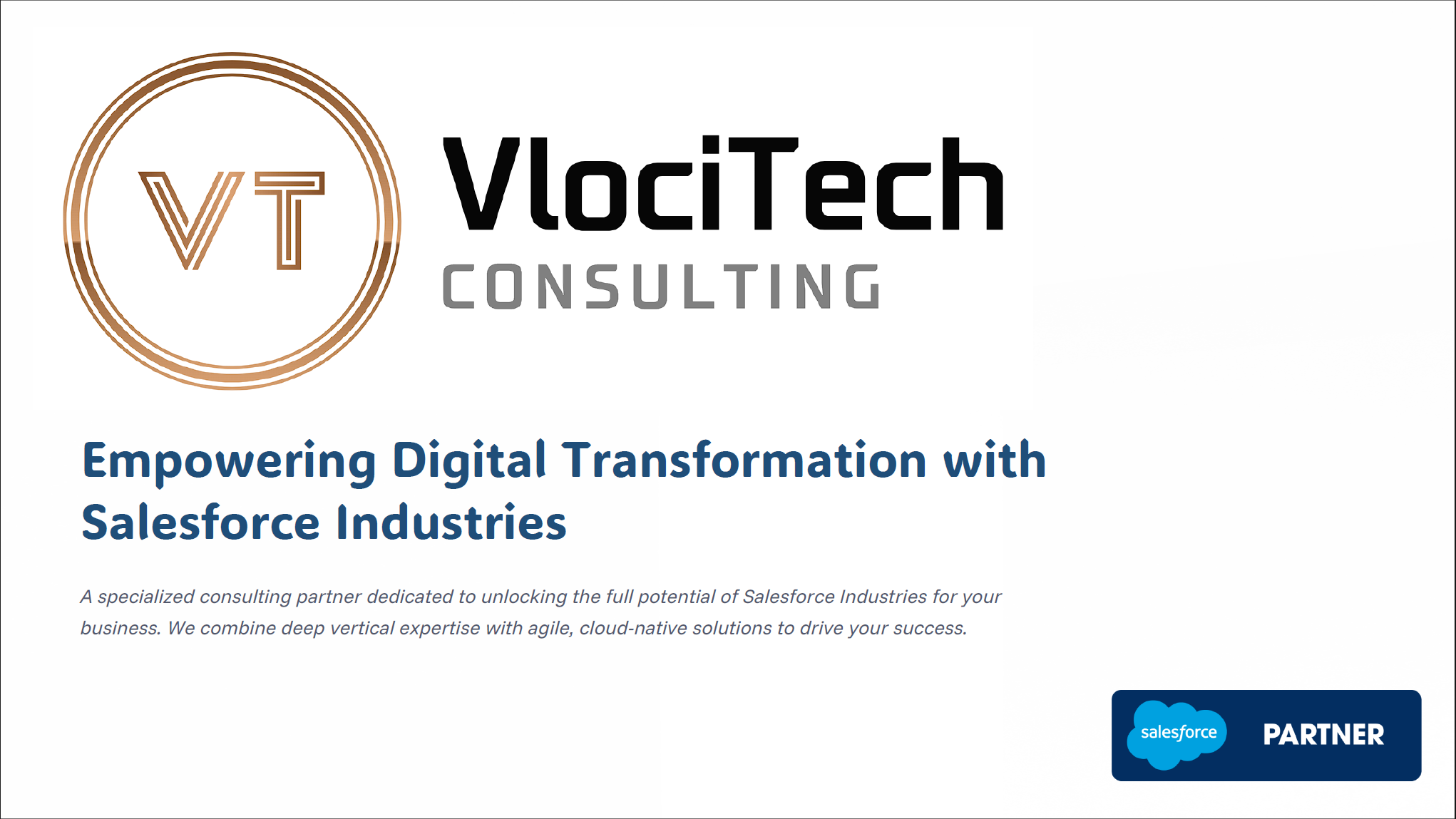 About VlociTech Consulting Ltd At VlociTech Consulting Ltd, we are your trusted partner in digital transformation. Specializing in Salesforce Industries implementations, we help businesses operating in various sectors such as Communications, Media, and Energy & Utilities, to streamline operations, enhance customer engagement, and drive growth.####What Sets Us Apart?##✔ Deep Salesforce Industries Expertise – Delivering tailored, end-to-end solutions.##✔ Industry-Specific Solutions – Addressing unique business challenges.##✔ Commitment to Excellence – Ensuring high-quality, scalable results.##✔ Customer-Centric Approach – Partnering closely for seamless implementations.####Our Values & Goals##🔹 Innovation – Cutting-edge technology for complex challenges.##🔹 Integrity – Building trust through transparency.##🔹 Collaboration – Achieving success together.##🔹 Continuous Growth – Expanding expertise to add value.