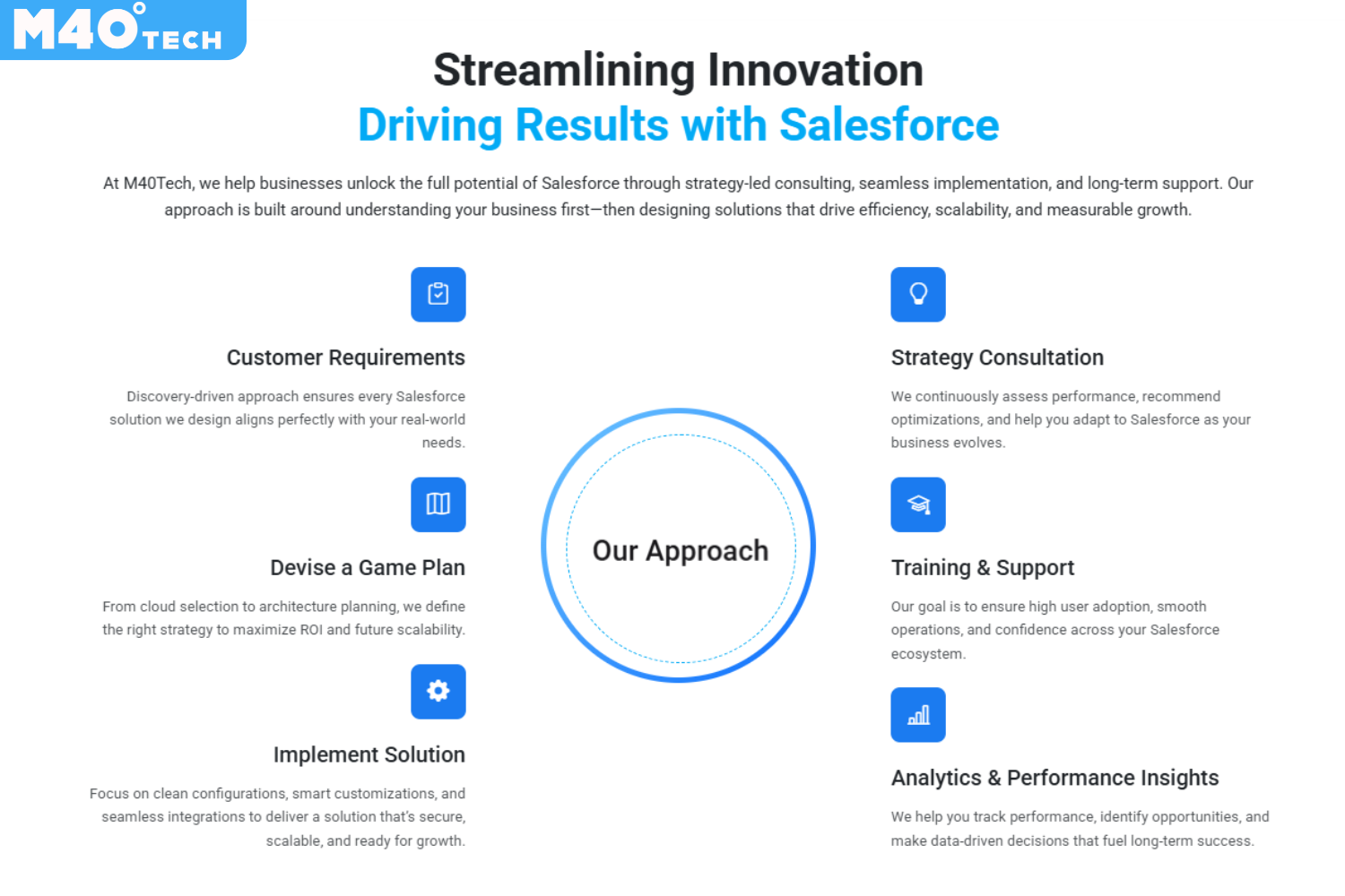About M40Tech Ltd M40tech is a Salesforce CRM consulting firm and as a leading Salesforce consulting firm. Specializes in Salesforce consulting, custom development, API integration, and managed services designed to help businesses streamline operations, strengthen customer relationships, and drive digital transformation.