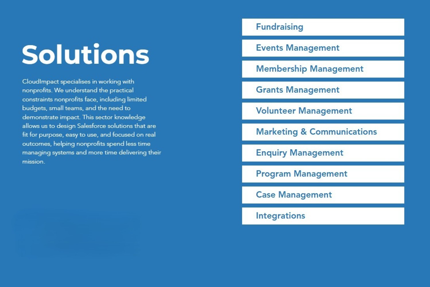Salesforce built for smaller nonprofits. CloudImpact is an Australian Salesforce Partner delivering clear, practical solutions tailored to nonprofit needs. We understand the real-world constraints nonprofits face and design Salesforce to work for you.