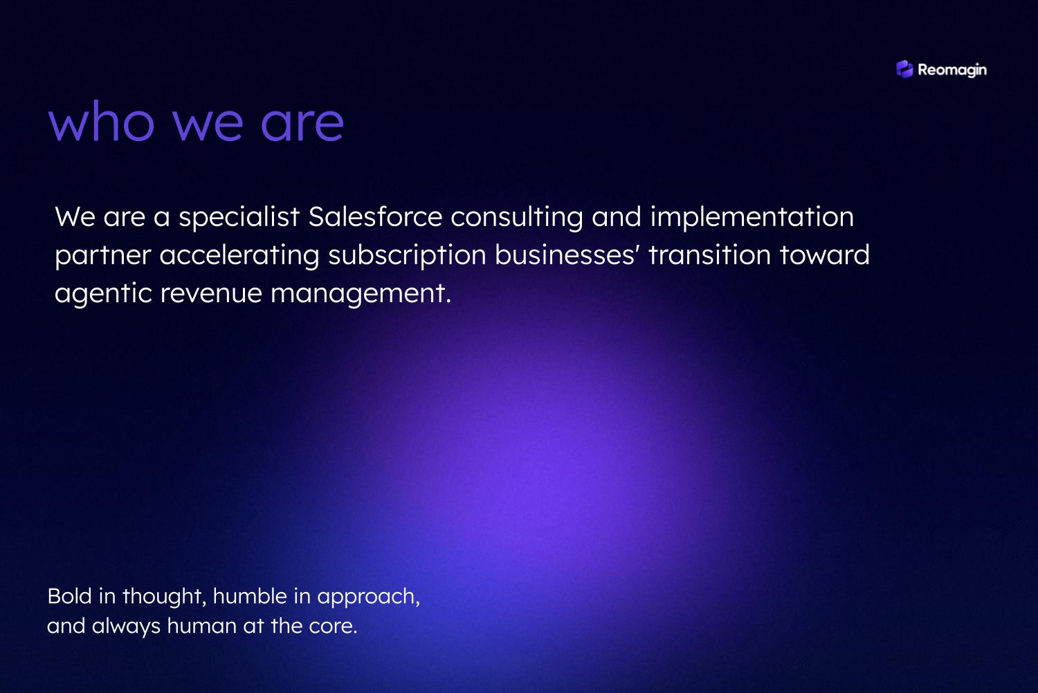 About Reomagin We are a specialist Salesforce consulting and implementation partner helping subscription and usage-based businesses move toward agentic revenue management. ####Our mission is to help subscription businesses:##Reimagine revenue management. Simplify process & system complexity. Accelerate growth across all channels.####We’re bold in our thinking, humble in our approach, and always human at the core.####Our specialized services include:##+ Launching and modernizing subscription and consumption monetization models.##+ Designing omnichannel buying experiences across self-service, assisted, and partner-led channels.##+ Helping transform from Salesforce CPQ to Agentforce Revenue Management with clarity.##+ Unify CPQ, CLM, billing, and commerce on Salesforce with Agentforce Revenue Management.##+ Instructor-led Agentforce Revenue Management training
