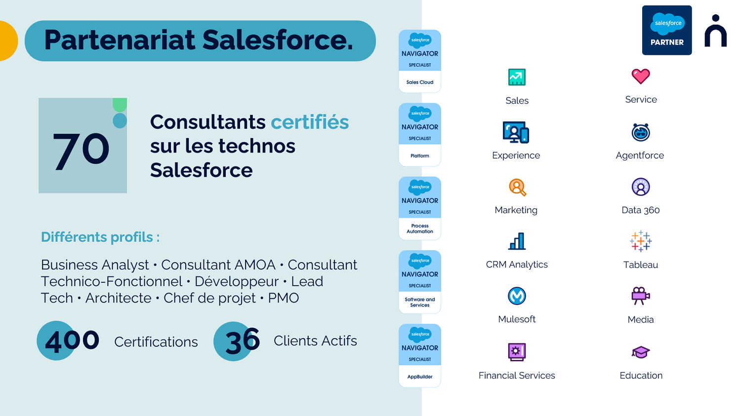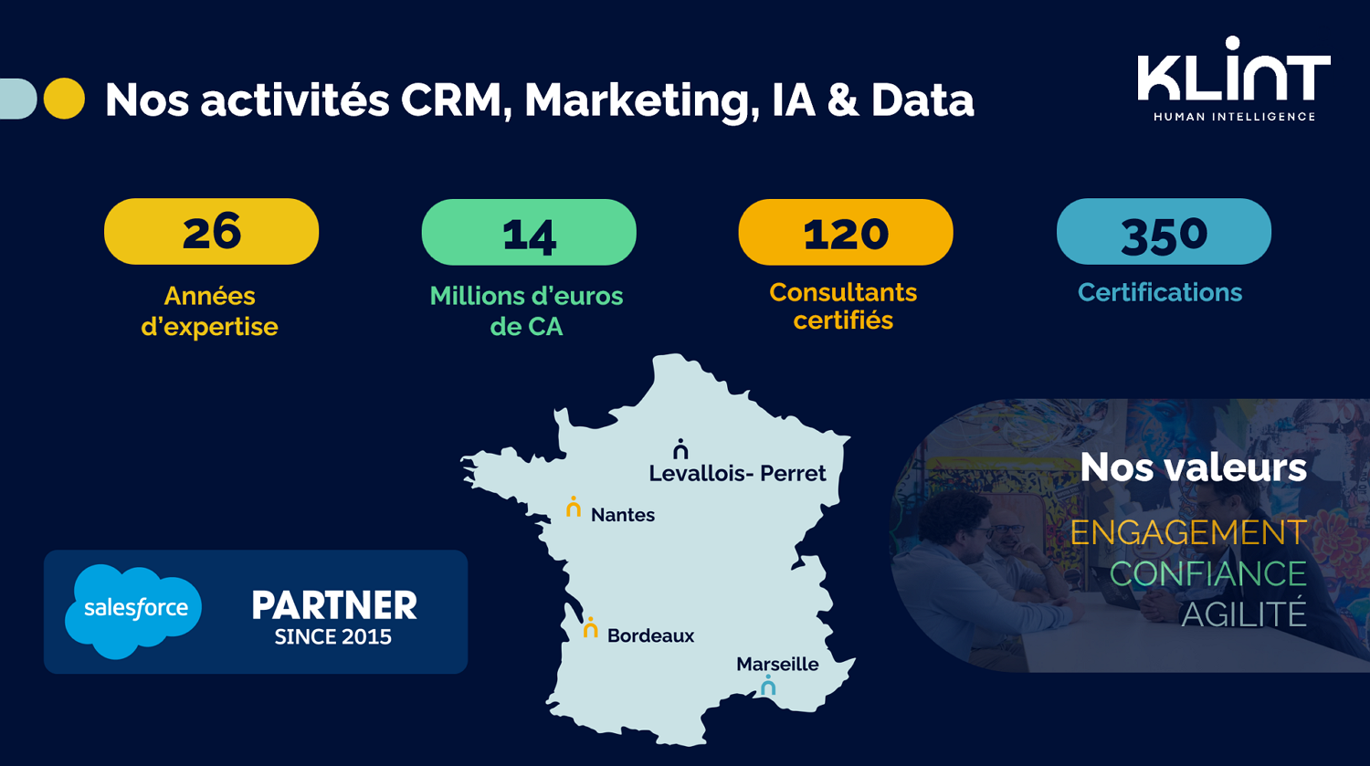 About KLINT 🌟 Klint – Experts Salesforce : Agentforce, Data 360 & Customer 360##Klint accompagne les organisations dans la modernisation de leur relation client grâce à une maîtrise avancée de Salesforce.##Nous unissons Data Cloud / Data 360, Agentforce, Marketing Cloud et les clouds CRM (Sales, Service, Experience) pour créer un Customer 360 réellement activable et générateur de performance.####🔑 Nos expertises clés##Agentforce & IA Générative : copilots, automatisations intelligentes et productivité augmentée pour les équipes Sales & Service.##Sales Cloud & Service Cloud : efficacité commerciale, qualité de service et pilotage unifié.##Data Cloud / Data 360 : unification, modélisation et activation de la donnée en temps réel.##Marketing Cloud : orchestration omnicanale, personnalisation avancée et automation.##Experience Cloud : portails, self-service et expérience utilisateur.####🚀 Ce que Klint délivre##Une data propre, connectée et exploitable##Des parcours clients fluides et personnalisés##Des équipes augmentées par l’IA (Agentforce)##Des résultats rapides via des Quickstarts (Agentforce, Data Cloud, Marketing Cloud)