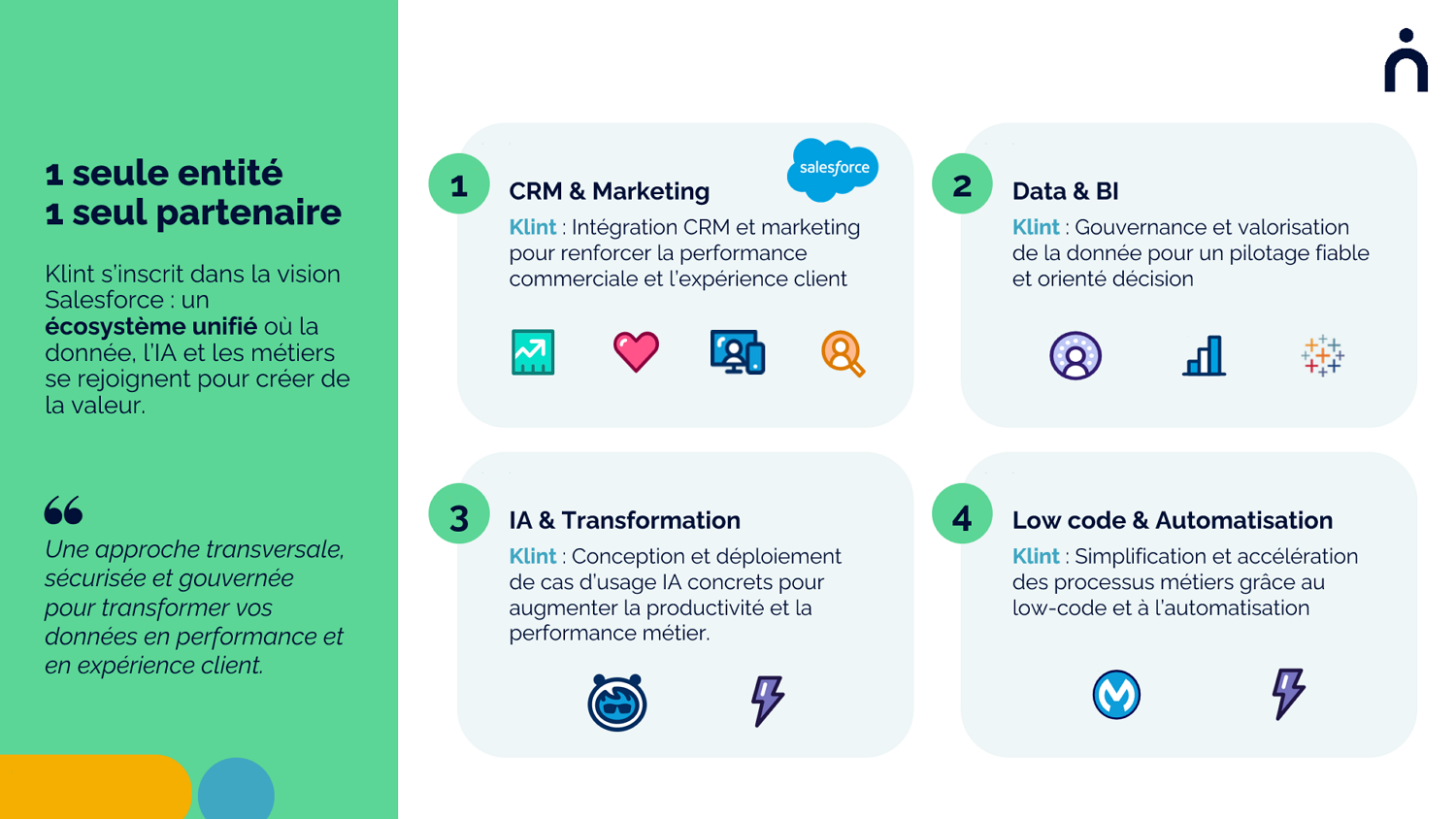 🤖 Klint met l’IA au service de la performance : Agentforce, Data Cloud, Sales & Service Cloud, Marketing Cloud… Nous activons un Customer 360 intelligent et opérationnel, pensé pour vos enjeux métiers et vos ambitions de croissance. On écrit la suite ?