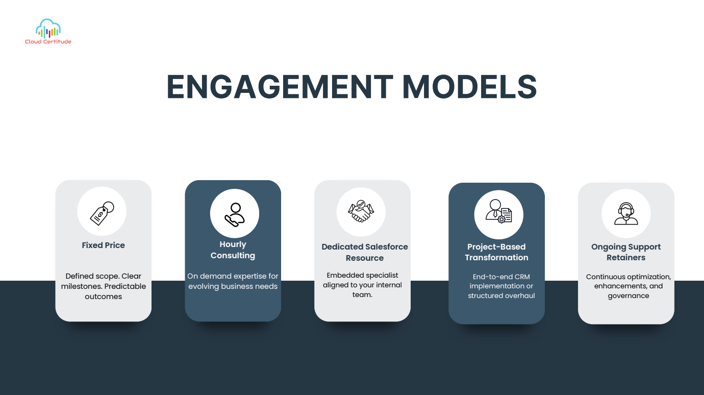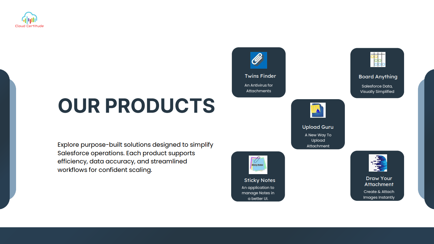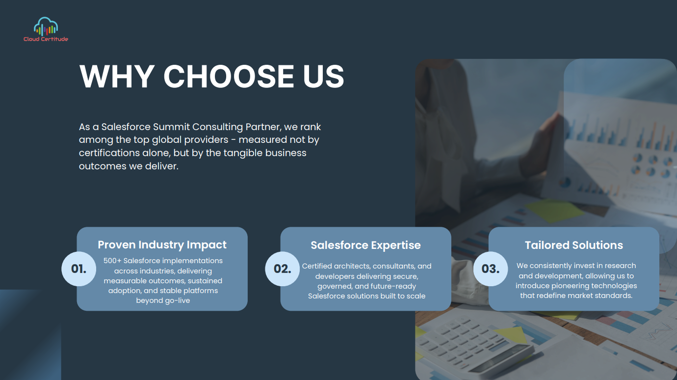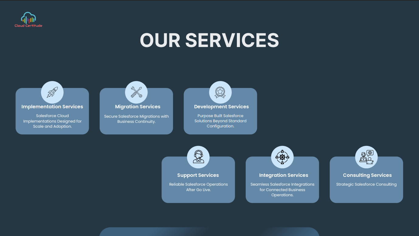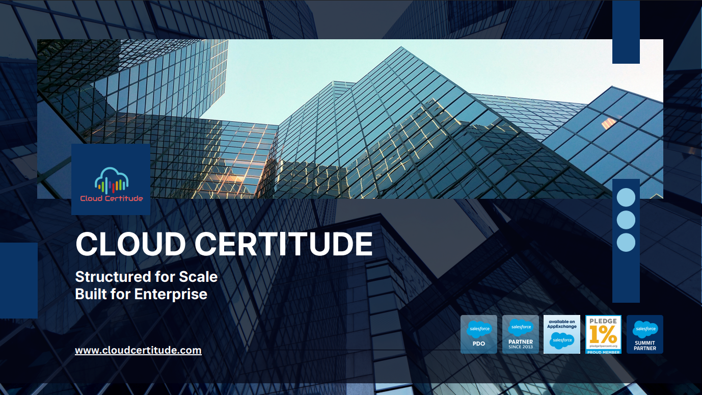 About Cloud Certitude ####Cloud Certitude an emerging consulting company working as customer engagement specialists, with experts to design and build strategies, operating models, cloud architecture, Salesforce.com, and mobile apps, etc. We as a Salesforce Alliance Partner and ISV services offer clients to transform their business through an effective journey. We have completed multiple engagements helping clients develop, customize and integrate a wide range of solutions.####We as a team at Cloud Certitude have been emphasizing and providing complete satisfaction to our clients globally since 2013.####As one of the top consulting firms, our main focus is to provide a total transformation of the organization by various means like building competitive advantage, driving bottom-line impact, etc.