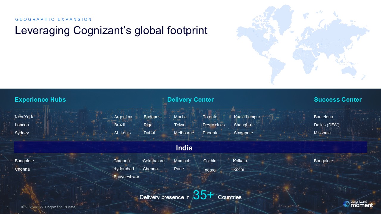 About Cognizant Technology Solutions We’re a global leader in business and technology services, helping our clients bring the future of work to life—today.####Cognizant (NASDAQ-100: CTSH) is one of the world's leading professional services companies, transforming clients' business, operating and technology models for the digital era. Our unique industry-based, consultative approach helps clients envision, build and run more innovative and efficient businesses. Headquartered in the U.S., Cognizant is ranked 205 on the Fortune 500 and is consistently listed among the most admired companies in the world. Learn how Cognizant helps clients lead with digital at www.cognizant.com or follow us @Cognizant.