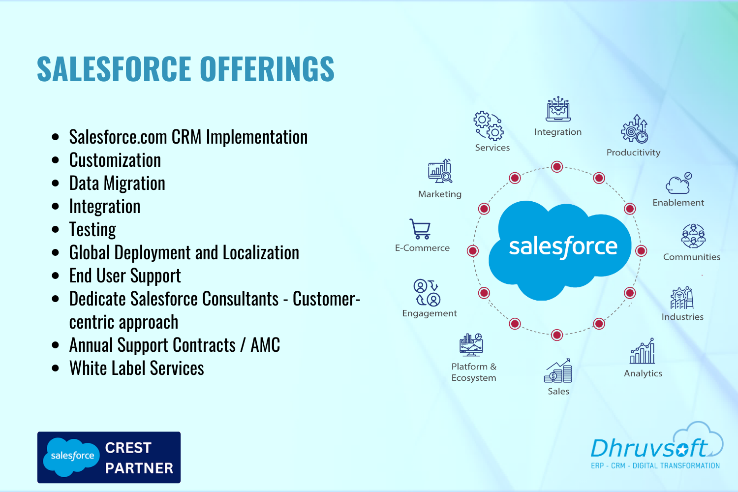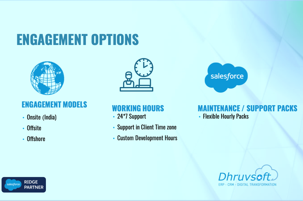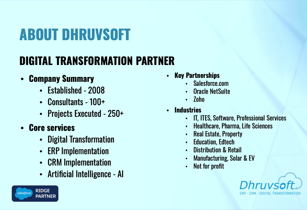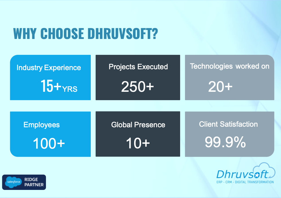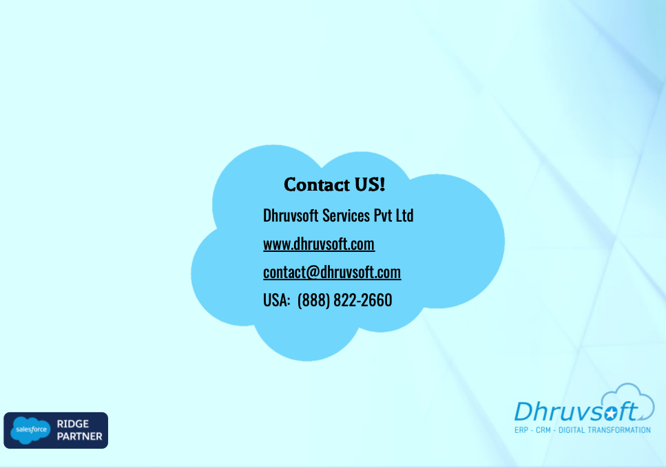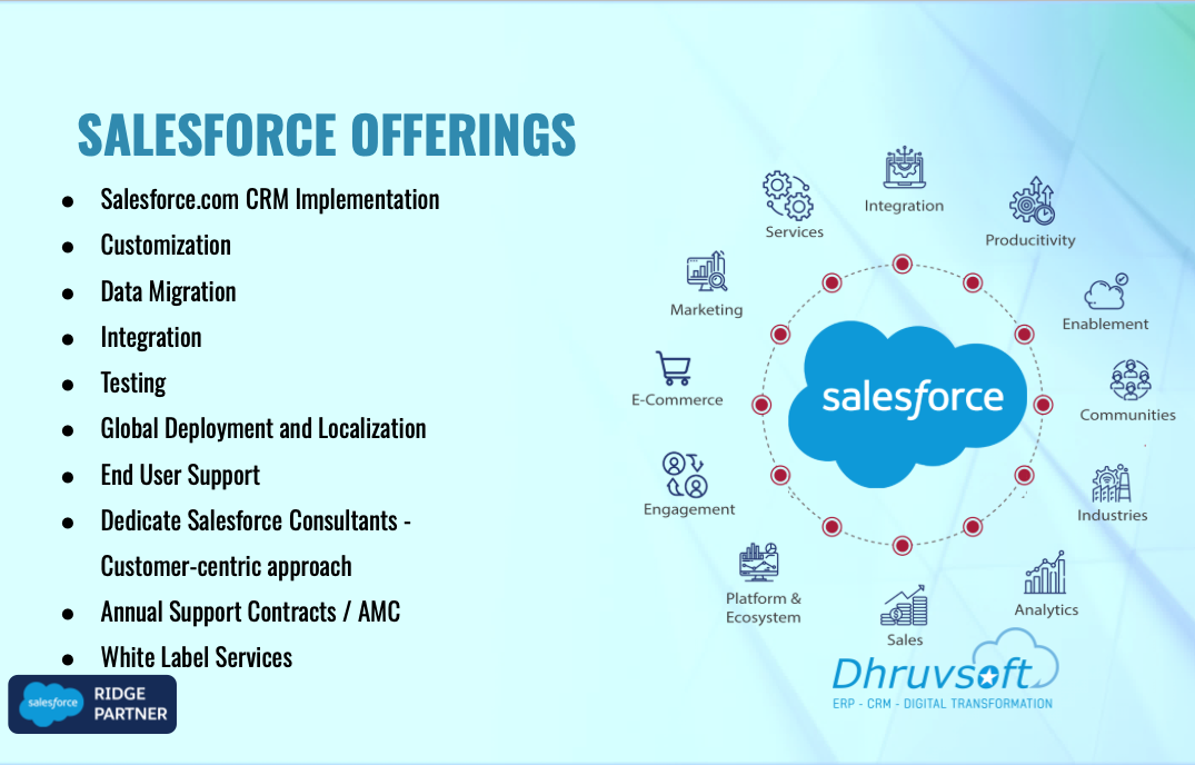 Dhruvsoft delivers business process consulting, implementation, application development integration, Force.com, Sites, AppExchange deployment, change management, Salesforce.com Administration and training services.