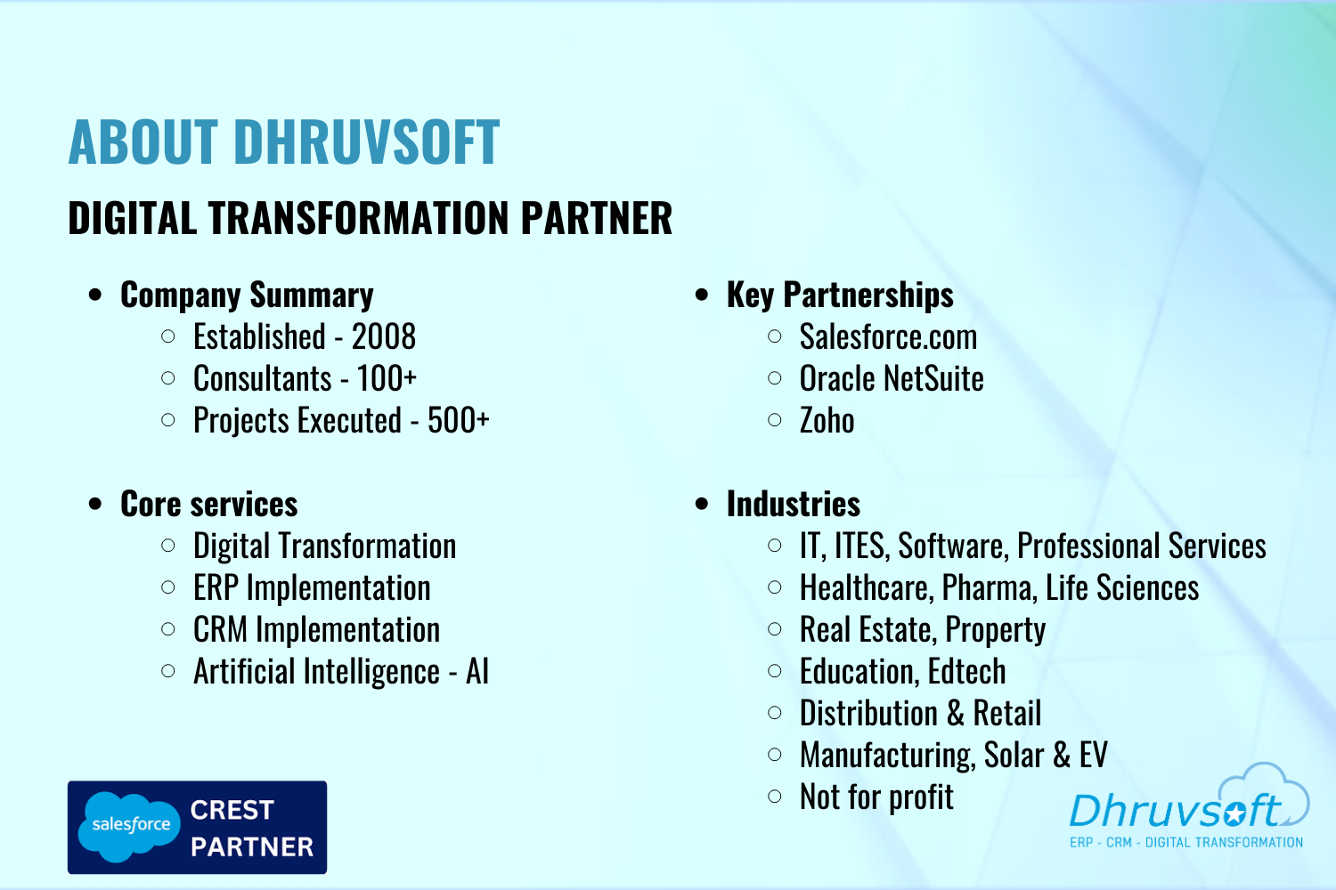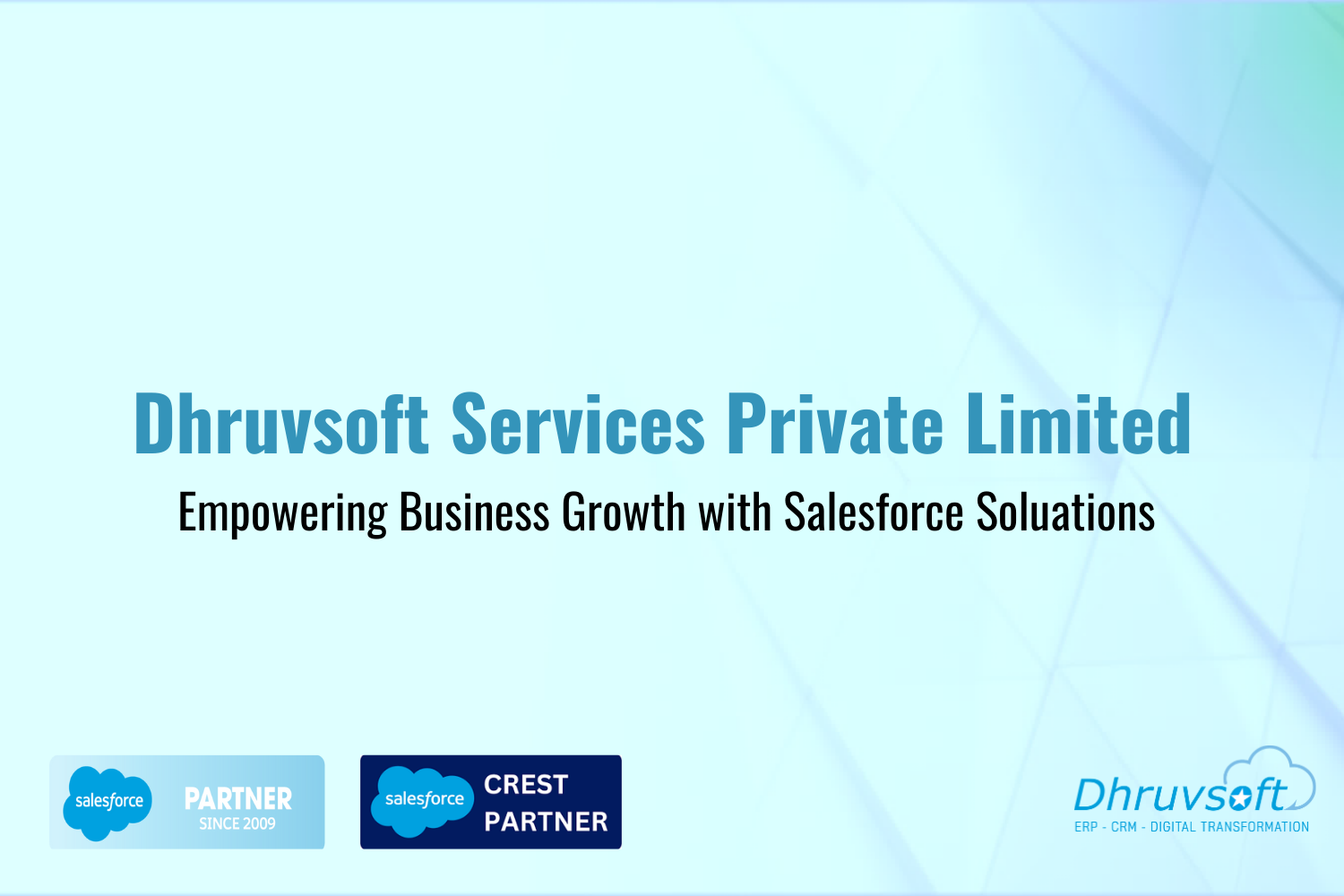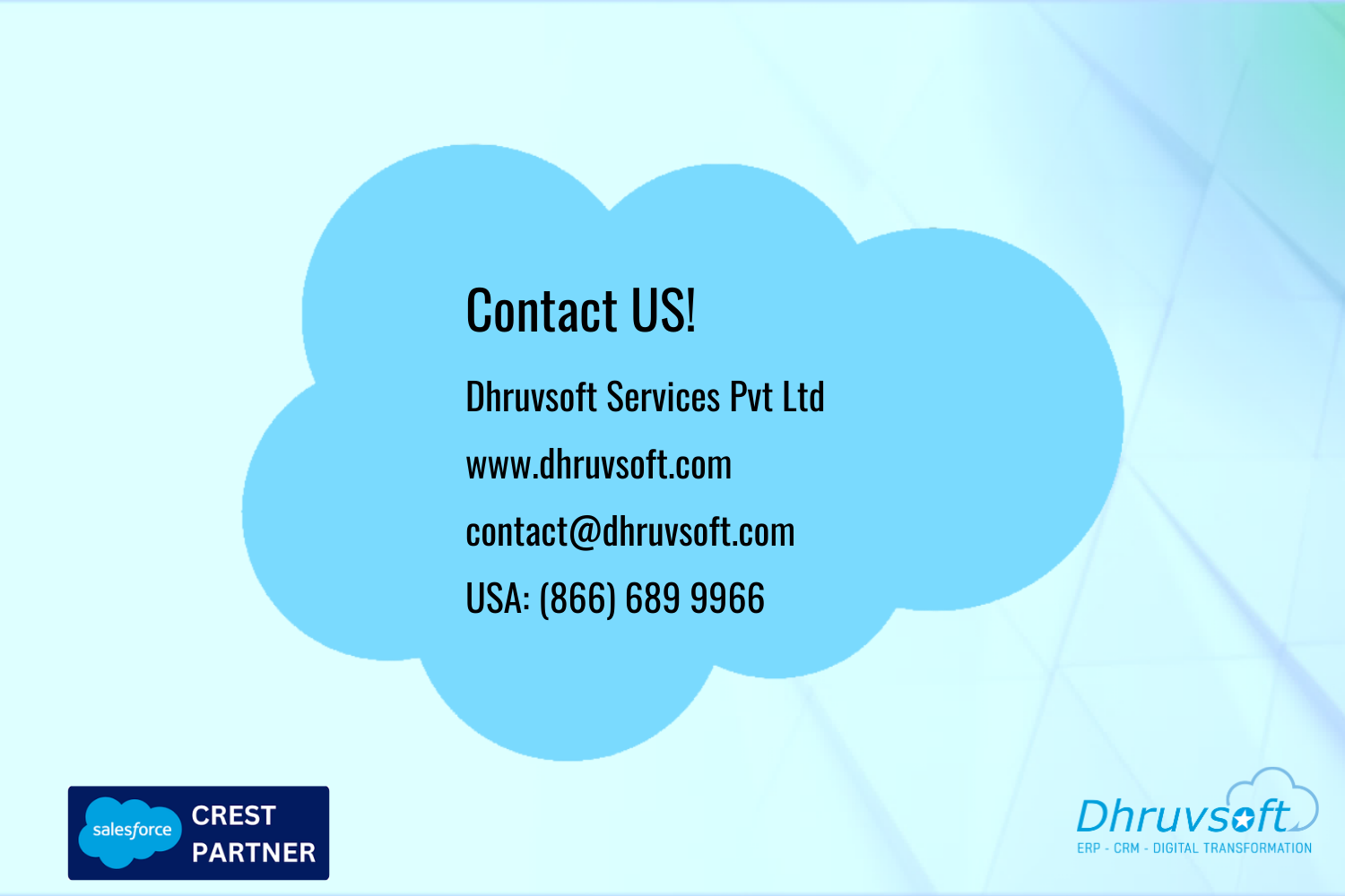Dhruvsoft delivers business process consulting, implementation, application development integration, Force.com, Sites, AppExchange deployment, change management, Salesforce.com Administration and training services.