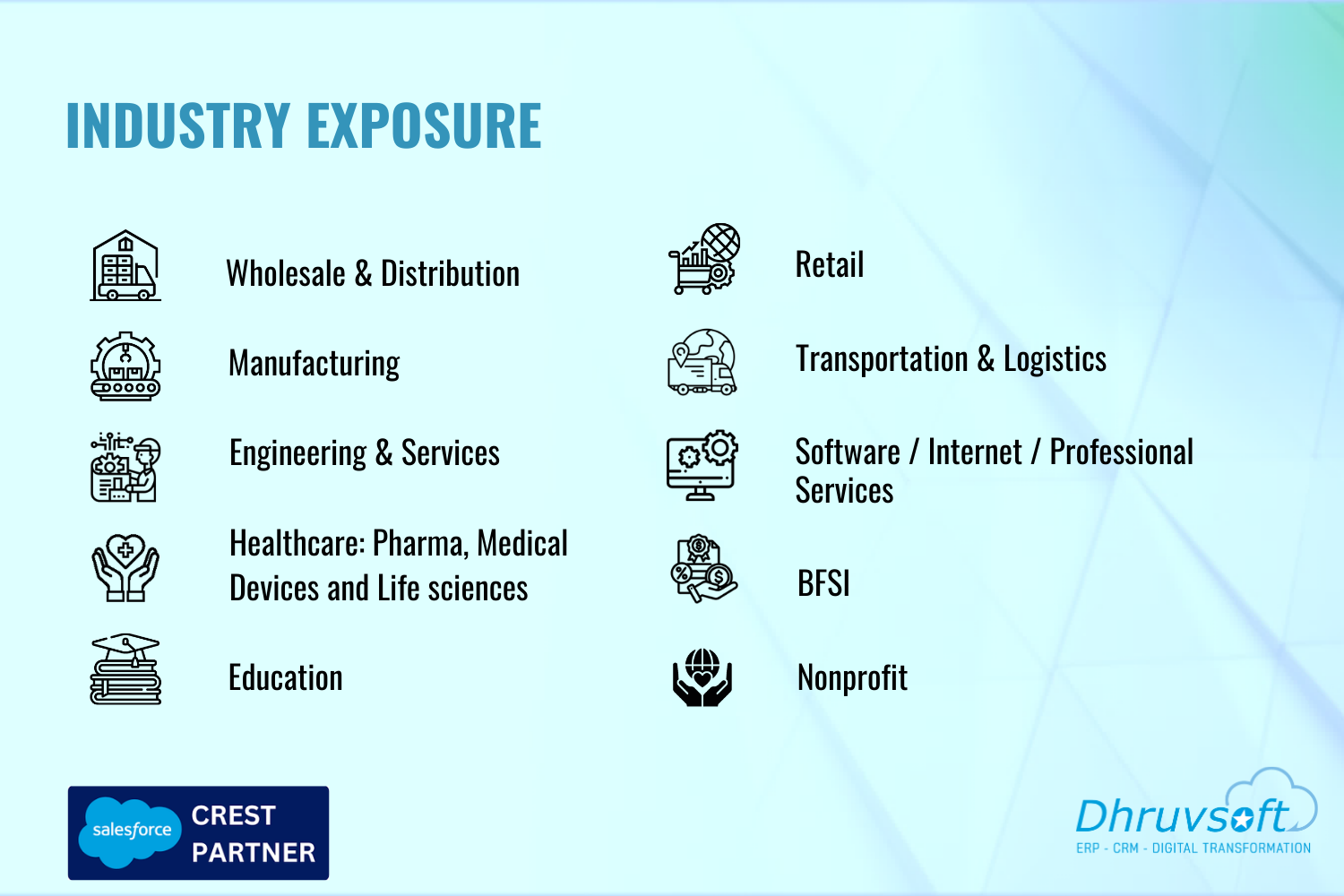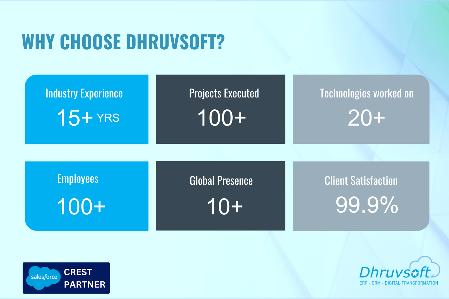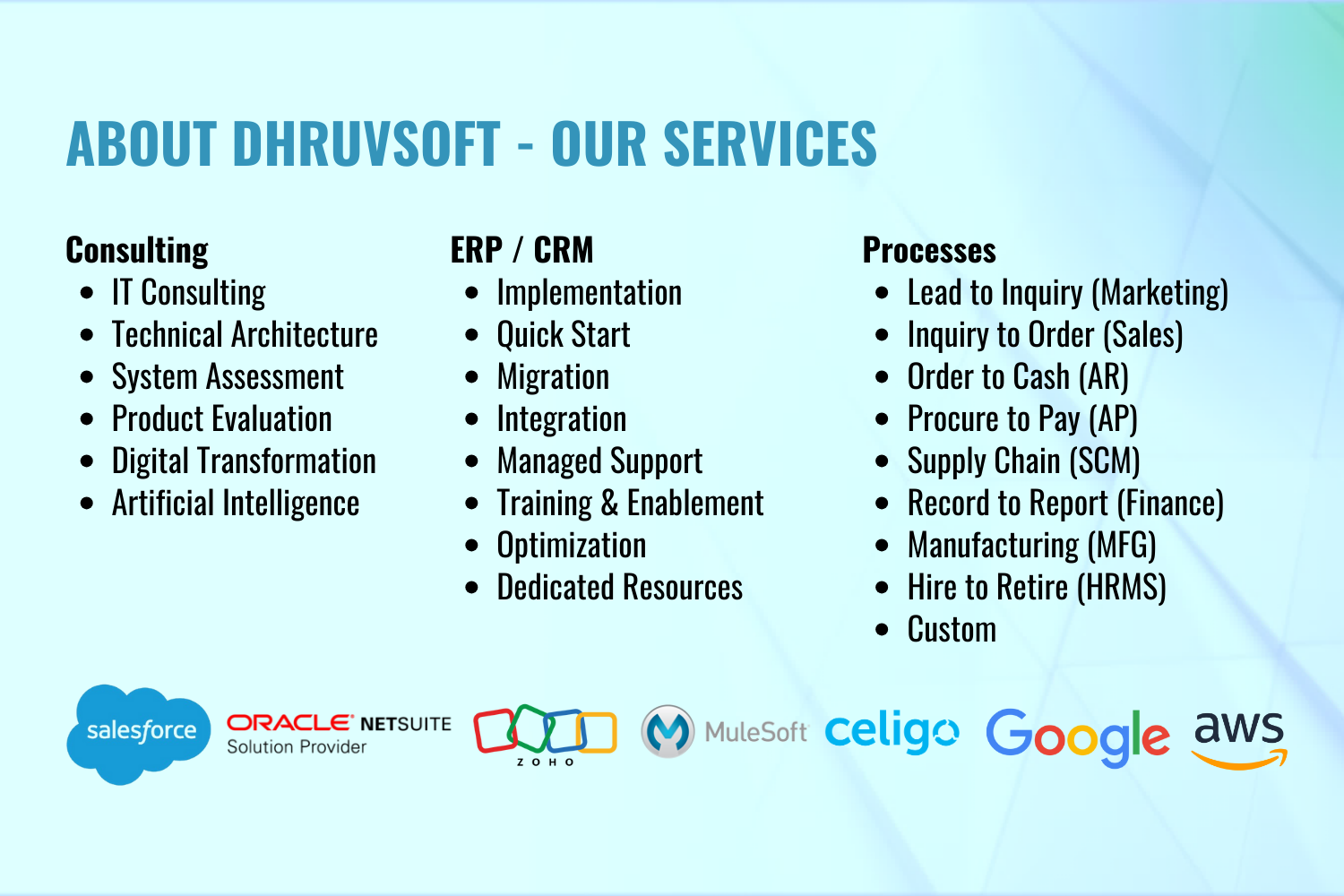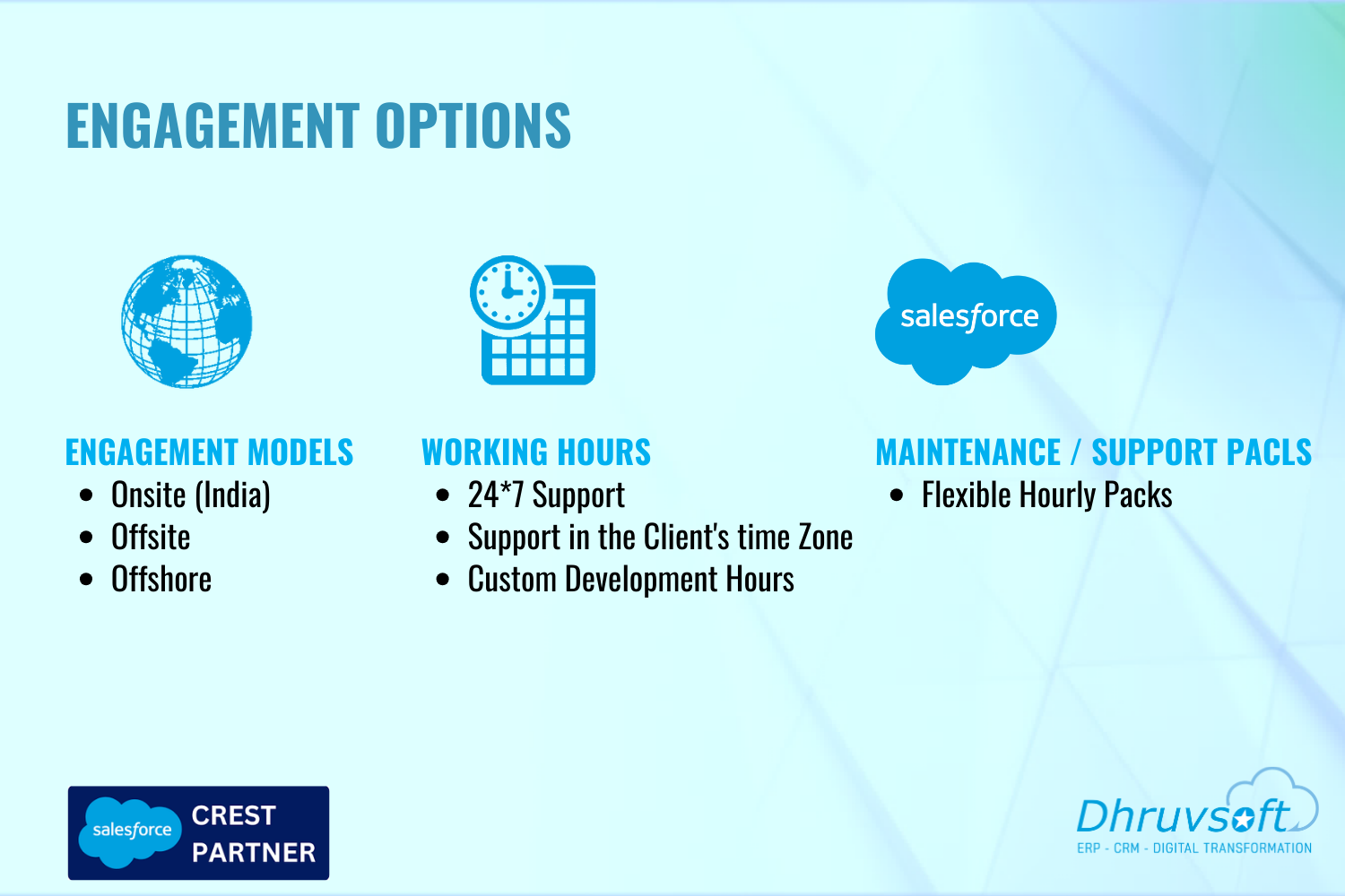Dhruvsoft delivers business process consulting, implementation, application development integration, Force.com, Sites, AppExchange deployment, change management, Salesforce.com Administration and training services.