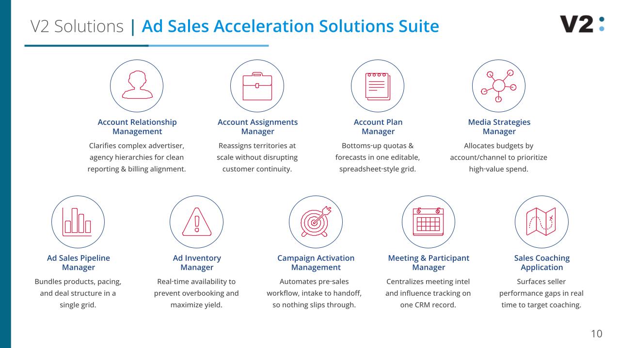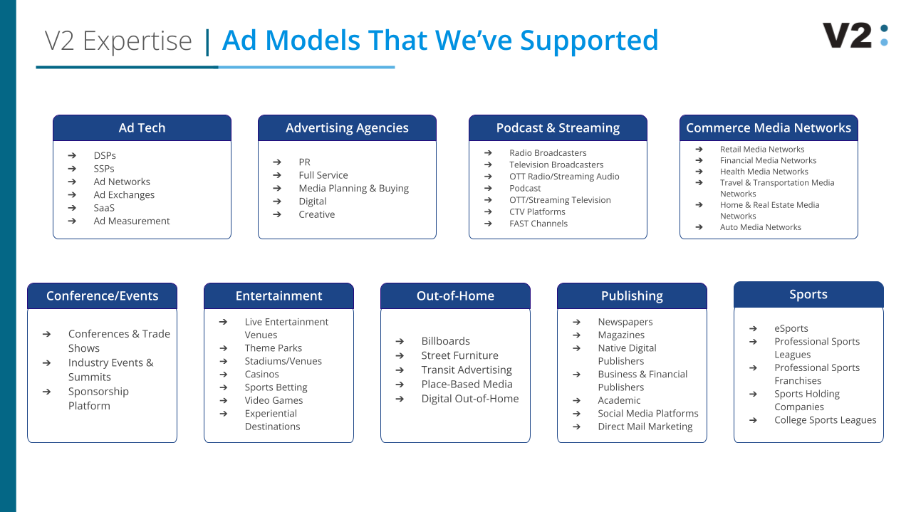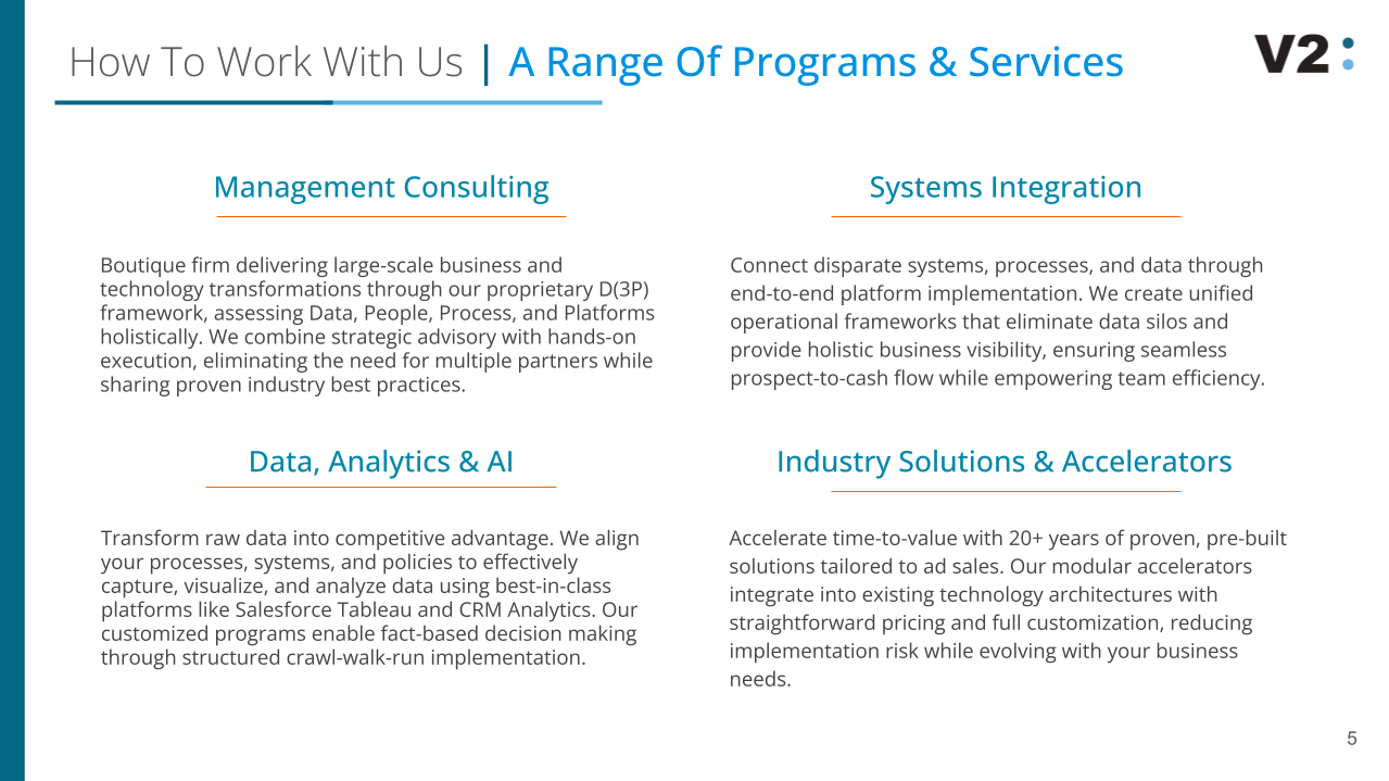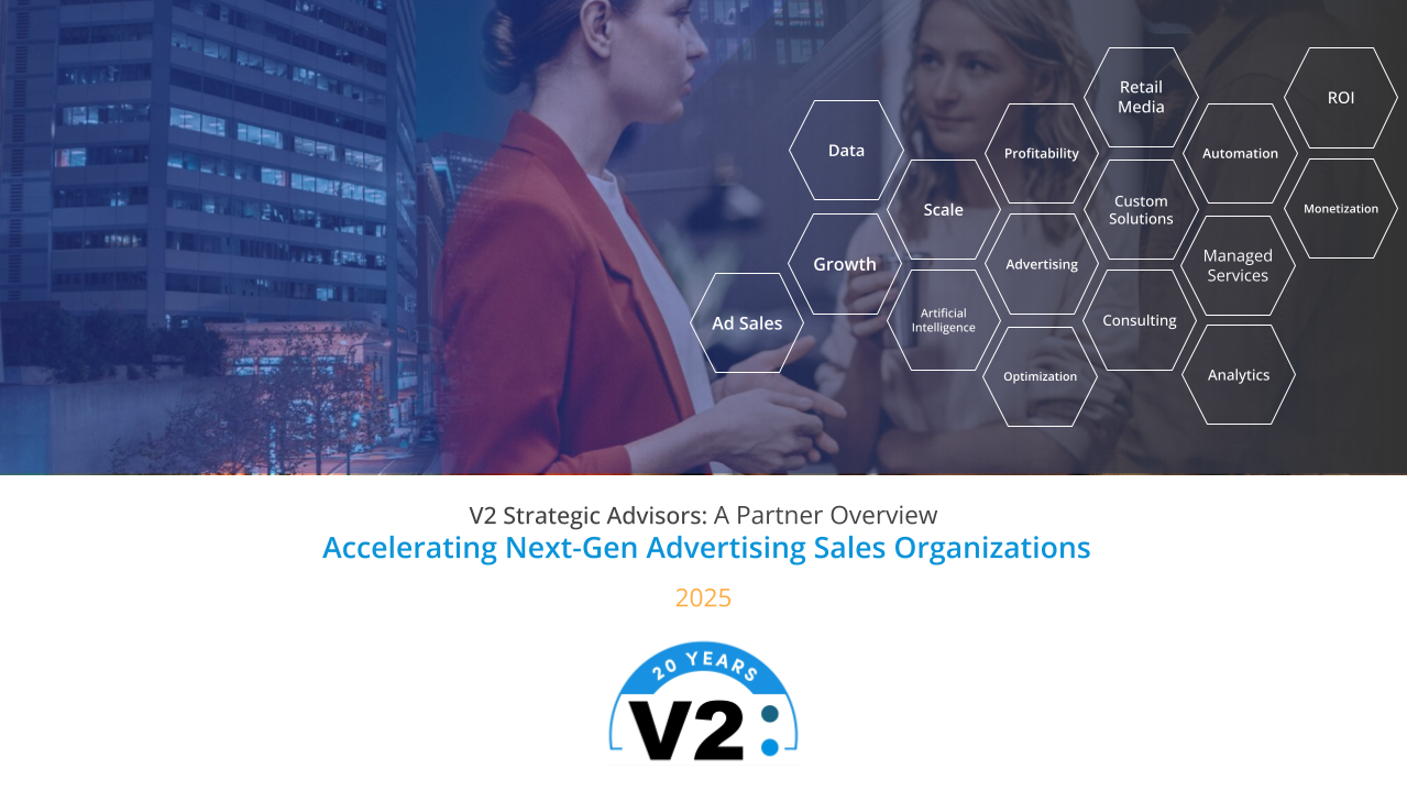 V2 accelerates next-generation ad sales through a unique blend of services and solutions spanning management consulting, data & analytics, AI consulting, system integrations, and industry solutions & accelerators.