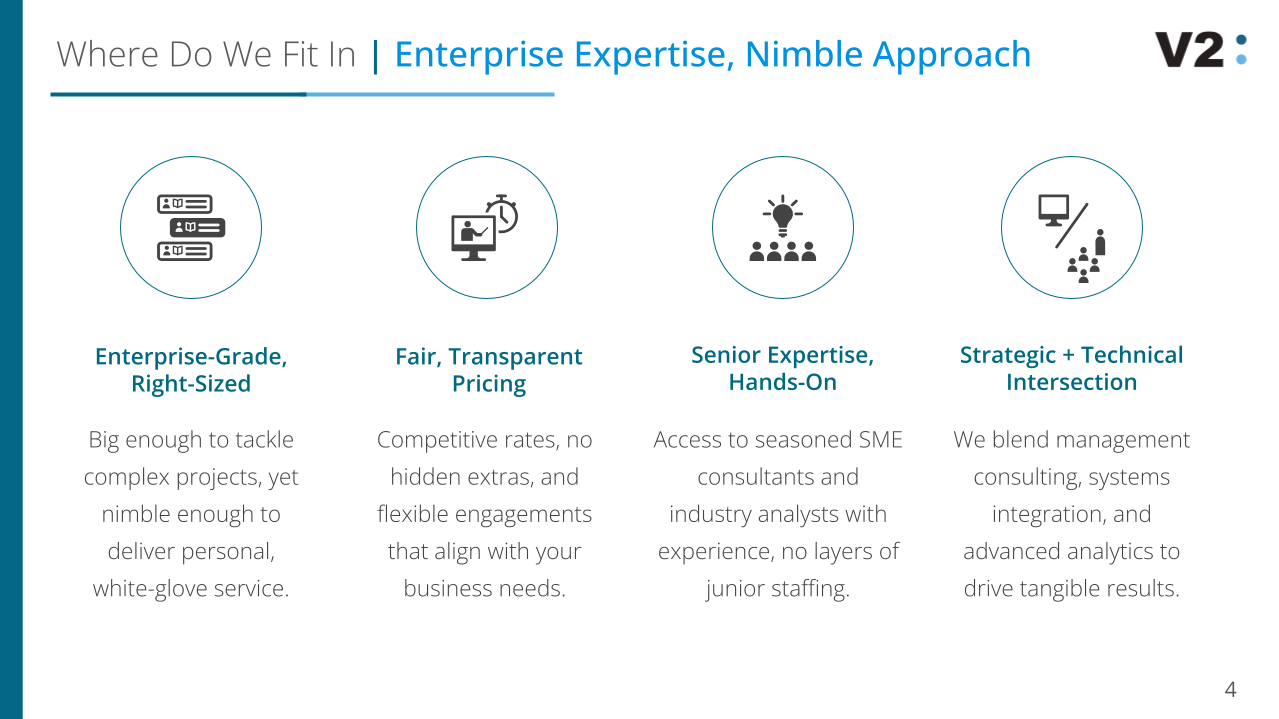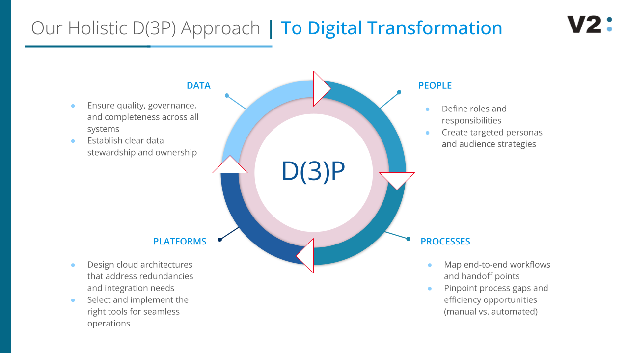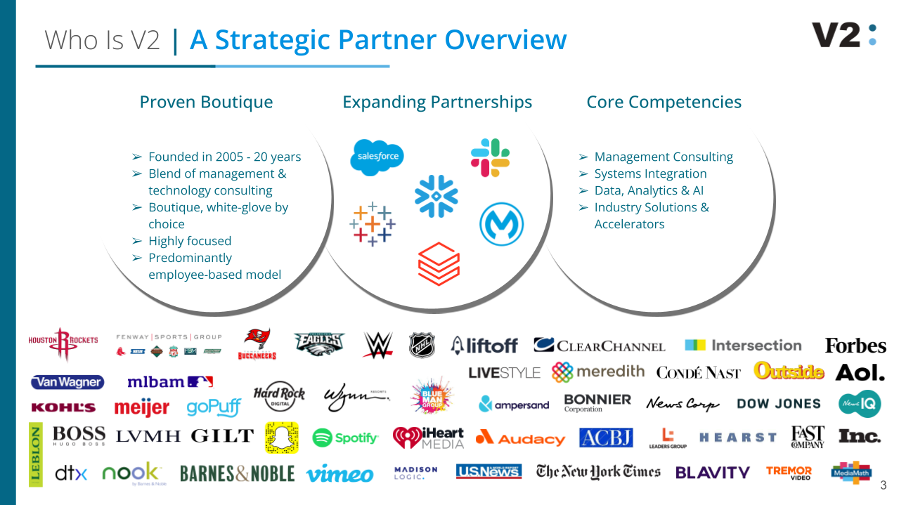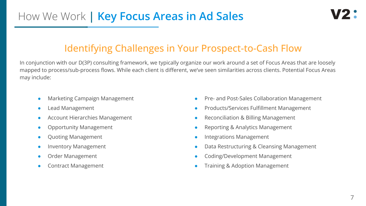 V2 accelerates next-generation ad sales through a unique blend of services and solutions spanning management consulting, data & analytics, AI consulting, system integrations, and industry solutions & accelerators.
