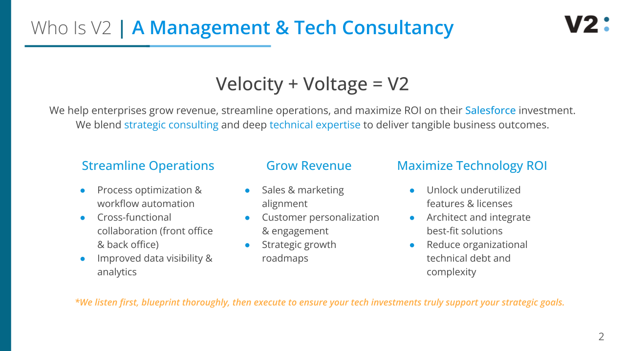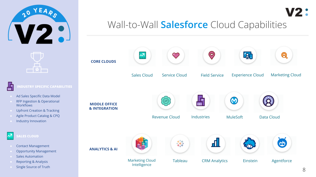 About V2 Strategic Advisors V2 Strategic Advisors is the partner brands choose when advertising revenue is mission‑critical. For two decades we have helped global media leaders, retail‑media networks, financial‑services innovators, and high‑growth disruptors transform how they sell, forecast, and scale ads on the Salesforce platform. Our work goes well beyond “standing up software.” We start with deep discovery, map revenue vision to operating reality, and then design Salesforce‑powered ecosystems that connect CRM with ad servers, OMS platforms, ERP, Snowflake, MuleSoft, and analytics—so teams can sell faster and make decisions on a single source of truth.####What sets us apart is a strategy‑first ethos backed by senior experts on every engagement. We marry proven ad‑sales playbooks with agile delivery, change‑management rigor, and relentless focus on measurable impact. The result is lower risk, rapid time‑to‑value, and solutions that continue to evolve as markets change.####If your organization monetizes attention—whether through traditional media, retail media, or emerging channels—V2 brings the experience and technical precision to turn advertising ambition into scalable revenue.