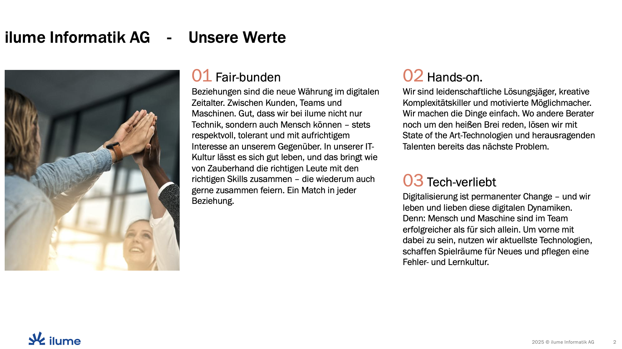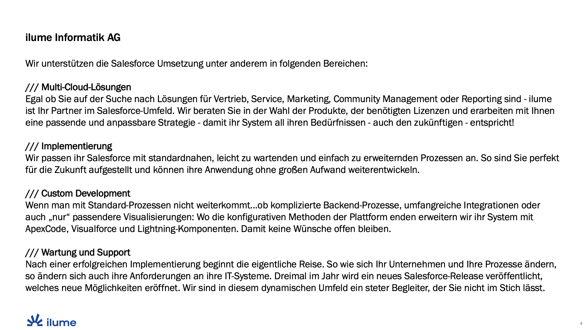 About ilume Informatik AG ilume is a smart salesforce.com Partner. We are focused in enabling our customers to digitalize processes alongside the entire business chains with salesforce.com as well as integration to other IT systems.