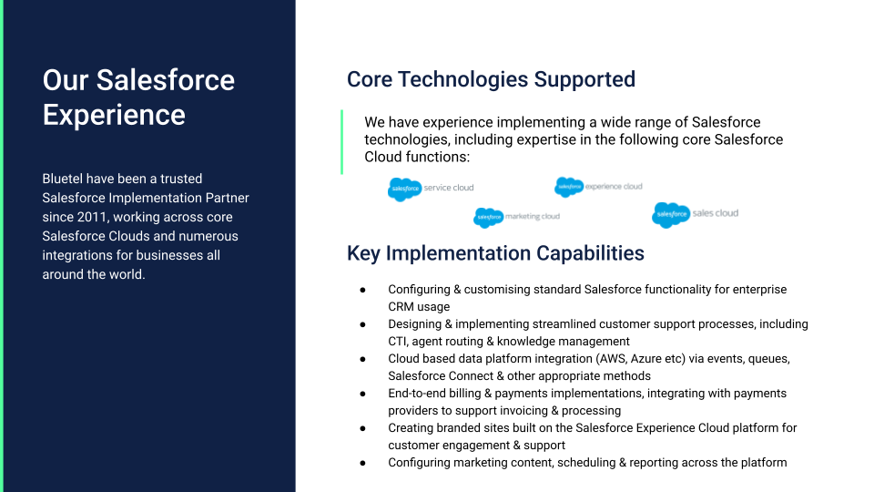 About Bluetel Solutions Ltd Bluetel has been implementing solutions in the Salesforce CRM platform since 2011 in a range of sectors and organisation sizes. Building on this experience, our teams are well-equipped to lead the discovery, design and implementation of well-architected Salesforce software solutions. ####Bluetel’s experience ranges across various Salesforce cloud products, with extensive knowledge of Sales Cloud, Service Cloud and Experience Cloud as well as expertise in AWS for integration with Salesforce. Bluetel focuses on bringing software engineering principles to Salesforce projects, along with strong attention to best practices.