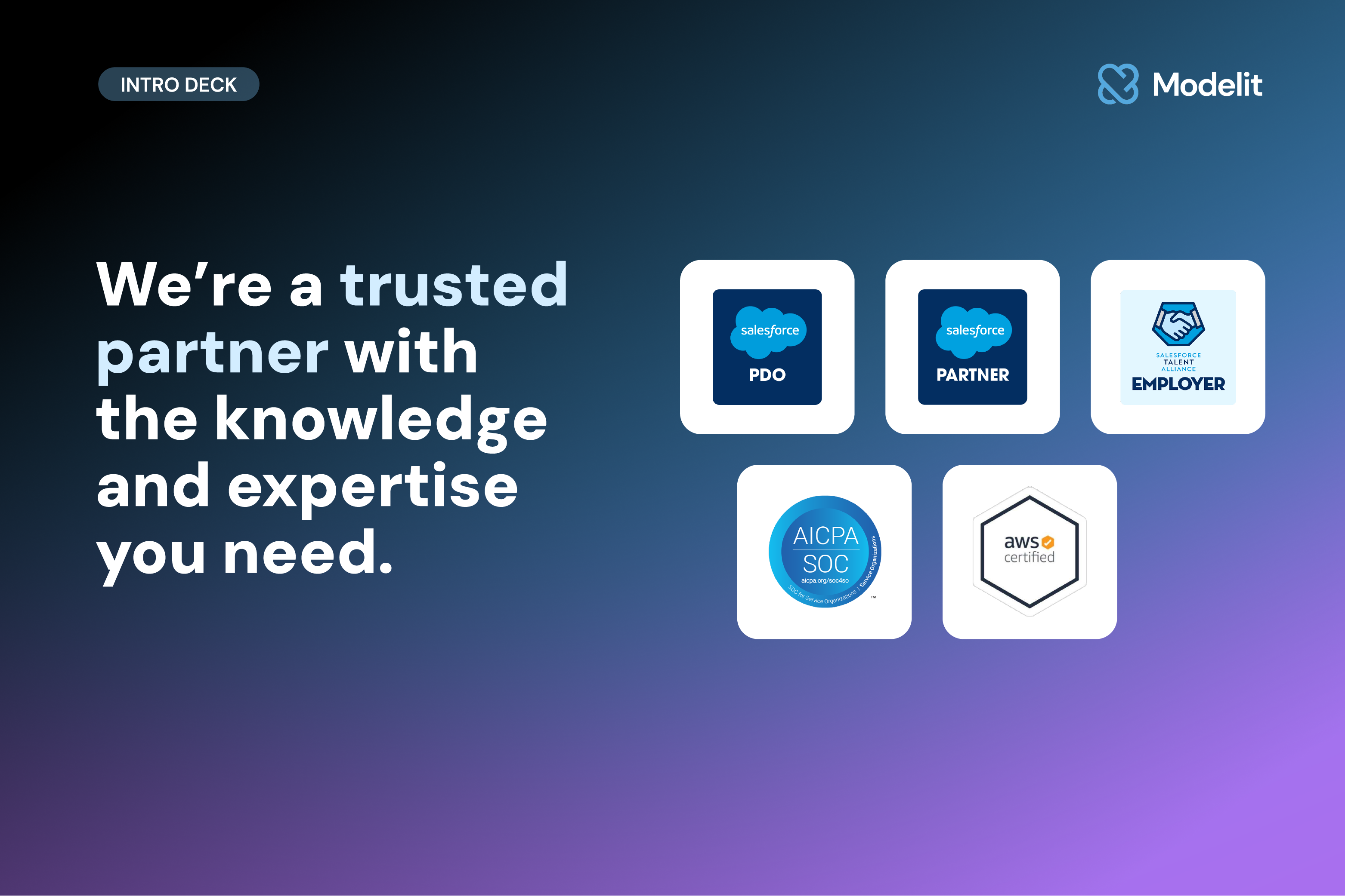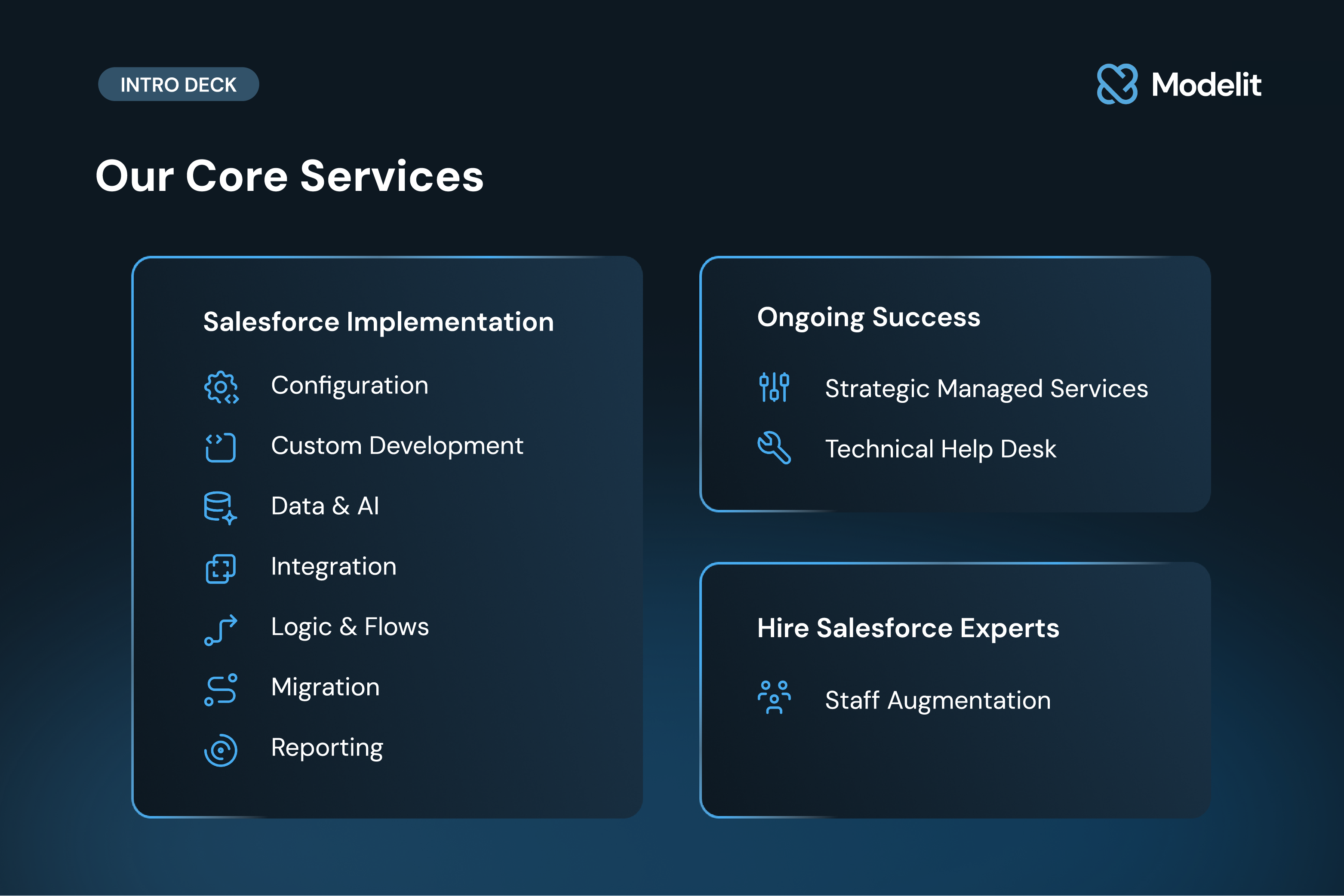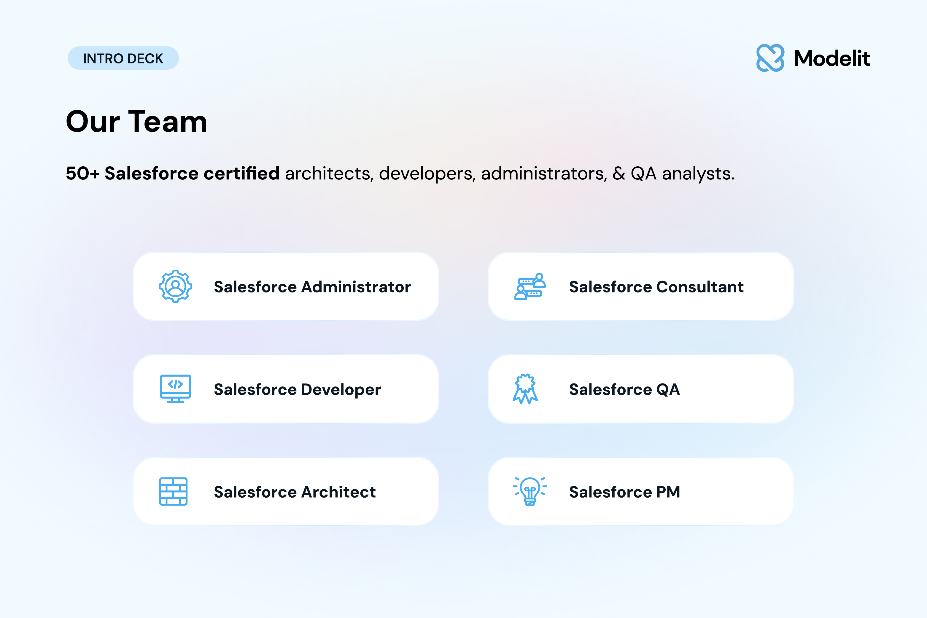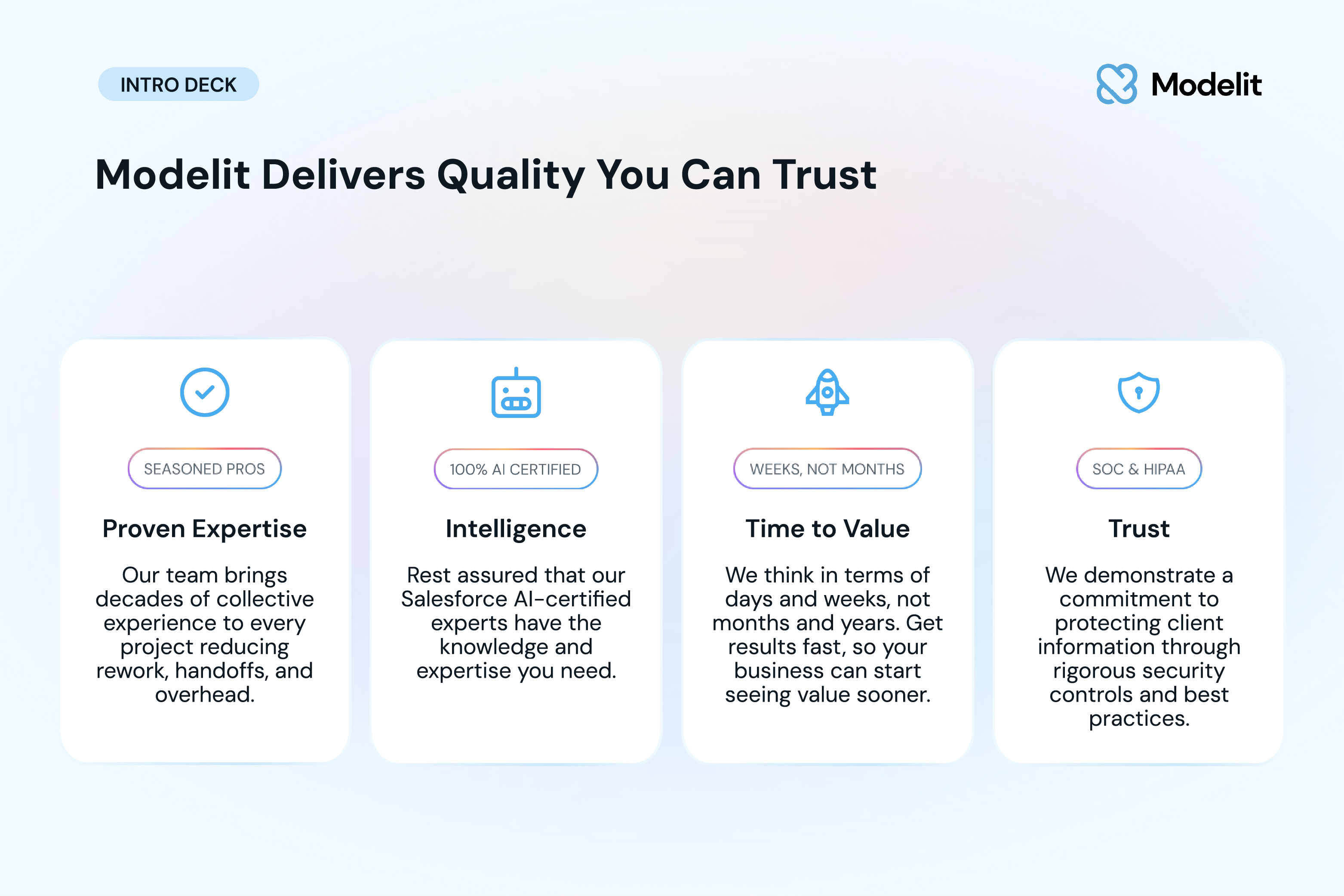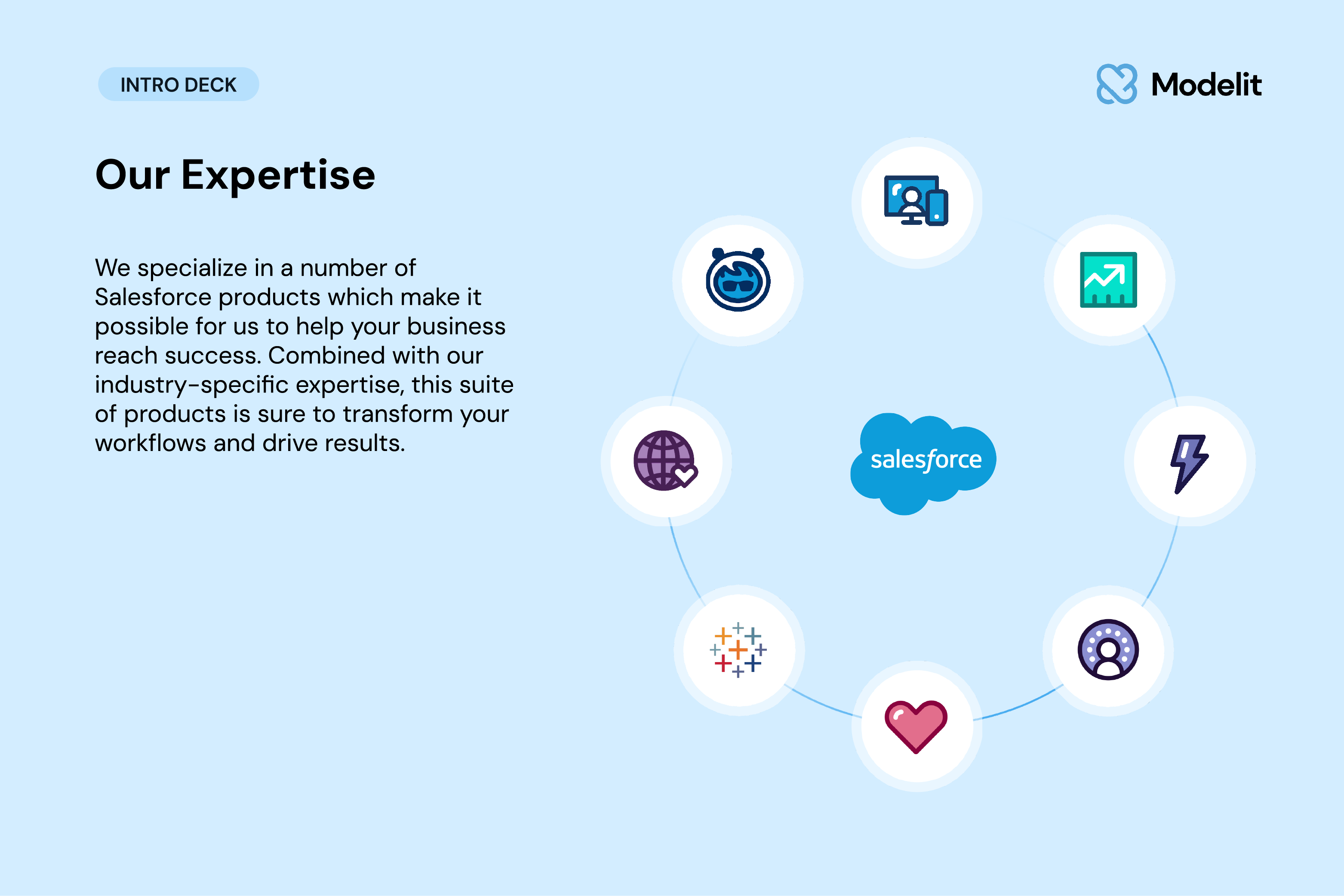 About Modelit Modelit is the key to working smarter and aiming higher with Salesforce. ##As an official Crest partner founded by certified platform experts, we help our customers with:##- Custom Development##- CRM Configuration##- AI Implementation##- AppExchange App Development.####Our experts help companies maximize their Salesforce investment through aligned customer experiences, faster time-to-market, and a lower total cost of engagement. We focus on time to value measured in weeks, not months, so organizations see results quickly.####Being SOC 2 Type II and HIPAA compliant means that Modelit is committed to following rigorous security, privacy, and operational best practices. As a 100% AI-certified team, we bring the intelligence and expertise needed to design secure, scalable, and future-ready Salesforce solutions.