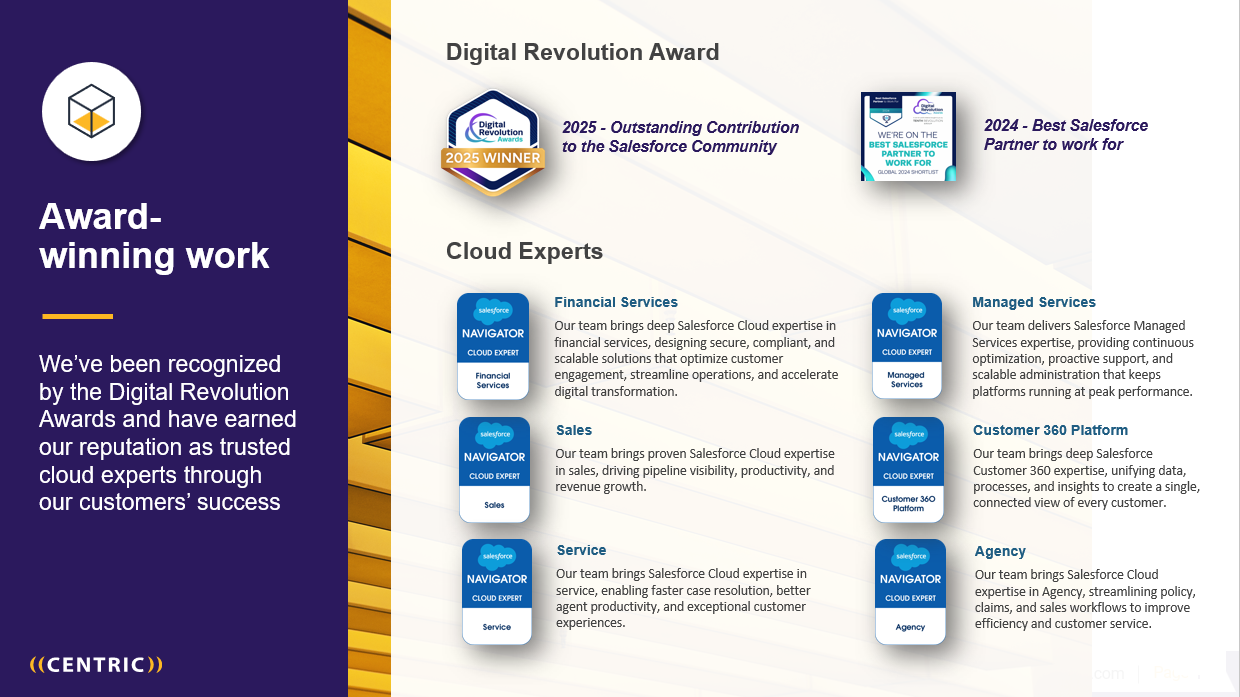 Centric Consulting provides business-aligned solutions across the Salesforce product suite, including Sales Cloud, Service Cloud, Marketing Cloud and more. We partner with you to drive successful business outcomes and ROI on your Salesforce investment.