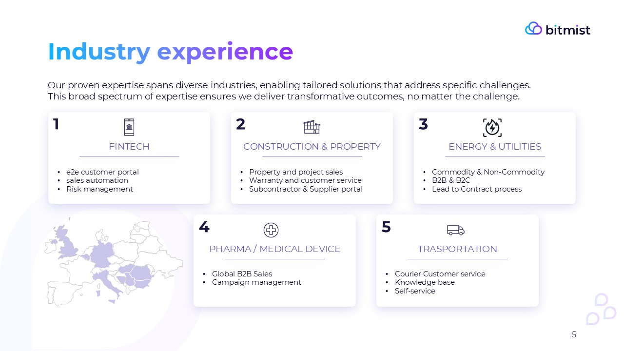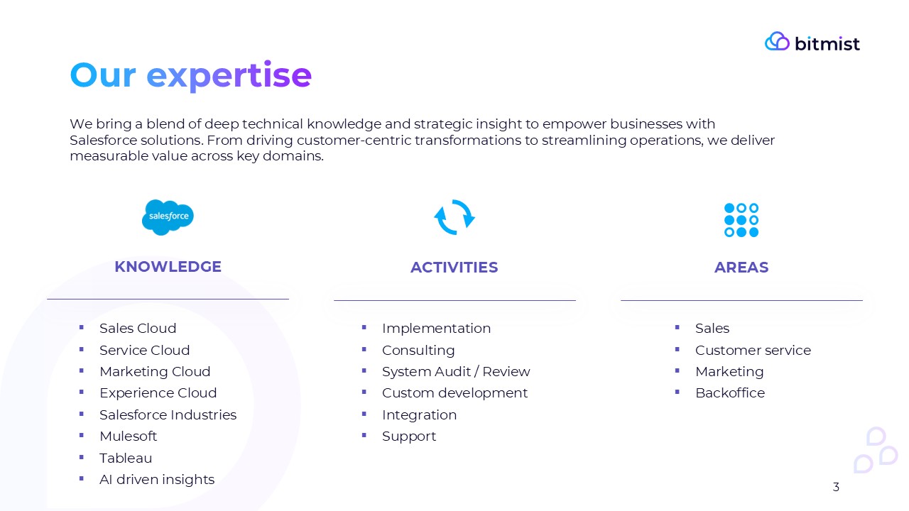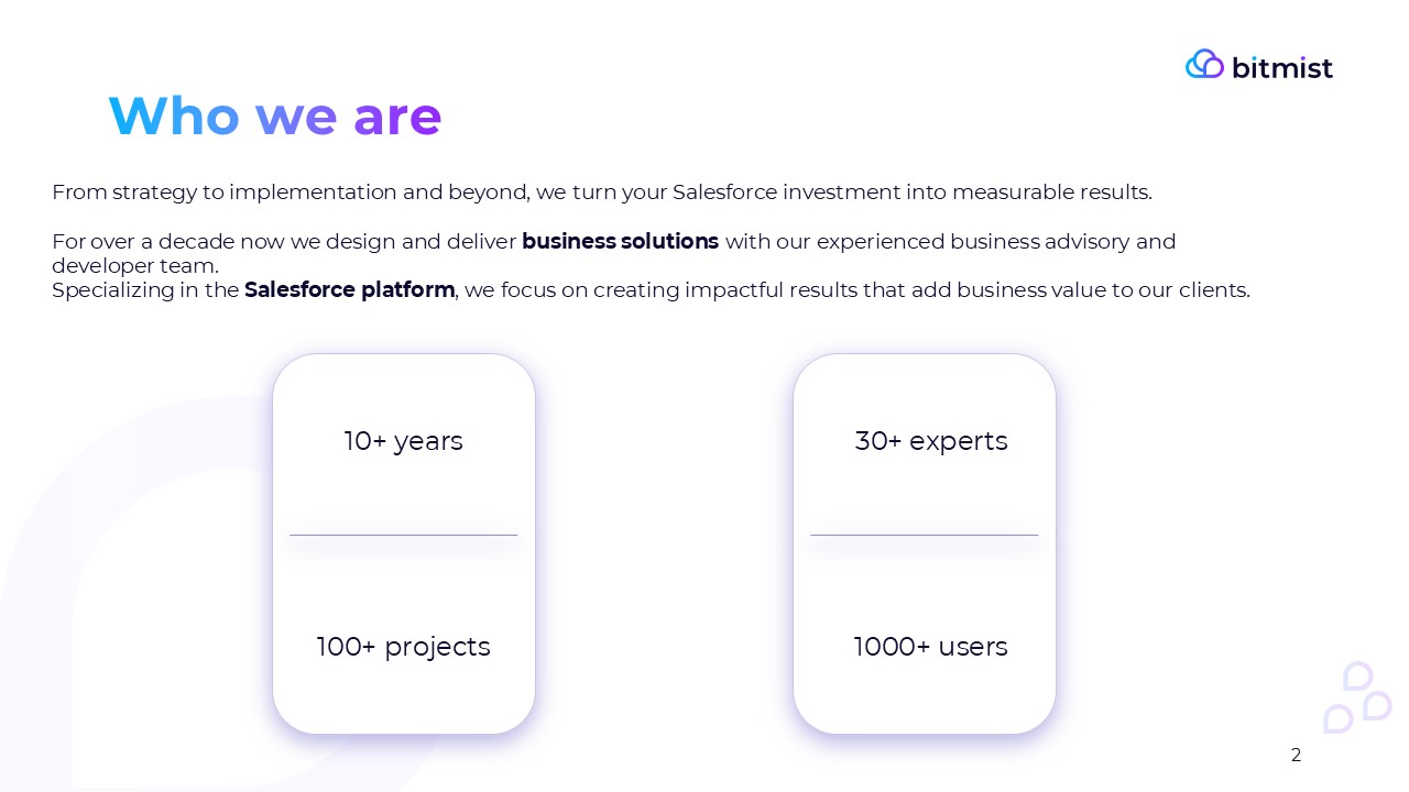 About Bitmist Consulting Kft We founded our company to serve growth-conscious startups and established businesses seeking the highest standards in a technology partner. Bringing years of international experience to the market, ####Bitmist has provided exemplary Salesforce and Cloud-based solutions and services in Hungary, the UK, and the CEE region since 2014.####We are a motivated, agile, delivery focused team of experts driven by a passion for excellence and powered by technology.####We are dedicated to our clients and demonstrate this through our responsiveness, competence, reliability, and honesty. Not only that, we are the only Hungarian company in a recognized partnership with both Salesforce and Microsoft.####We are a local partner with international experience. We’ve spent years working across multiple countries and cultures, and apply best practices from the most mature markets.