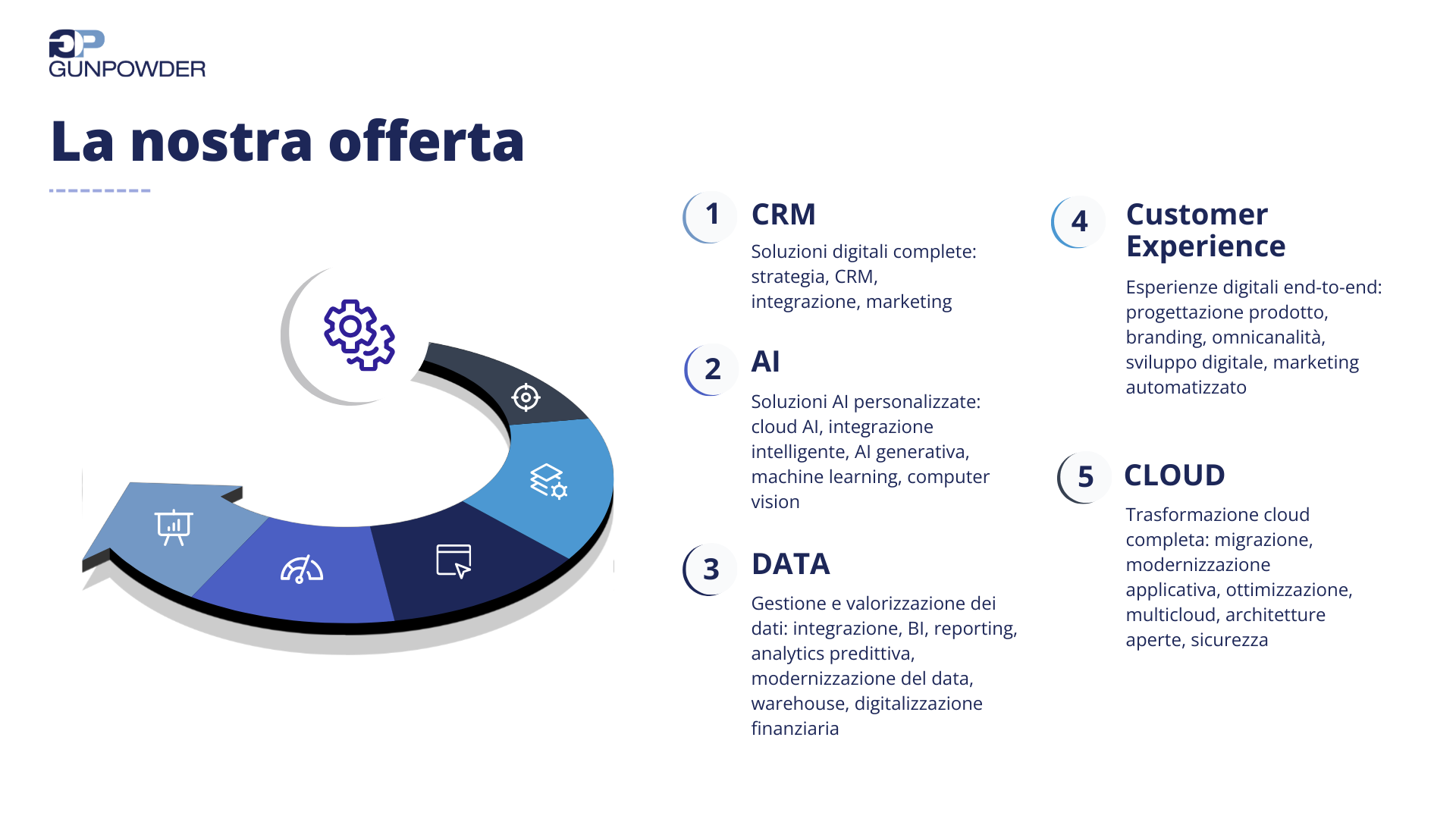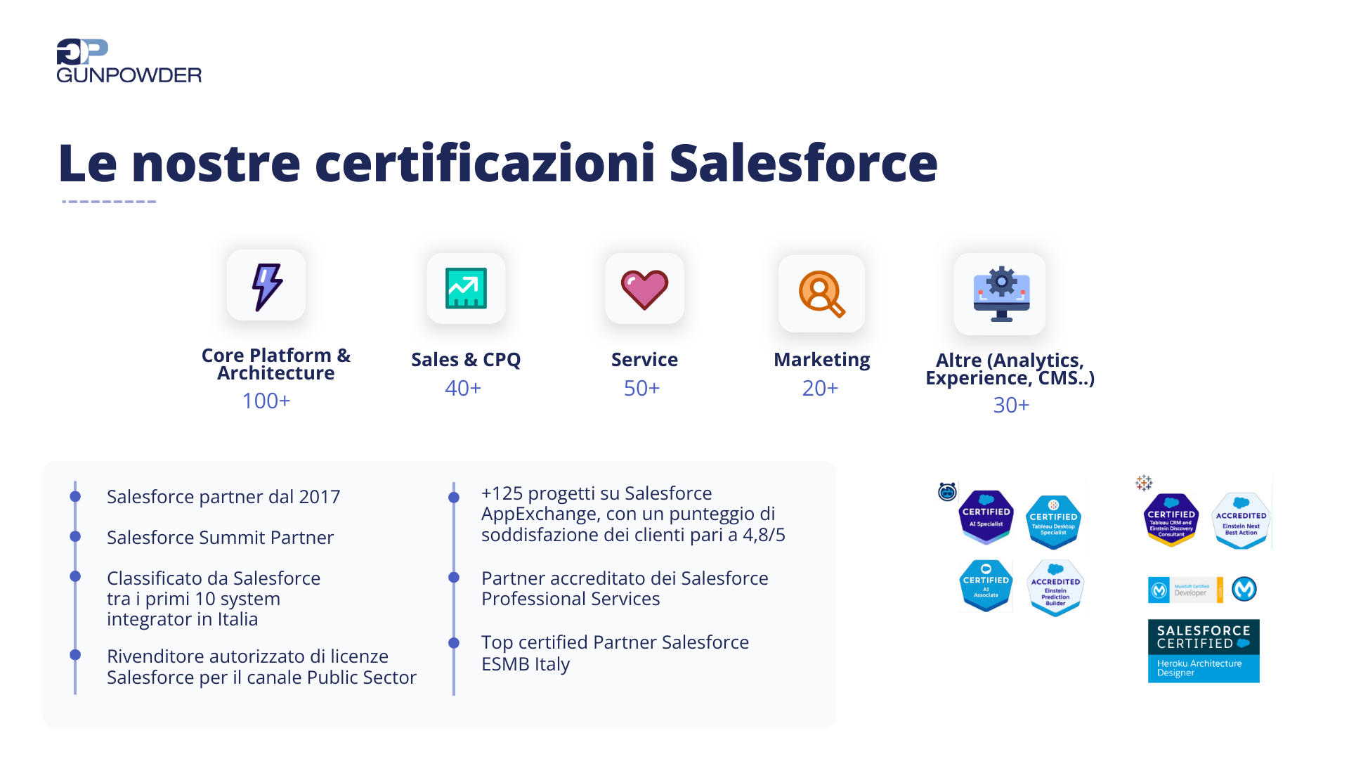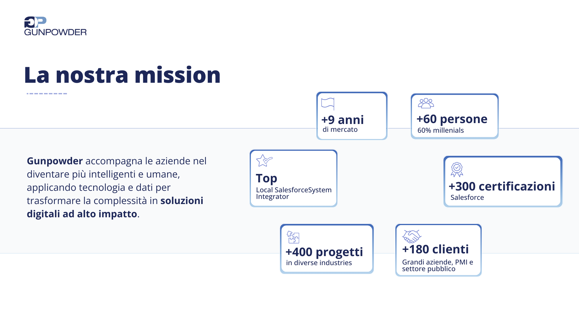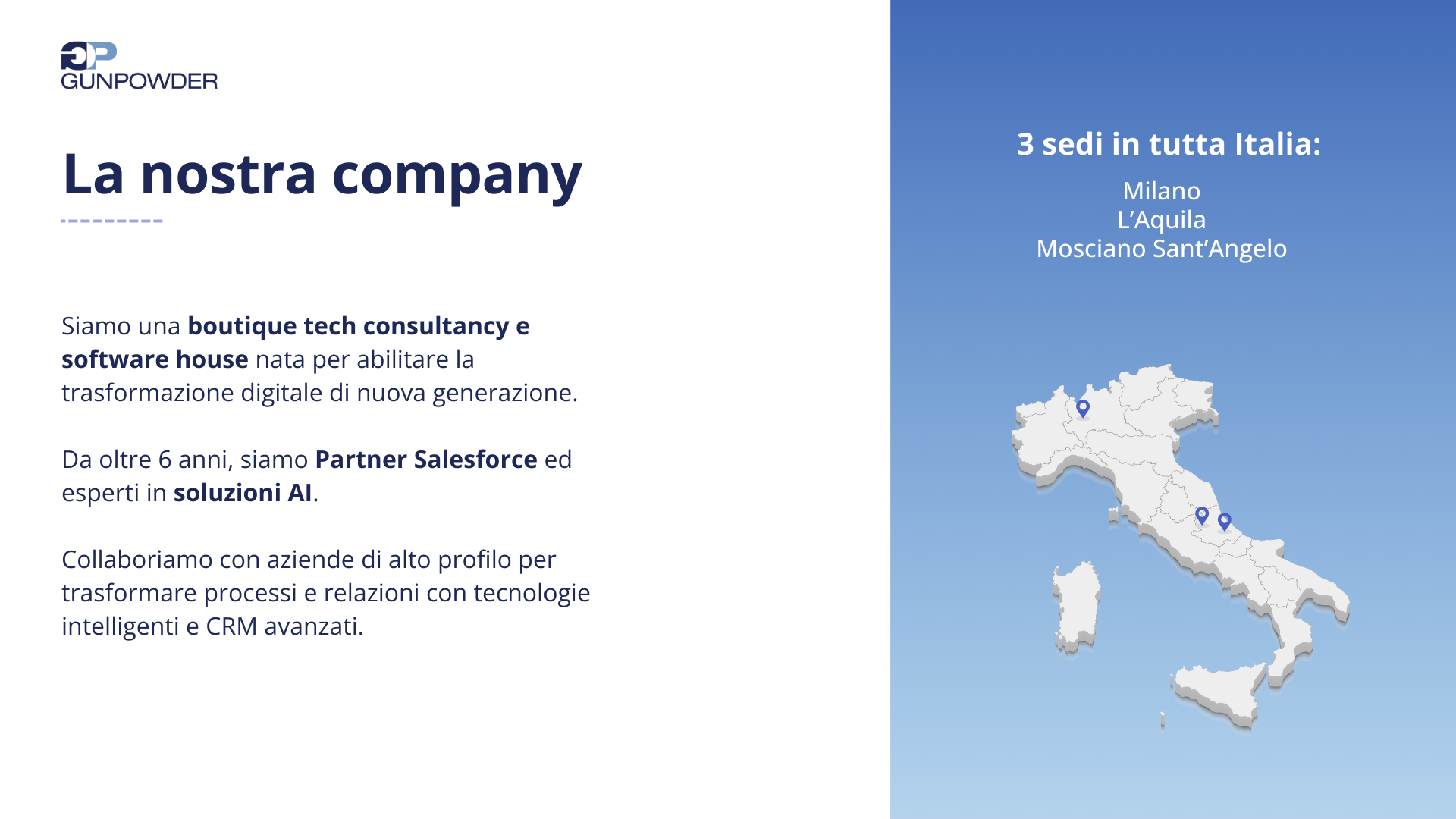 About GUNPOWDER SRL Siamo una boutique tech consultancy e software house nata per abilitare la trasformazione digitale di nuova generazione.## ##Da oltre 6 anni, siamo Partner Salesforce ed esperti in soluzioni AI.## ##Collaboriamo con aziende di alto profilo per trasformare processi e relazioni con tecnologie intelligenti e CRM avanzati.